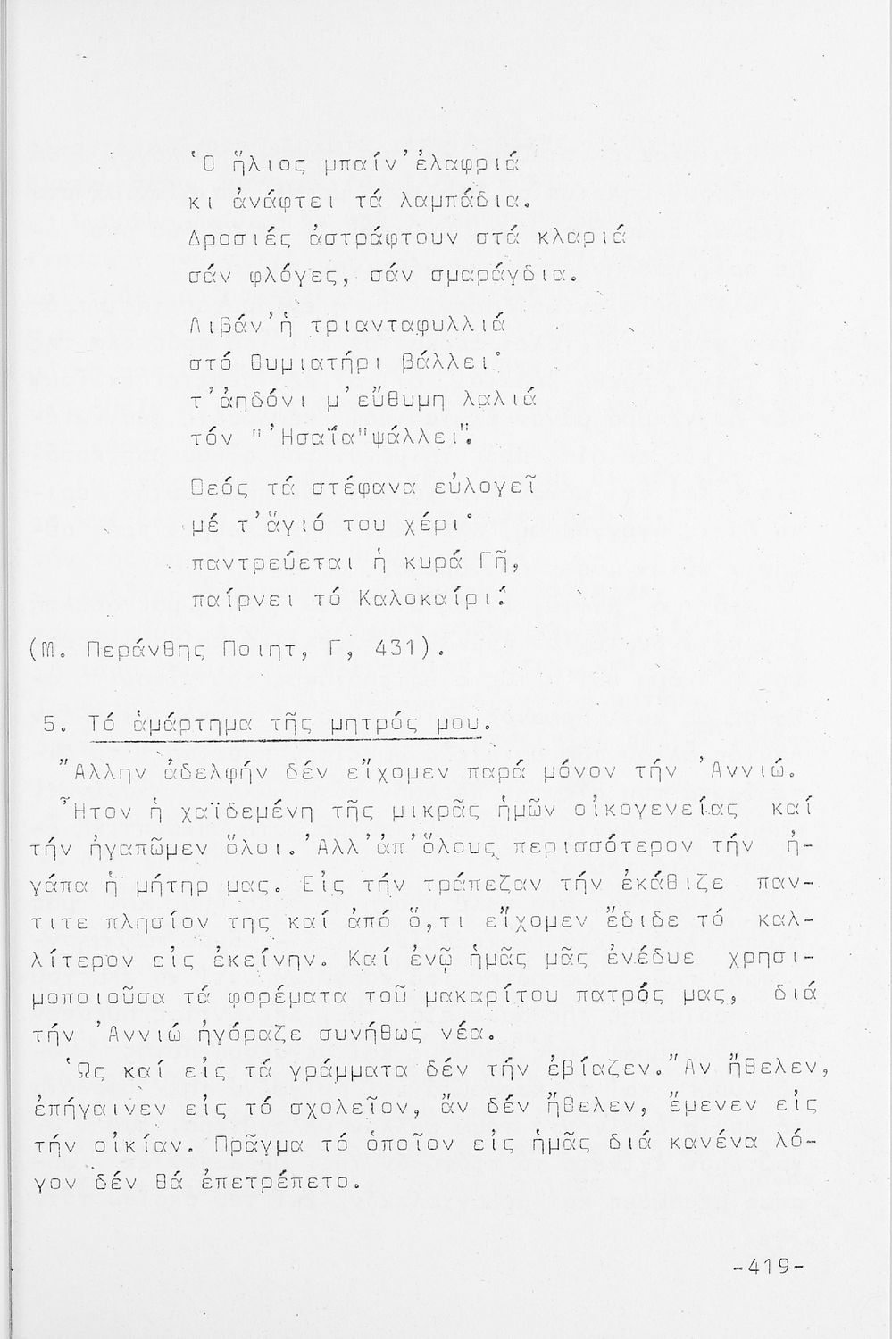 Σχολικό εγχειρίδιο Νέων Ελληνικών Γ΄ Γυμνασίου και Α' Αστικού Σχολείου που περιέχει πεζά και ποιήματα Ελλήνων συγγραφέων εμπνευσμένα από τη θρησκευτική και κοινωνική ζωή, την ελληνική μυθολογία, την αρχαία και