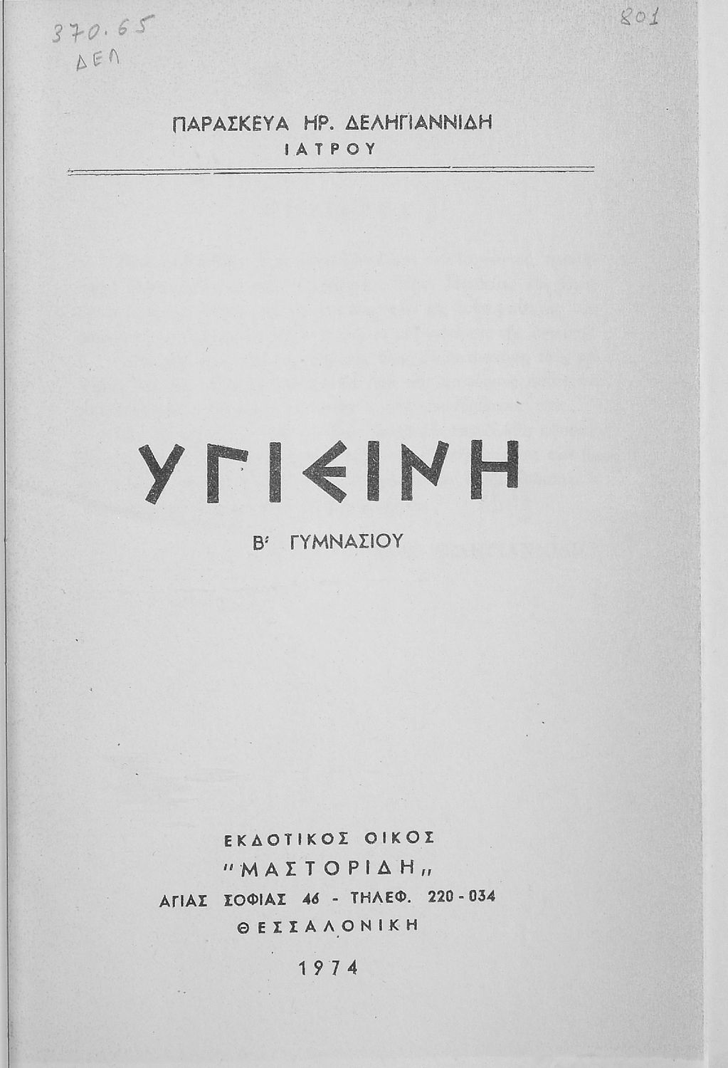 Κωδικός αναγνώρισης: 20-00801 Τίτλος: Υγιεινή Β΄ Γυμνασίου Συγγραφέας: Παρασκευάς Ηρ. Δεληγιαννίδης Μέγεθος και υπόστρωμα: Σχολικό εγχειρίδιο, 19εκ., σκληρό εξώφυλλο, 180 σελίδες. Σκίτσα (ασπρόμαυρα). |