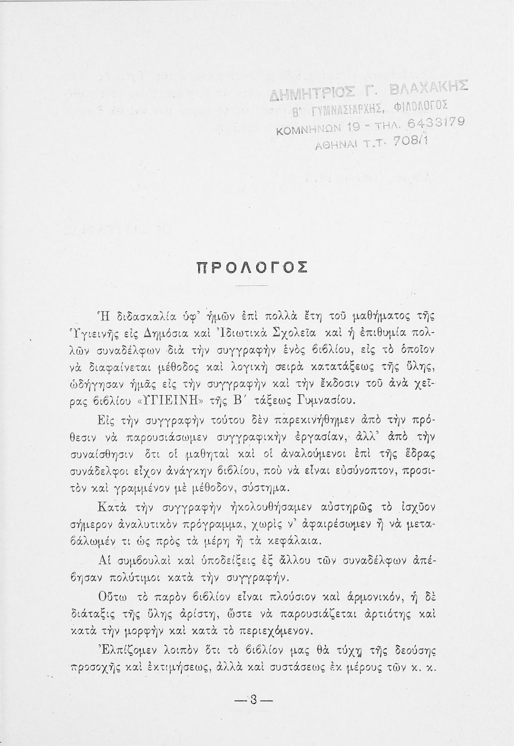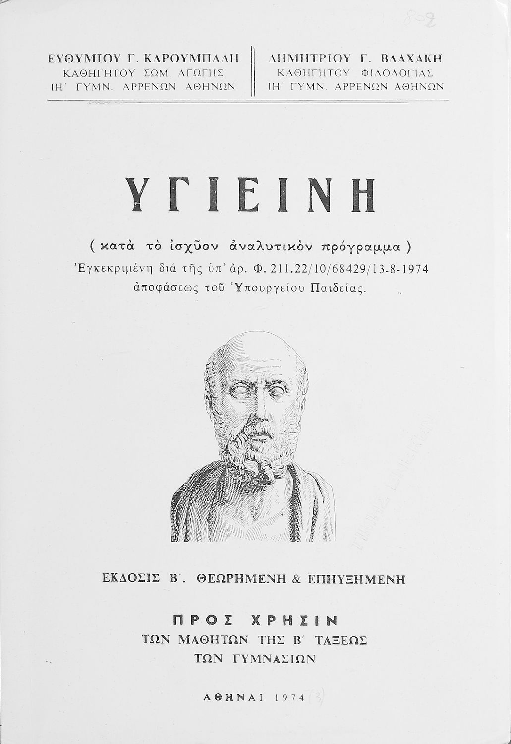 Κωδικός αναγνώρισης: 20-00802 Τίτλος: Υγιεινή (κατά το ισχύον αναλυτικόν πρόγραμμα) προς χρήσιν των μαθητών της Β΄ τάξεως των Γυμνασίων Συγγραφέας: Ευθύμιος Γ. Καρούμπαλης, Δημήτριος Γ. Βλαχάκης Μέγεθος και υπόστρωμα: Σχολικό εγχειρίδιο, 20εκ., σκληρό εξώφυλλο, 146 σελίδες. Σκίτσα (ασπρόμαυρα). |