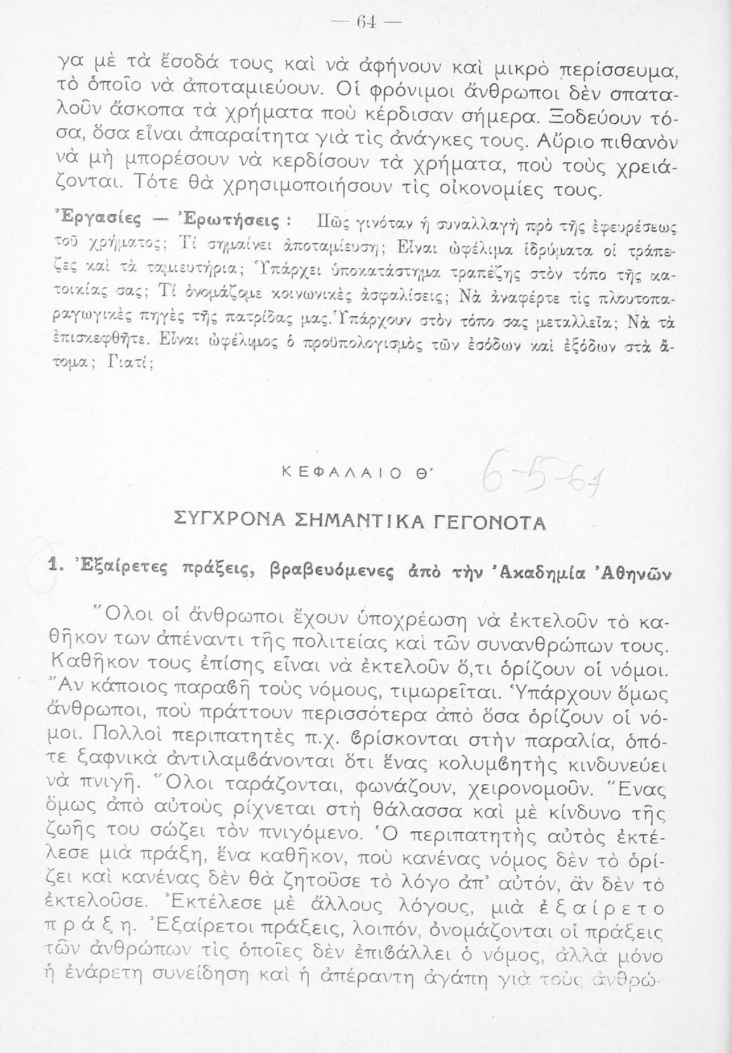 Σχολικό εγχειρίδιο για τις τελευταίες τάξεις στην Πρωτοβάθμια και στα Ελληνικά Σχολεία για το μάθημα της Αγωγής του Πολίτη. Αναφέρεται στις έννοιες του δικαίου, της ηθικής και των καθηκόντων των πολιτών. Είχε ...
