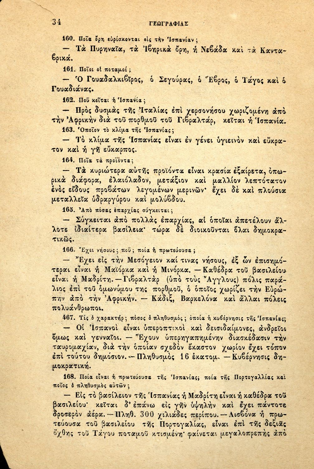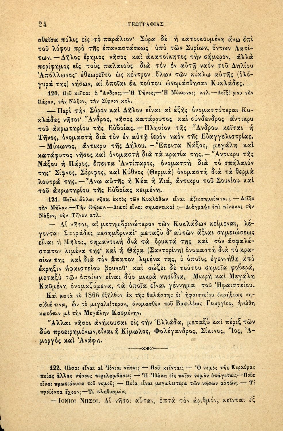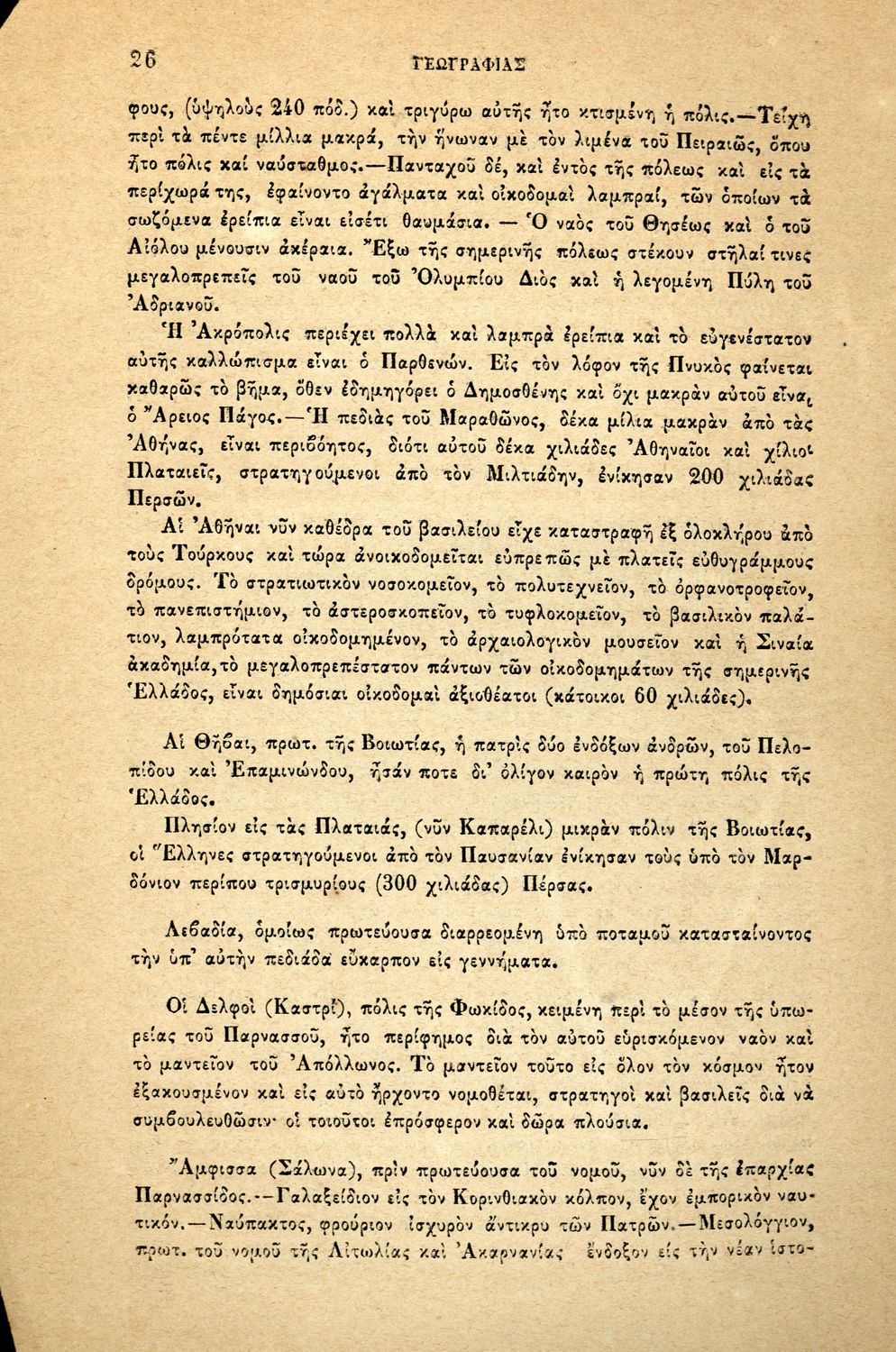 Σχολικό εγχειρίδιο Γεωγραφίας για τα Ελληνικά Σχολεία που περιλαμβάνει εισαγωγή στις βασικές έννοιες και ορισμούς της επιστήμης, και στοιχεία μαθηματικής, φυσικής και πολιτικής γεωγραφίας των πέντε ηπείρων.