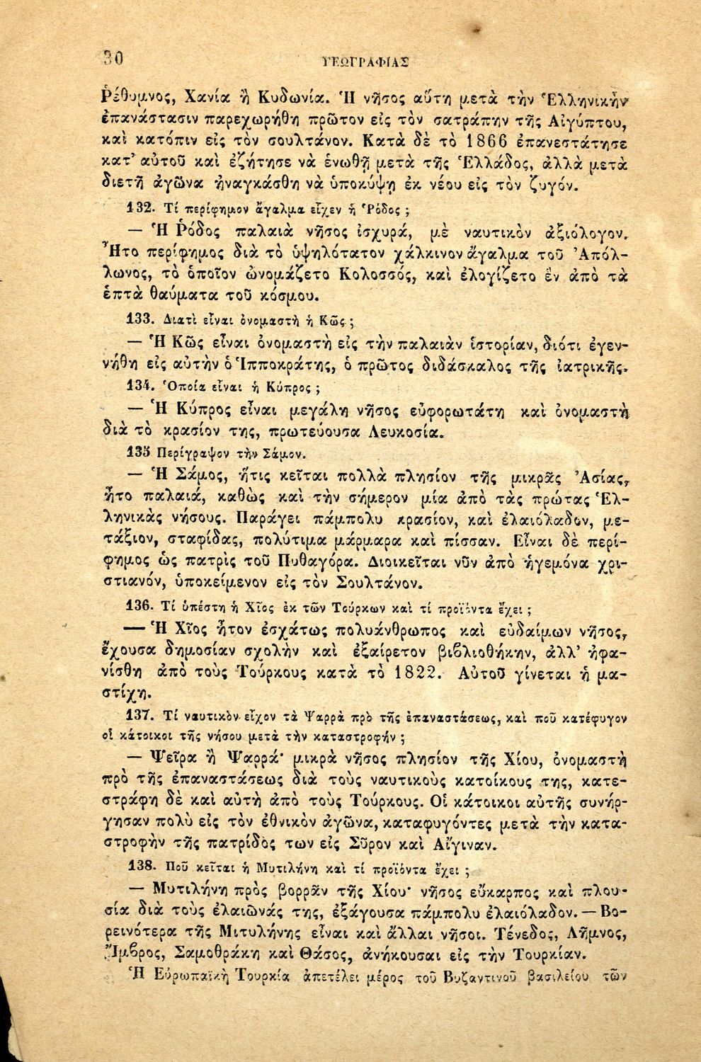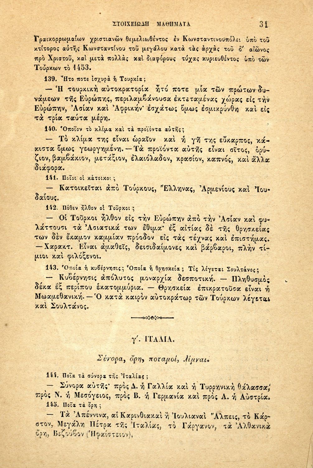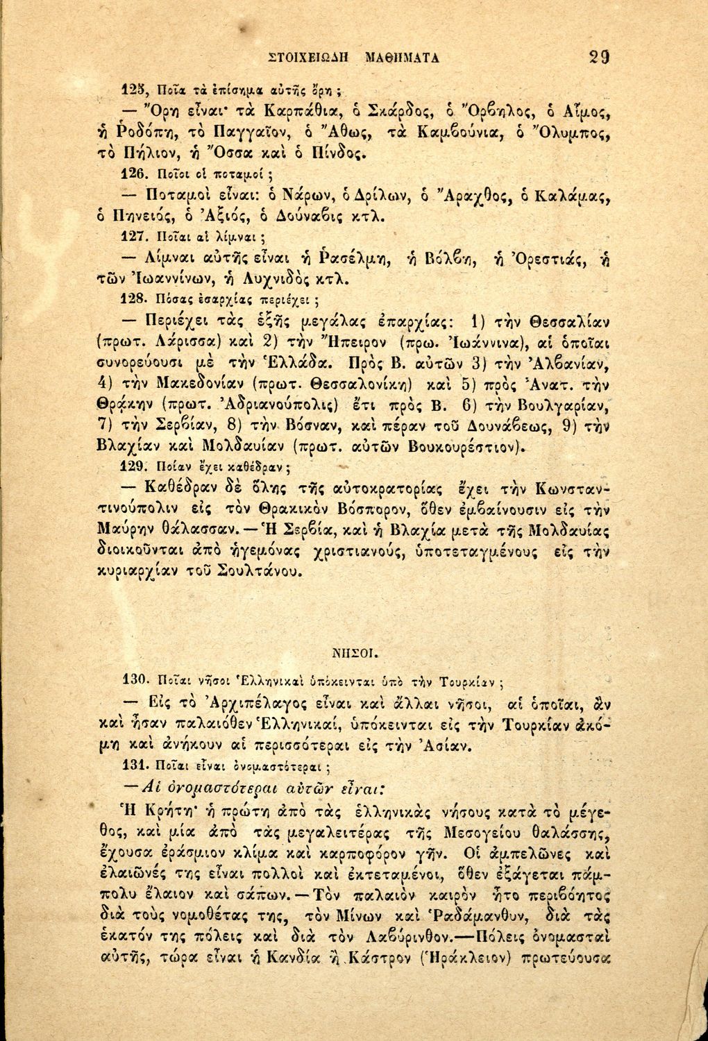 Σχολικό εγχειρίδιο Γεωγραφίας για τα Δημοτικά και τα Παρθεναγωγεία που περιέχει αναλυτική περιγραφή των συνοικιών της Κωνσταντινούπολης και τη γεωμορφολογία της Θράκης.