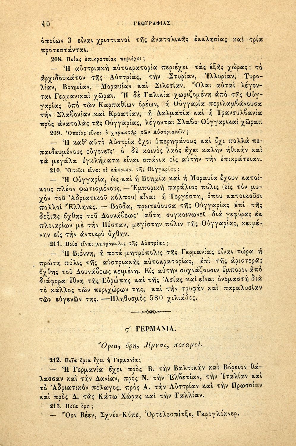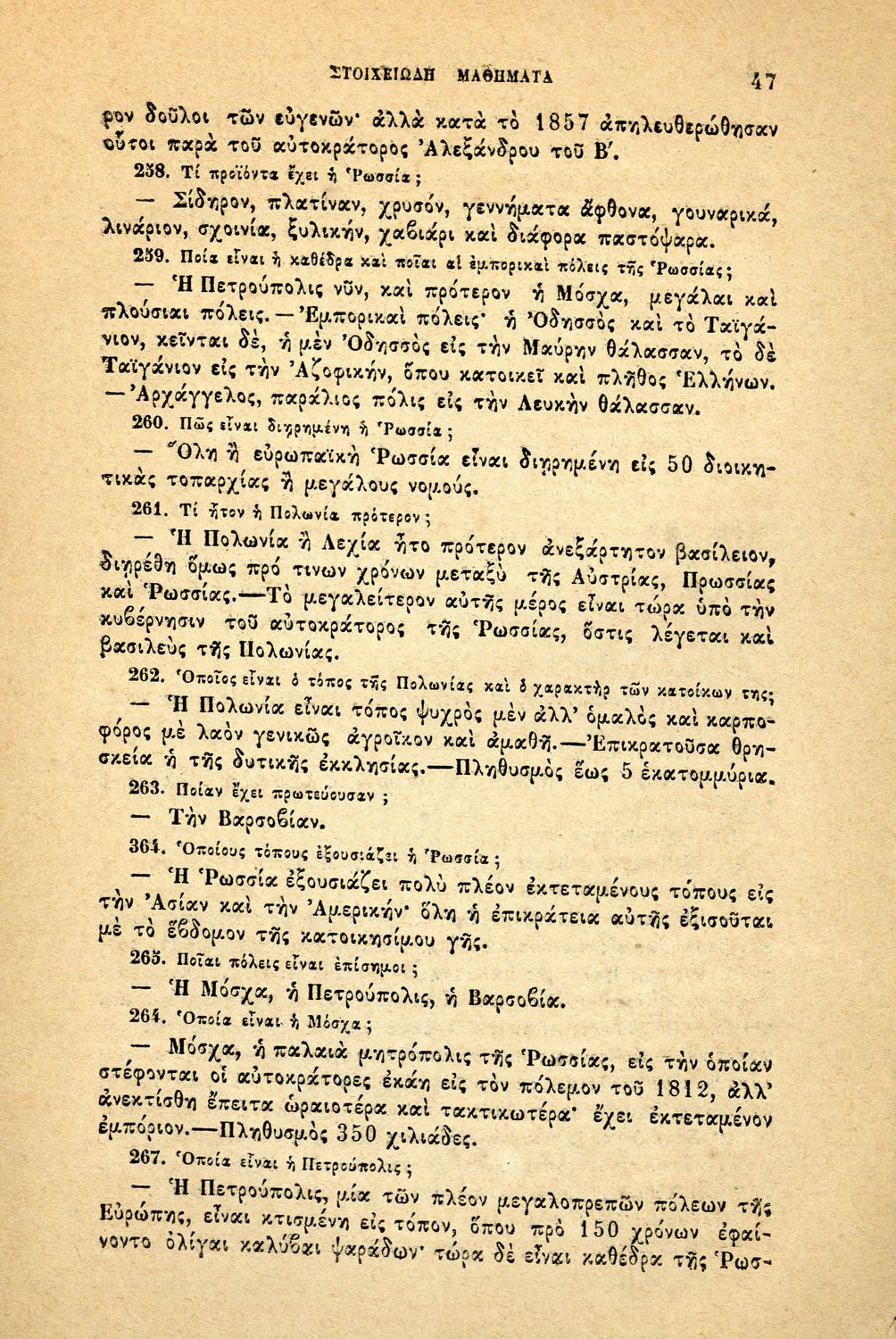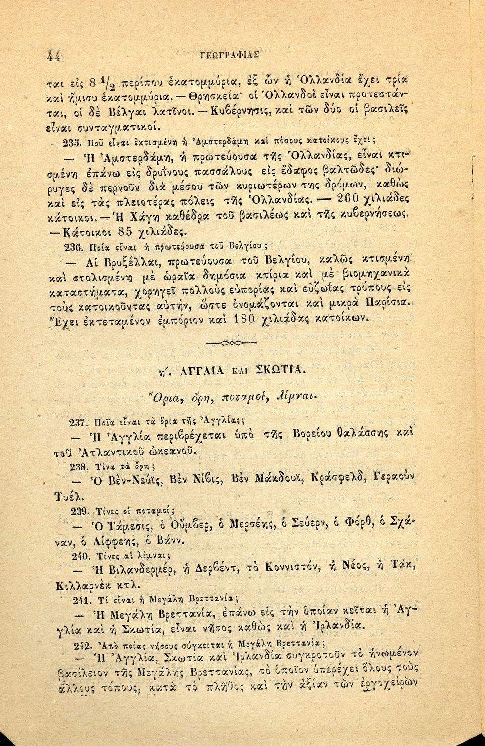Σχολικό εγχειρίδιο Γεωγραφίας για τα Δημοτικά και τα Παρθεναγωγεία που περιέχει αναλυτική περιγραφή των συνοικιών της Κωνσταντινούπολης και τη γεωμορφολογία της Θράκης.