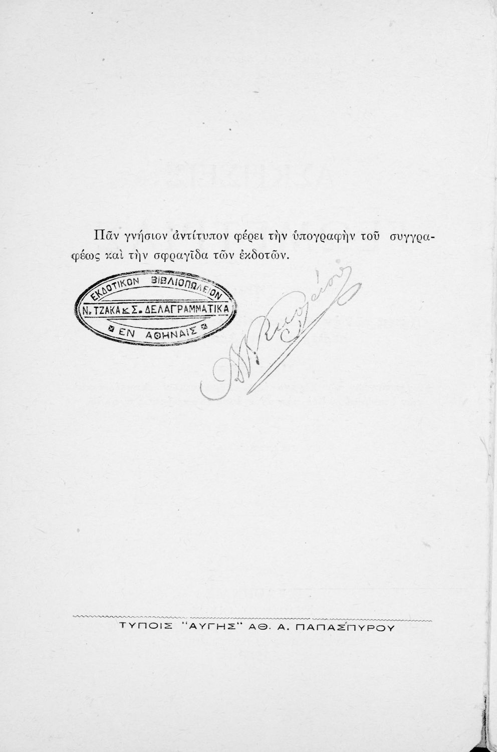 Εκδότης: Δημ. Ν. Τζάκας, Στεφ. Δελαγραμμάτικας Έτος έκδοσης: 1928 Τόπος έκδοσης: Αθήνα Έκδοση: 1η |