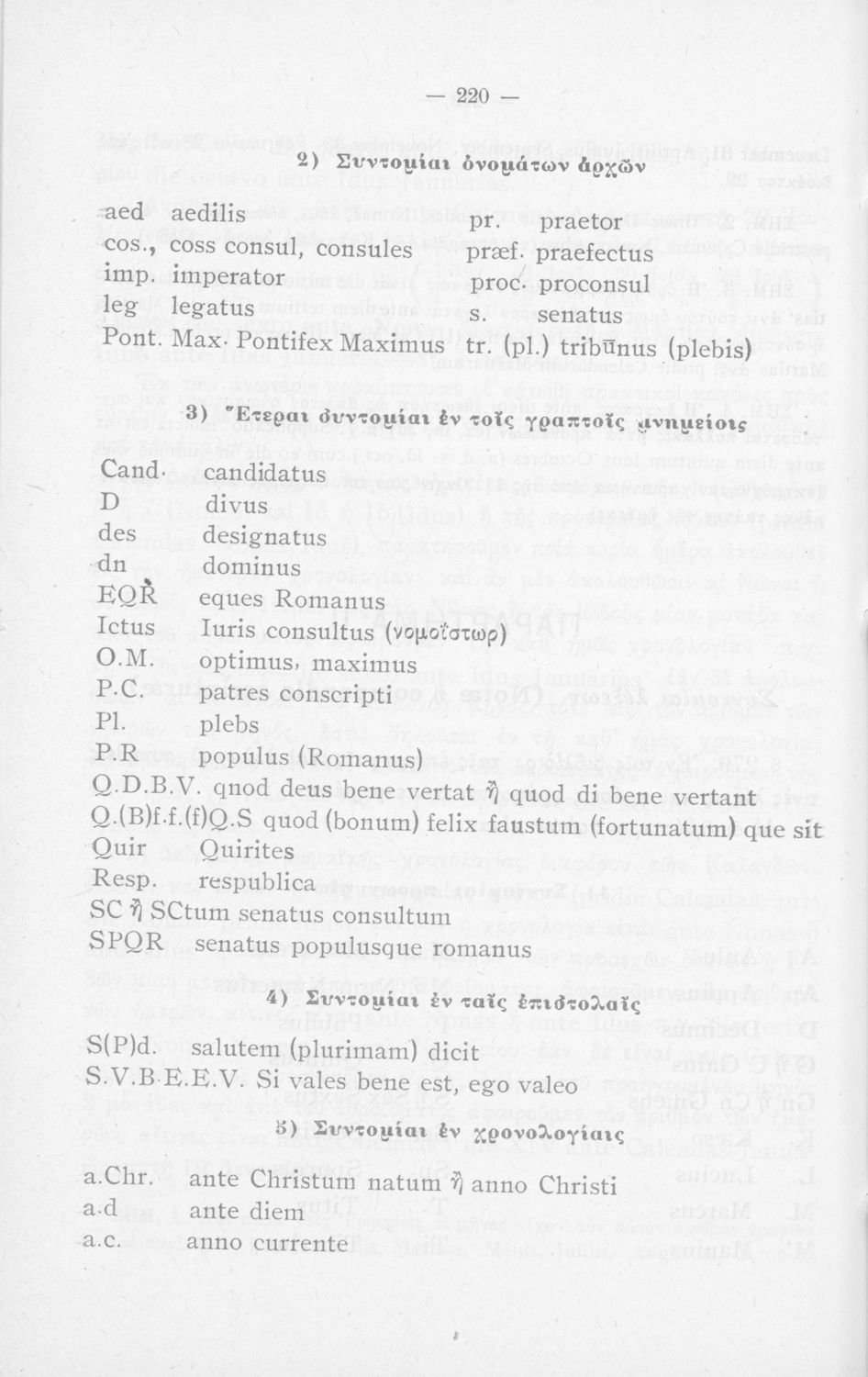 Σχολικό εγχειρίδιο Λατινικών που περιλαμβάνει τη γραμματική της λατινικής και είναι χωρισμένο στο φθογγολογικό, το τυπολογικό και το ετυμολογικό μέρος. Περιέχει και τους συντακτικούς κανόνες και τέσσερα παραρτήματα (Ρωμαϊκό ημερολόγιο, συντετμημένες λέξεις, Ρωμαϊκά νομίσματα, μέτρα και σταθμά και προσωδία - μετρική).
