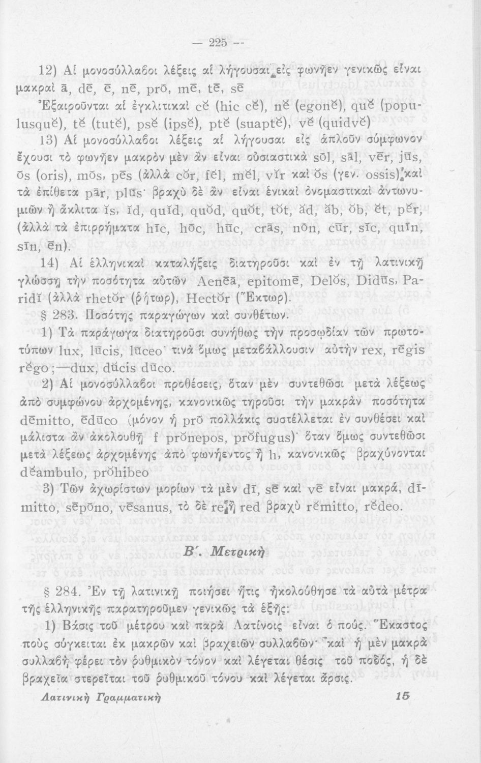 Σχολικό εγχειρίδιο Λατινικών Γυμνασίου που περιλαμβάνει γραμματική και συντακτικό και είναι χωρισμένο σε φθογγολογικό, τυπολογικό και ετυμολογικό μέρος. Περιέχει και μετρικό παράρτημα. Ο συγγραφέας ήταν ...