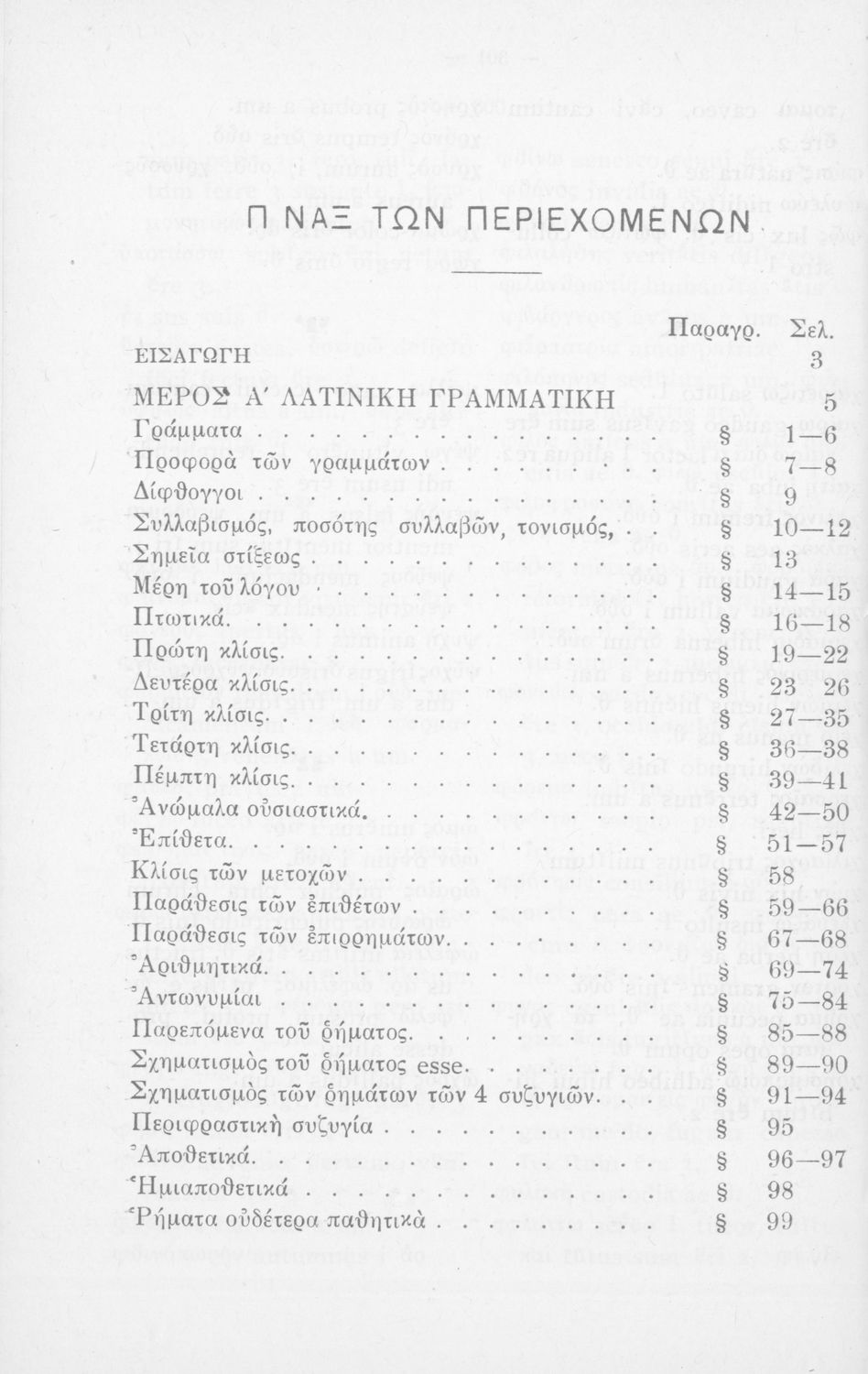 Σχολικό εγχειρίδιο Λατινικών που περιλαμβάνει τη γραμματική της λατινικής και είναι χωρισμένο στο φθογγολογικό, το τυπολογικό και το ετυμολογικό μέρος. Περιέχει και τους συντακτικούς κανόνες και τέσσερα παραρτήματα (Ρωμαϊκό ημερολόγιο, συντετμημένες λέξεις, Ρωμαϊκά νομίσματα, μέτρα και σταθμά και προσωδία - μετρική).