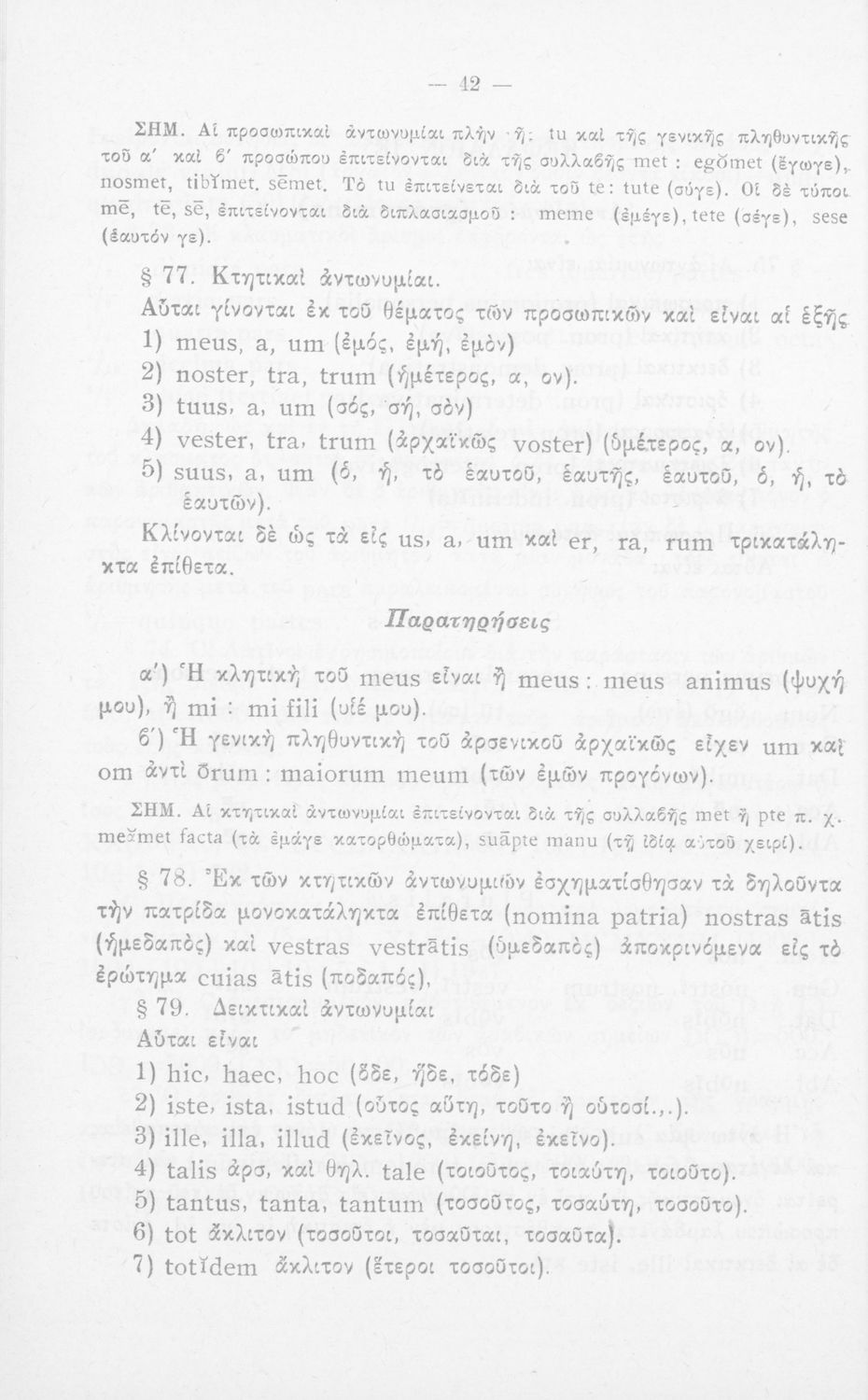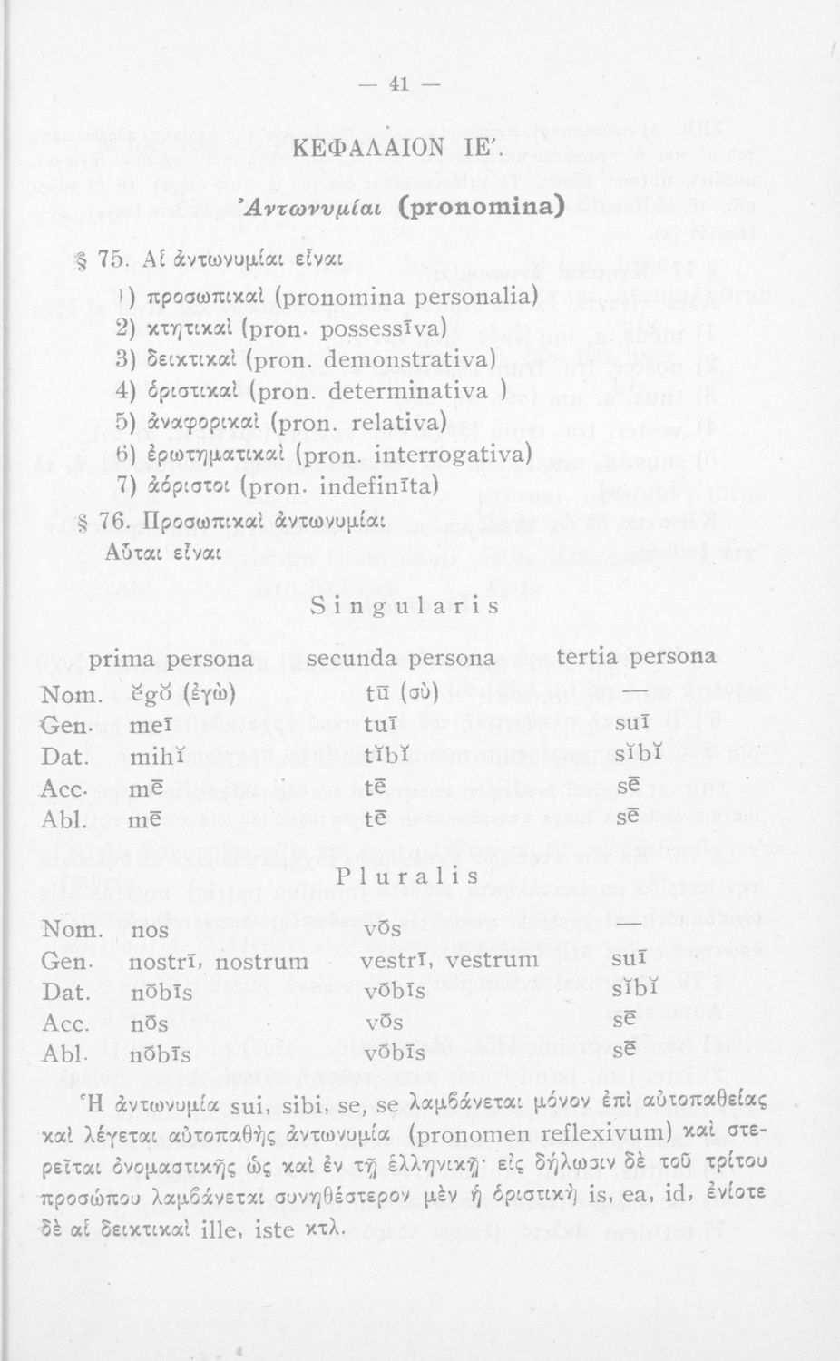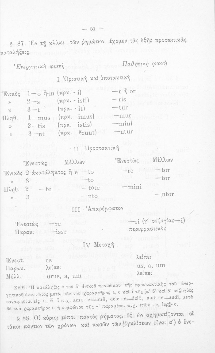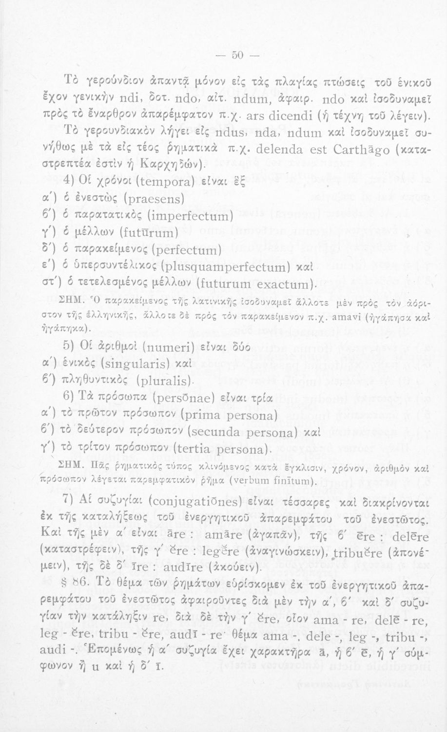 520 ## _aΣχολικό εγχειρίδιο Λατινικών που περιλαμβάνει τη γραμματική της λατινικής και είναι χωρισμένο στο φθογγολογικό, το τυπολογικό και το ετυμολογικό μέρος. Περιέχει και τους συντακτικούς κανόνες και τέσσερα παραρτήματα (Ρωμαϊκό ημερολόγιο, συντετμημένες λέξεις, Ρωμαϊκά νομίσματα, μέτρα και σταθμά και προσωδία - μετρική).