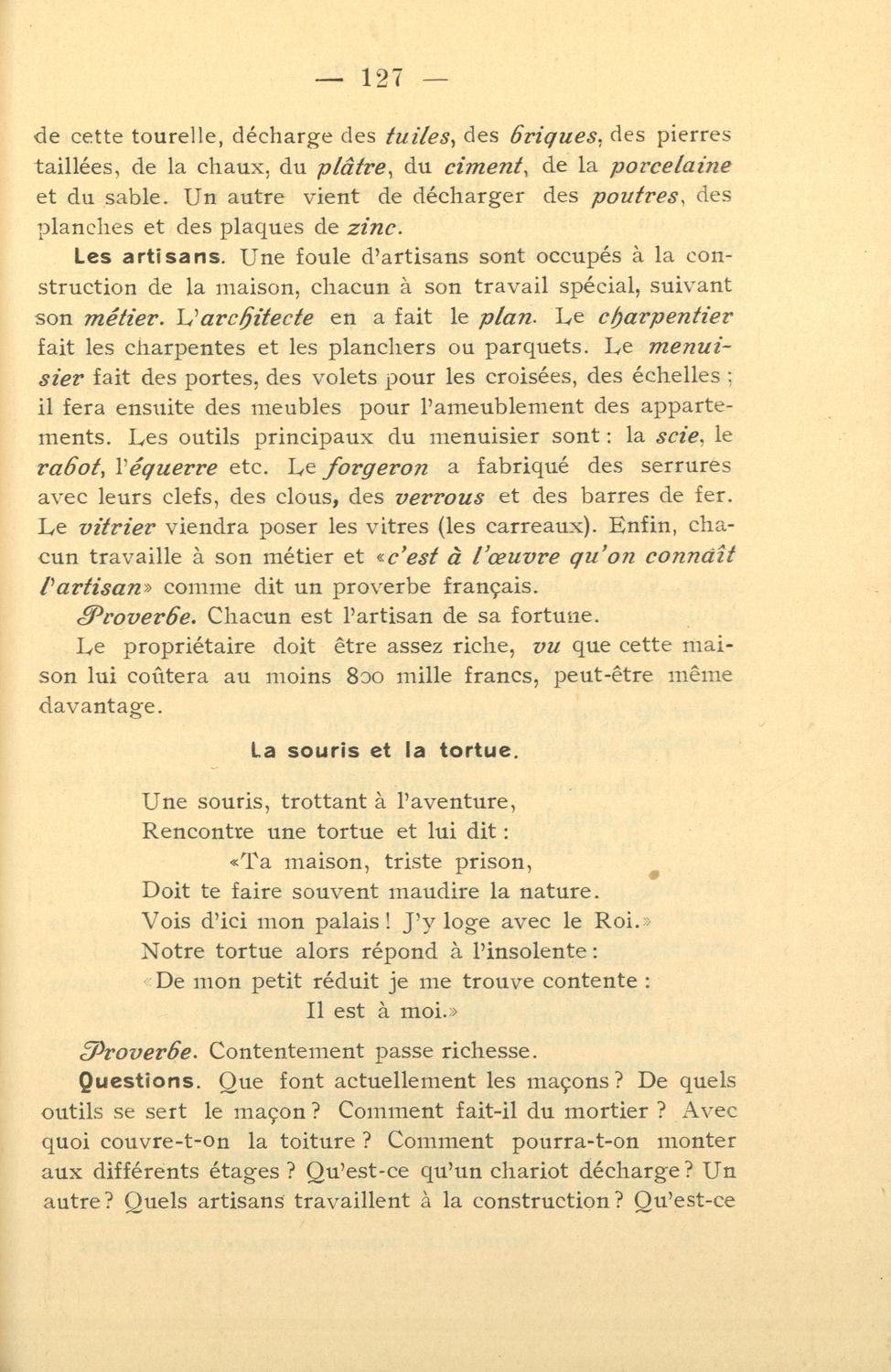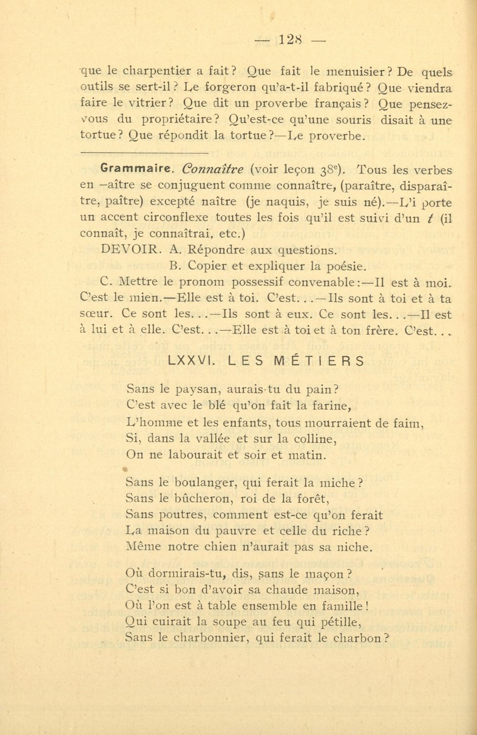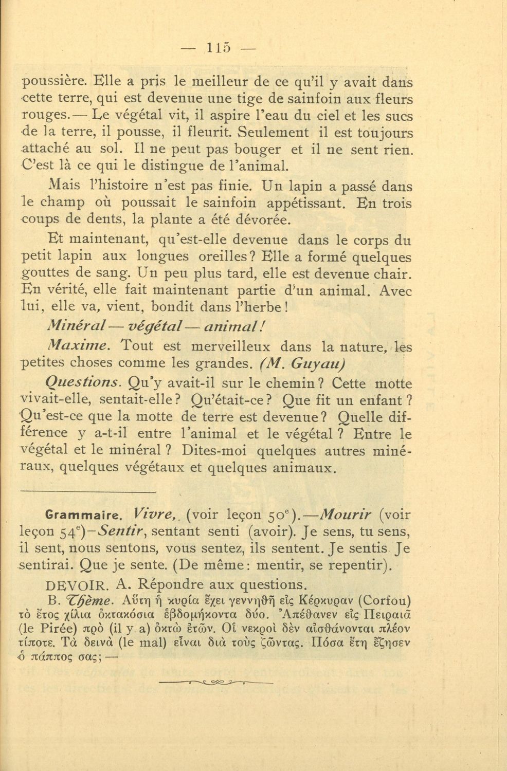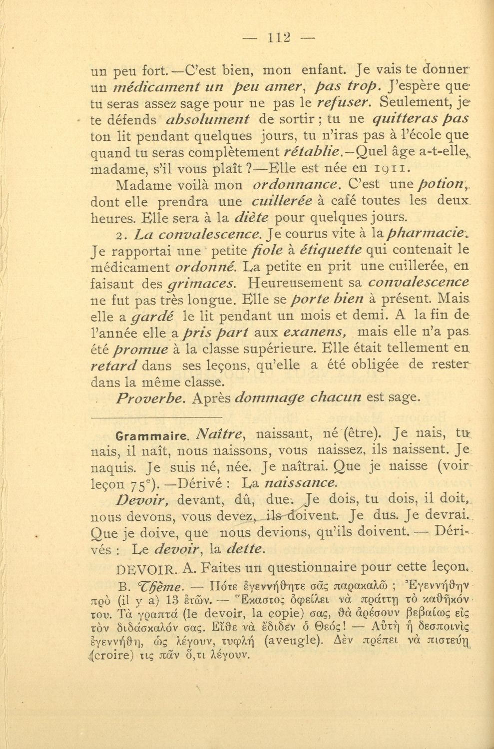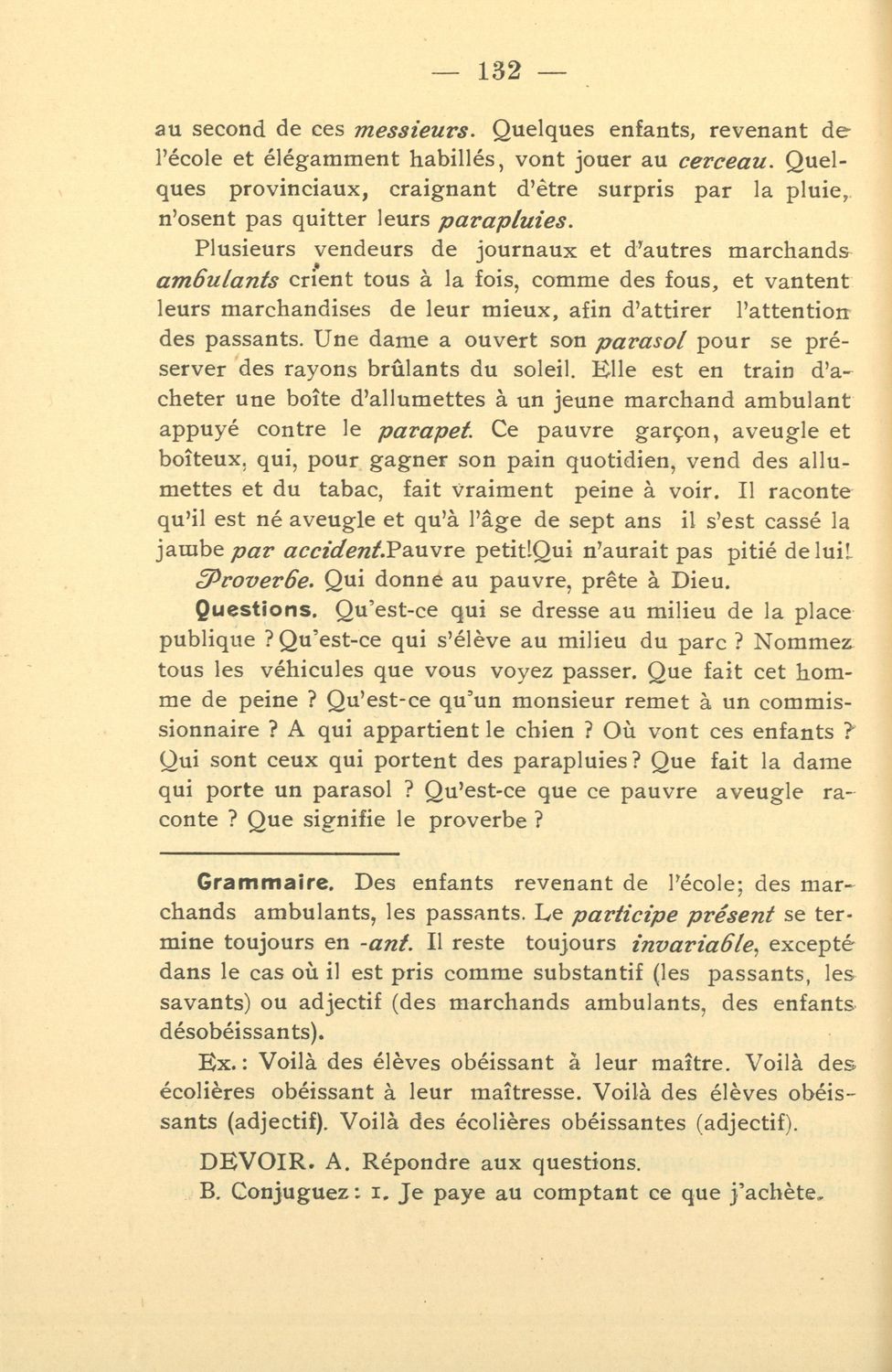 Σχολικό εγχειρίδιο Γαλλικών που περιλαμβάνει 54 κείμενα για τη διδασκαλία των γραμματικών και συντακτικών φαινομένων και της ορθογραφίας, λεξιλόγιο και παράρτημα με τους κανόνες συλλαβισμού.