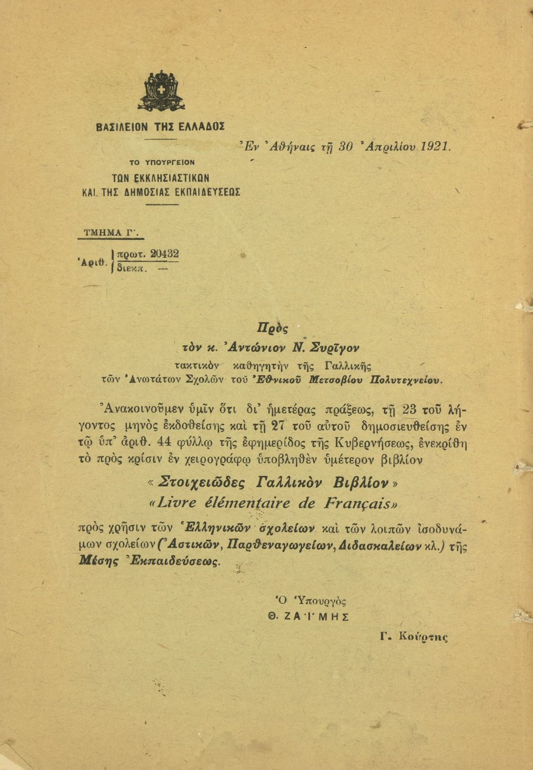 Στοιχειώδες βιβλίον της γαλλικής γλώσσης προς χρήσιν των Ελληνικών και Αστικών Σχολείων των Παρθεναγωγείων, των Διδασκαλείων και των Εμπορικών Σχολών του κράτους