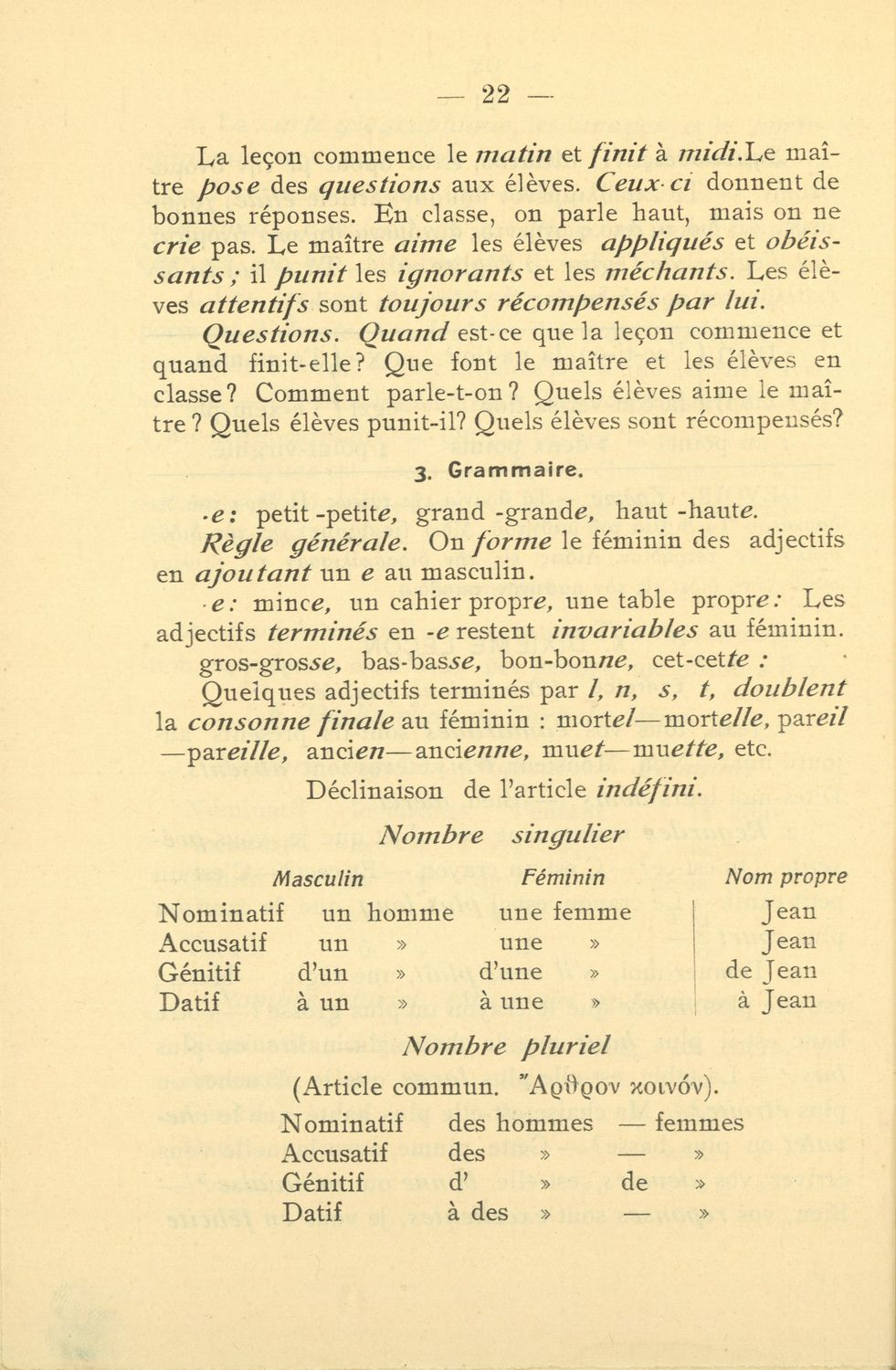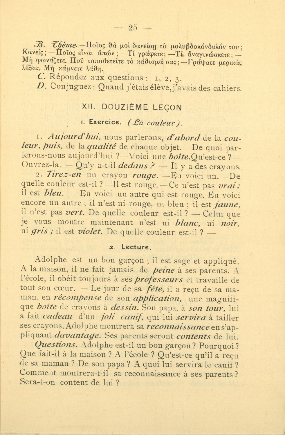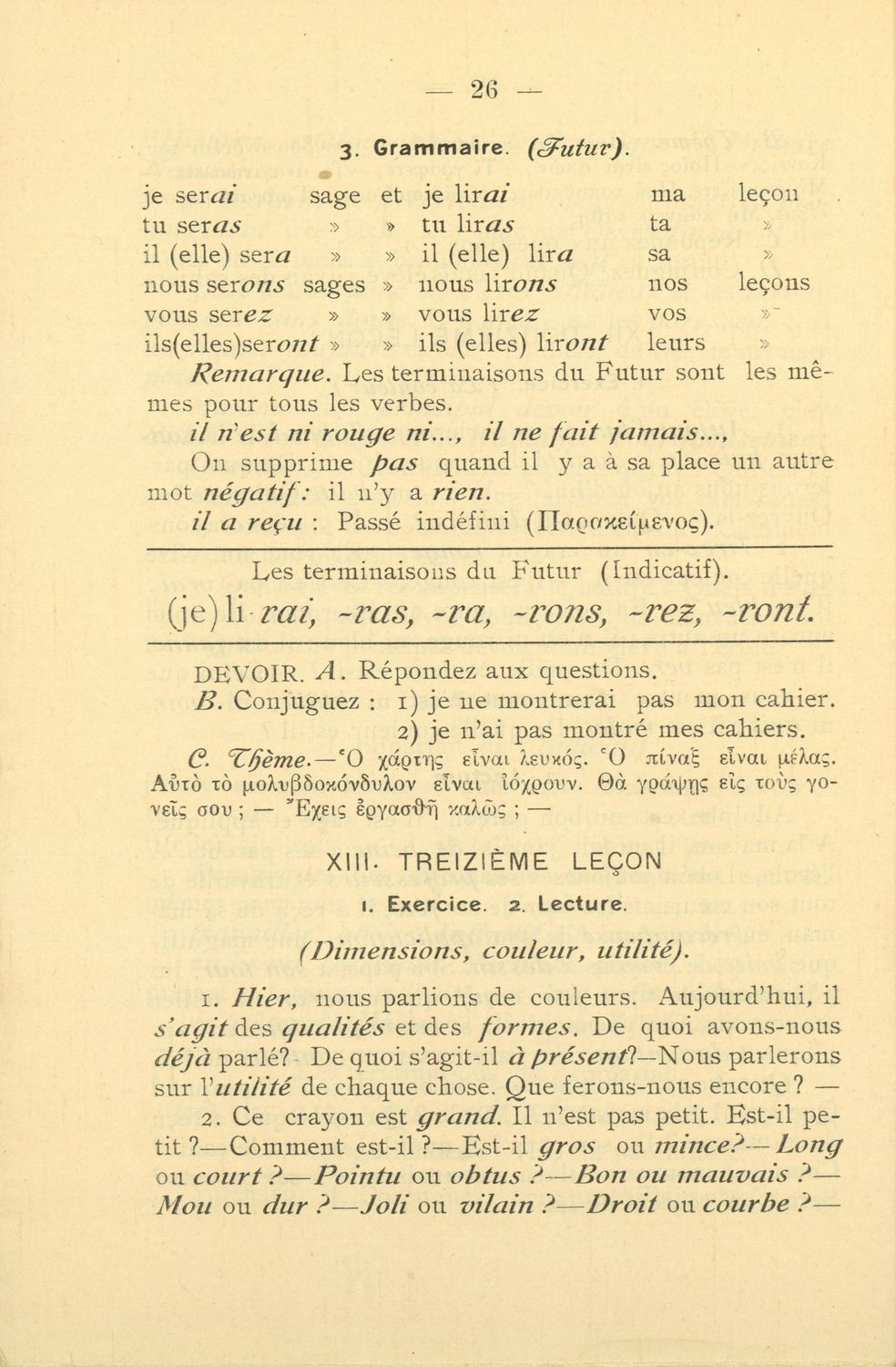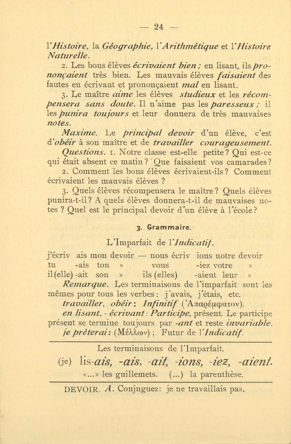 Σχολικό εγχειρίδιο Γαλλικών που περιλαμβάνει 54 κείμενα για τη διδασκαλία των γραμματικών και συντακτικών φαινομένων και της ορθογραφίας, λεξιλόγιο και παράρτημα με τους κανόνες συλλαβισμού.