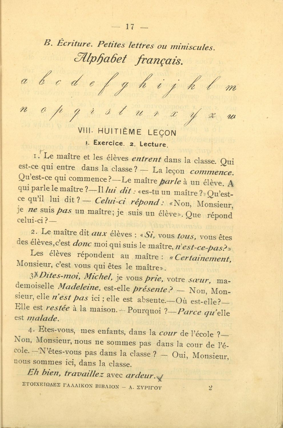 Σχολικό εγχειρίδιο Γαλλικών για τοΕλληνικό Σχολείο, το Αστικό Σχολείο, το Παρθεναγωγείο, το Διδασκαλείο και τις Εμπορικές Σχολές που αποτελείται από κείμενα, γραμματική και συντακτικό της γαλλικής γλώσσας και αναλυτικό παράρτημα με λεξιλόγιο.