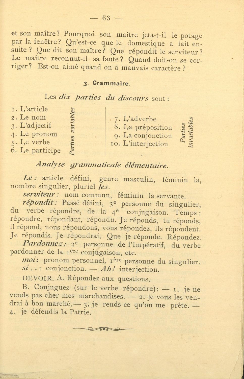 Σχολικό εγχειρίδιο Γαλλικών που περιλαμβάνει 54 κείμενα για τη διδασκαλία των γραμματικών και συντακτικών φαινομένων και της ορθογραφίας, λεξιλόγιο και παράρτημα με τους κανόνες συλλαβισμού.