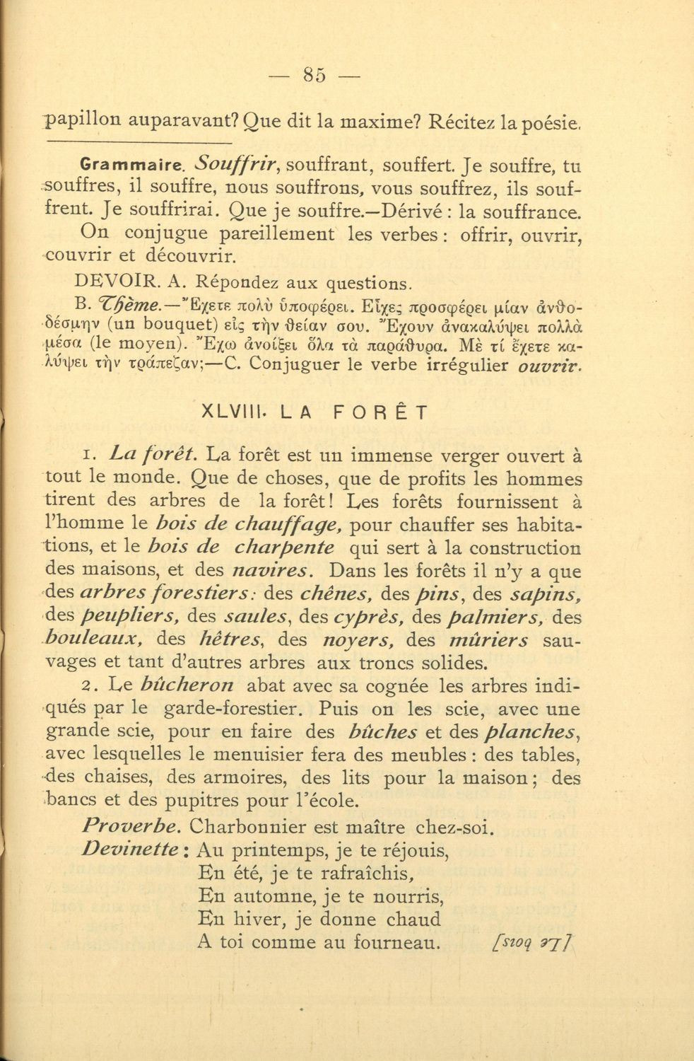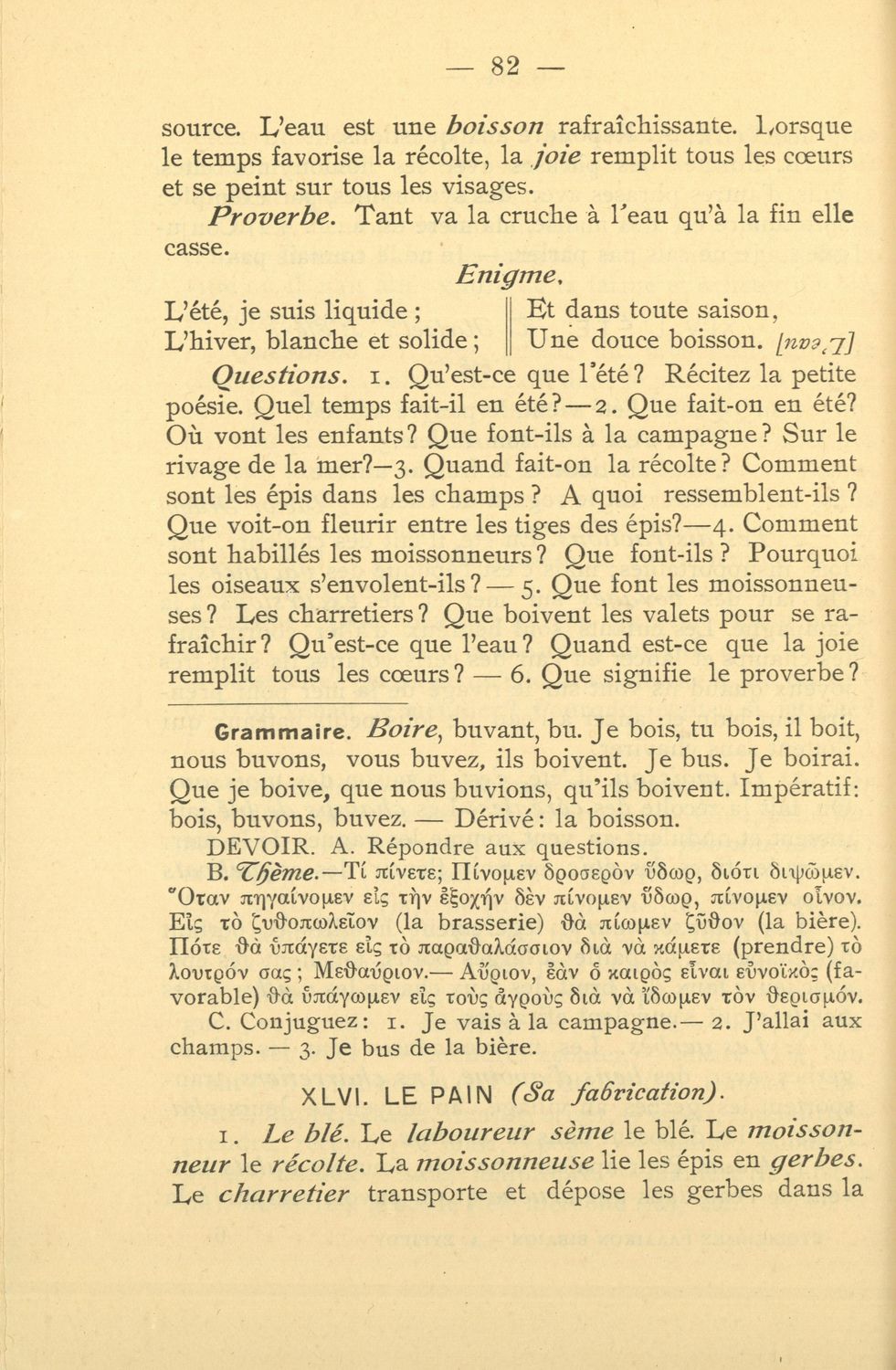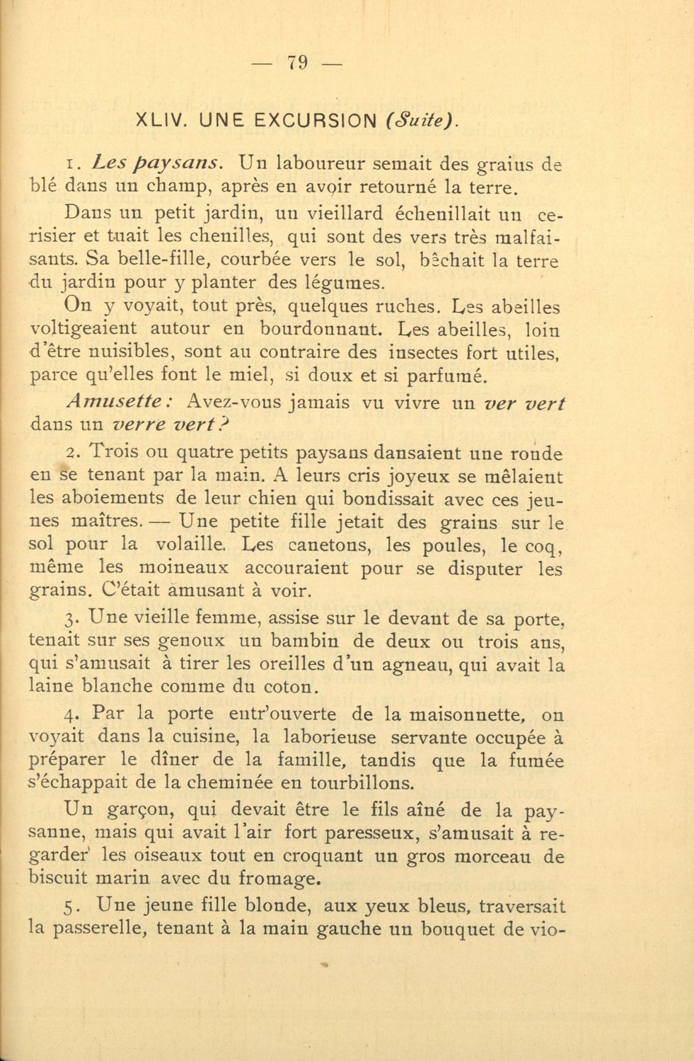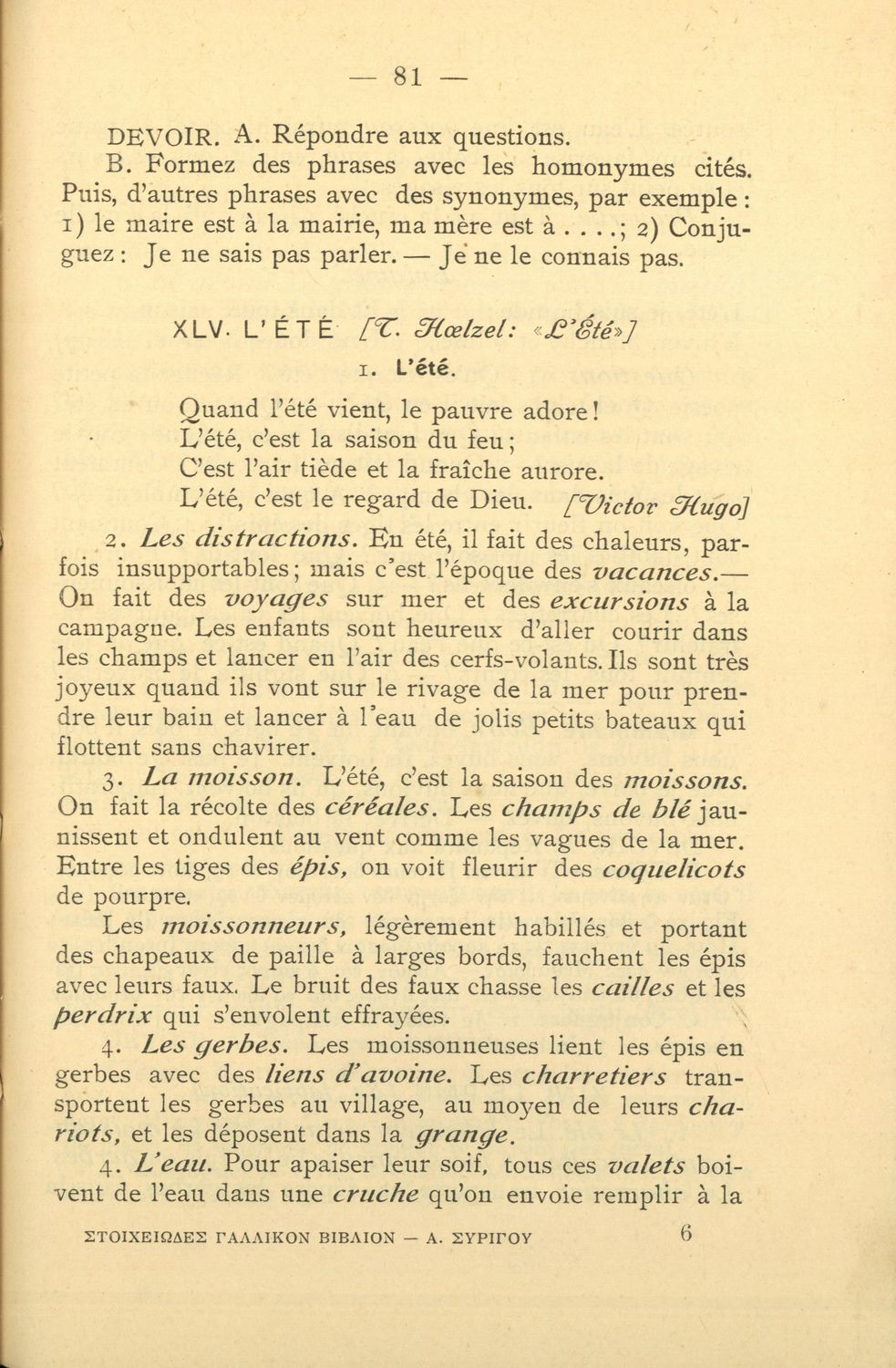 Σχολικό εγχειρίδιο Γαλλικών που περιλαμβάνει 54 κείμενα για τη διδασκαλία των γραμματικών και συντακτικών φαινομένων και της ορθογραφίας, λεξιλόγιο και παράρτημα με τους κανόνες συλλαβισμού.