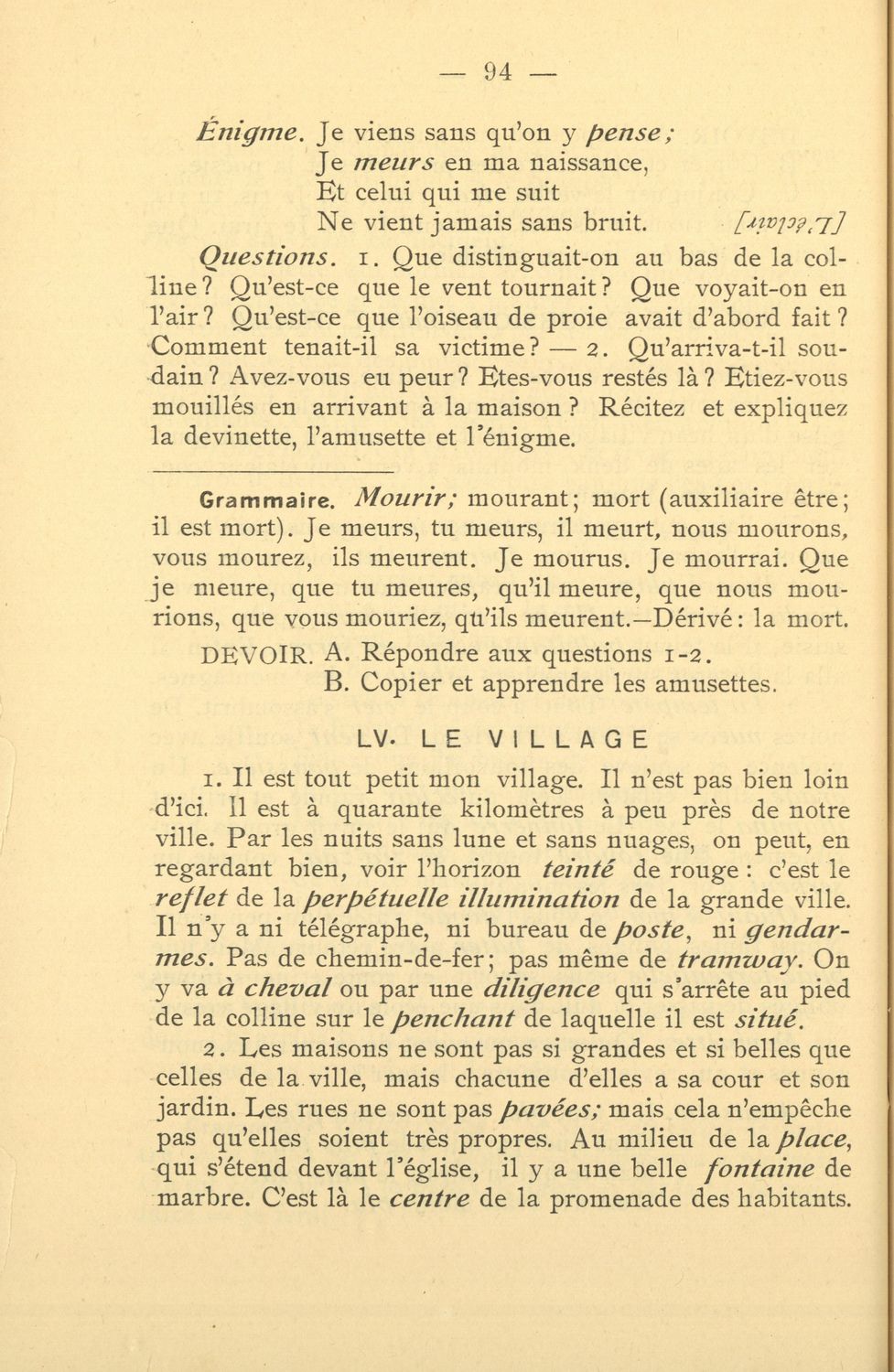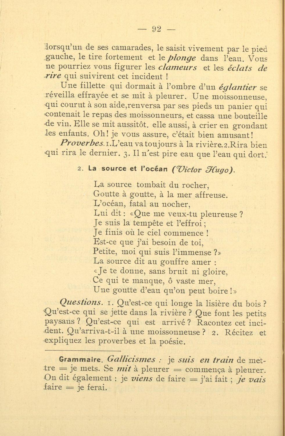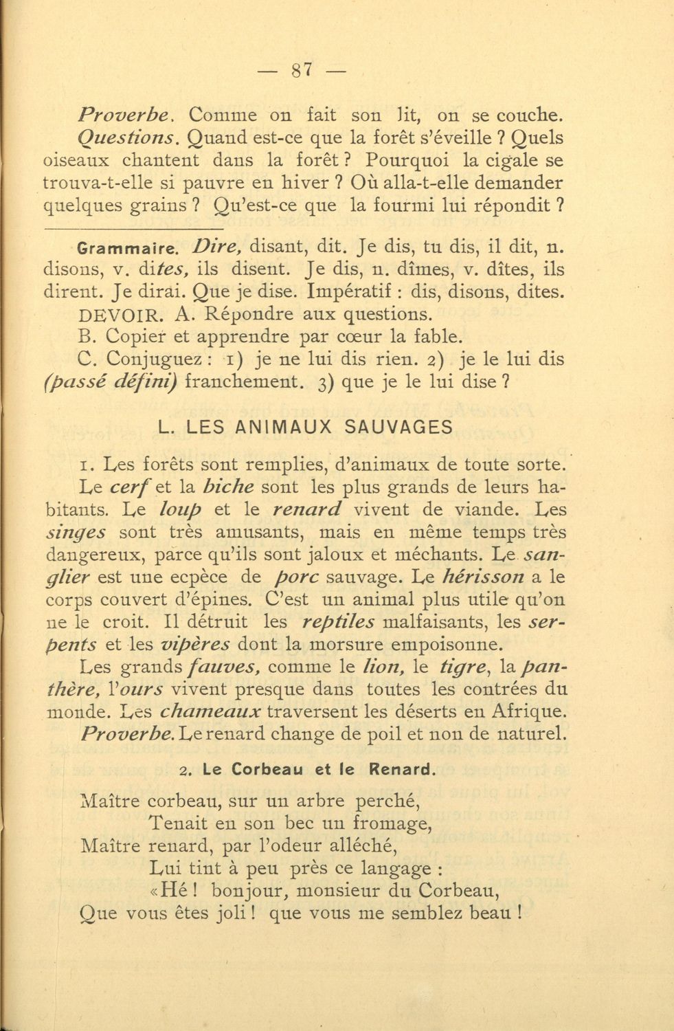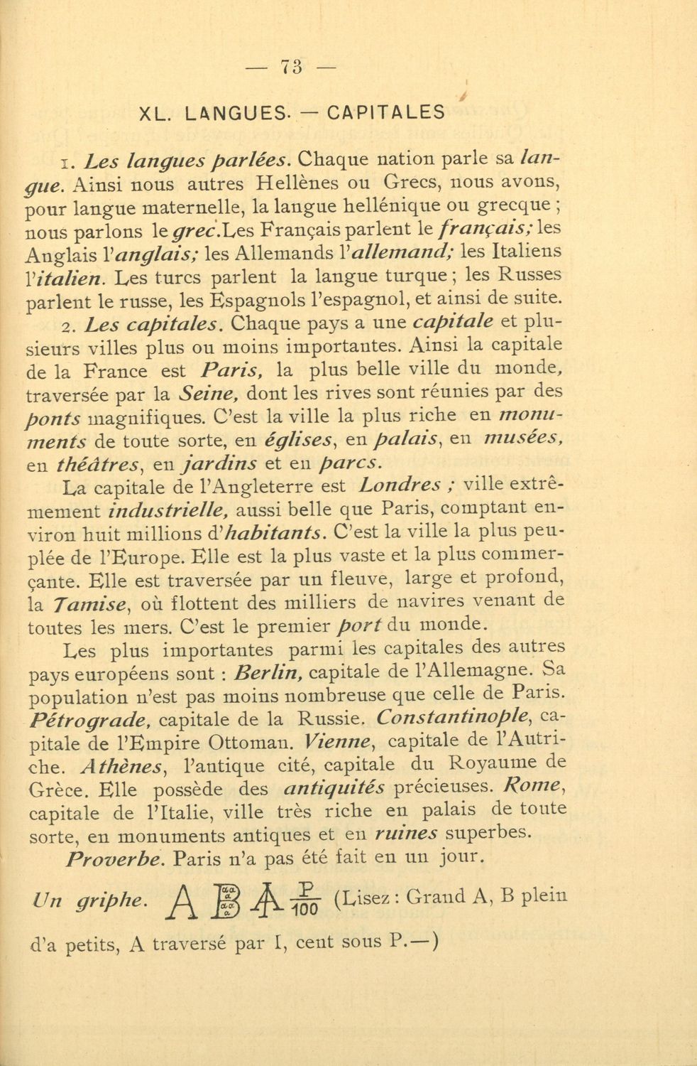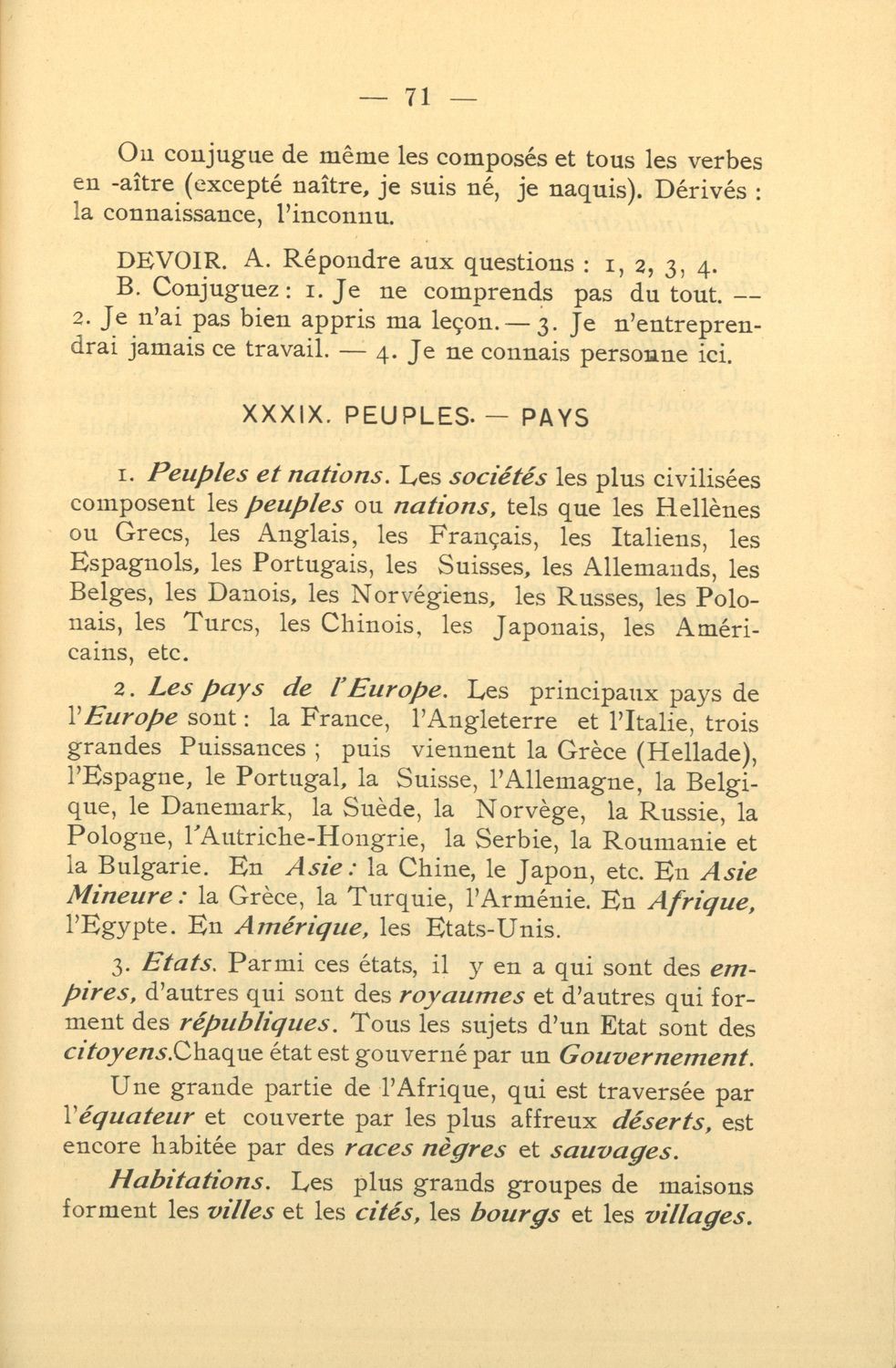 Σχολικό εγχειρίδιο Γαλλικών που περιλαμβάνει 54 κείμενα για τη διδασκαλία των γραμματικών και συντακτικών φαινομένων και της ορθογραφίας, λεξιλόγιο και παράρτημα με τους κανόνες συλλαβισμού.