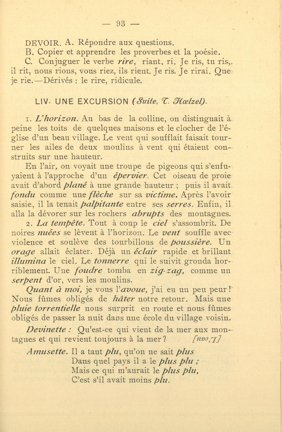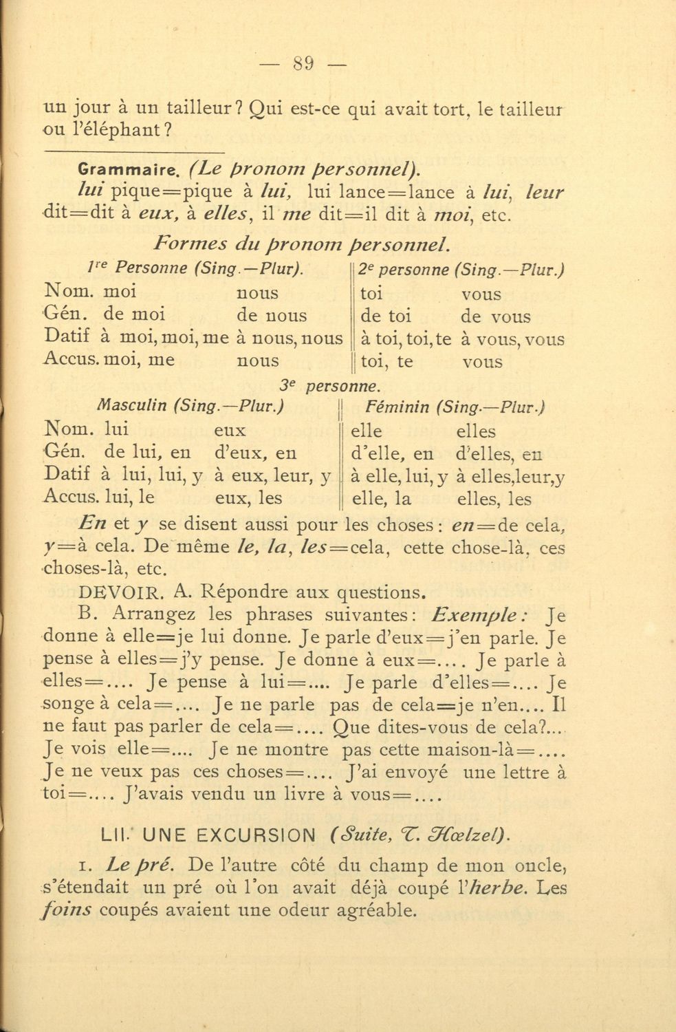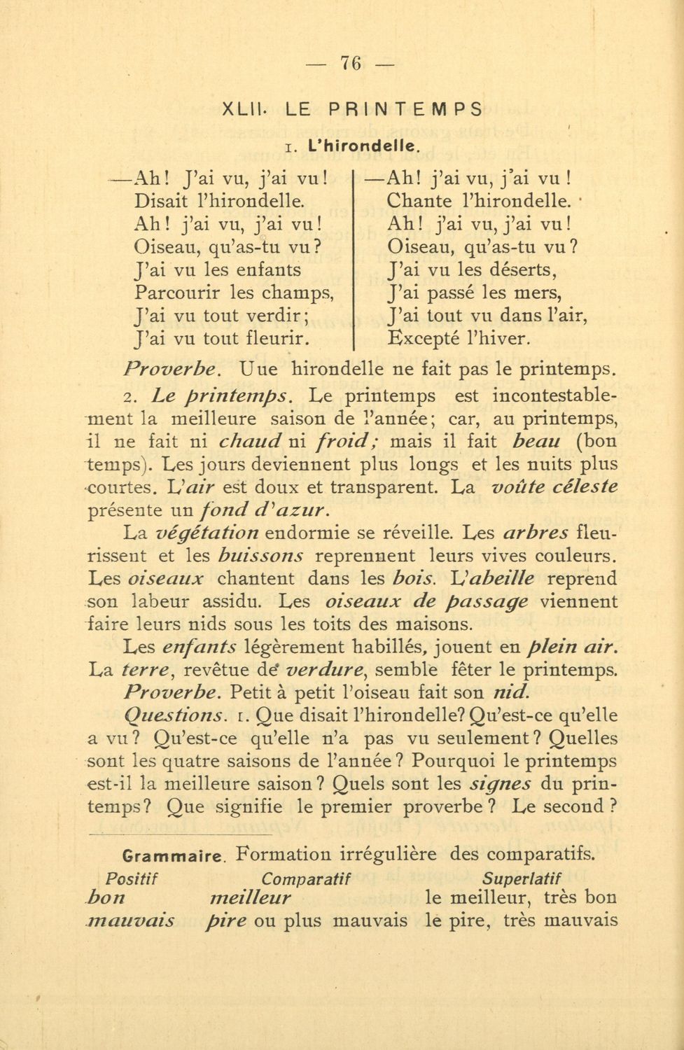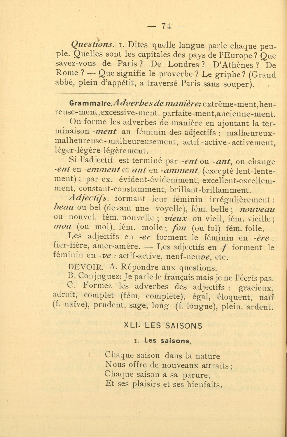 Σχολικό εγχειρίδιο Γαλλικών που περιλαμβάνει 54 κείμενα για τη διδασκαλία των γραμματικών και συντακτικών φαινομένων και της ορθογραφίας, λεξιλόγιο και παράρτημα με τους κανόνες συλλαβισμού.