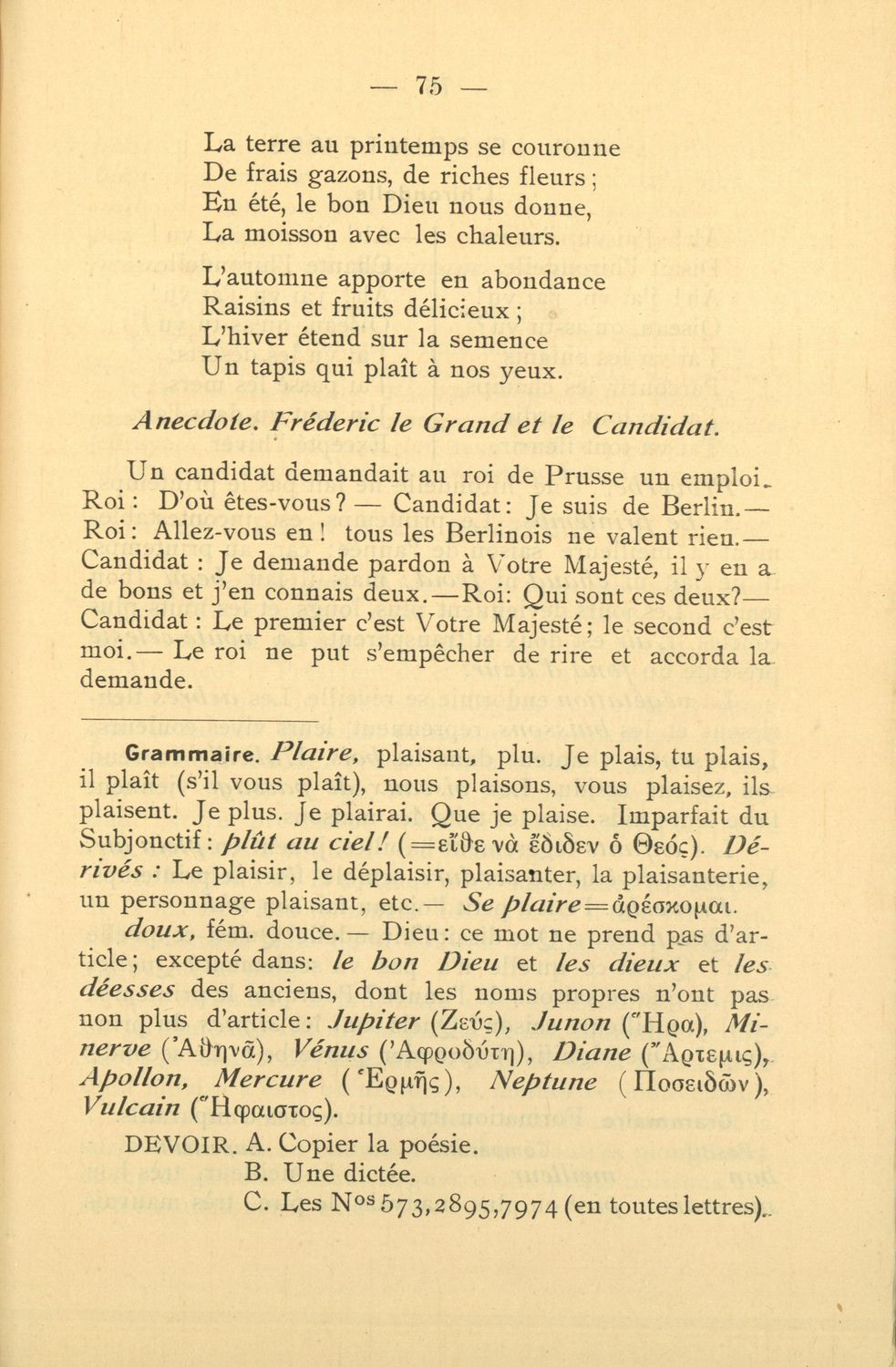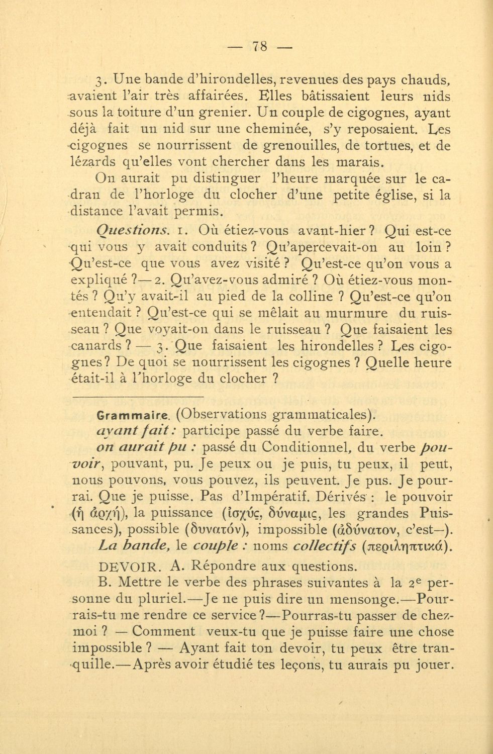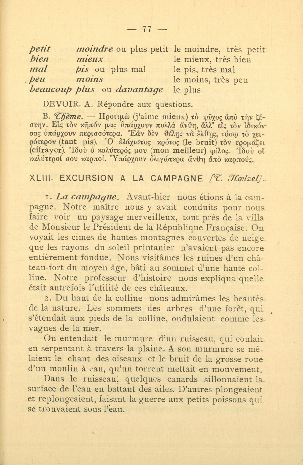 Σχολικό εγχειρίδιο Γαλλικών για τοΕλληνικό Σχολείο, το Αστικό Σχολείο, το Παρθεναγωγείο, το Διδασκαλείο και τις Εμπορικές Σχολές που αποτελείται από κείμενα, γραμματική και συντακτικό της γαλλικής γλώσσας και αναλυτικό παράρτημα με λεξιλόγιο.