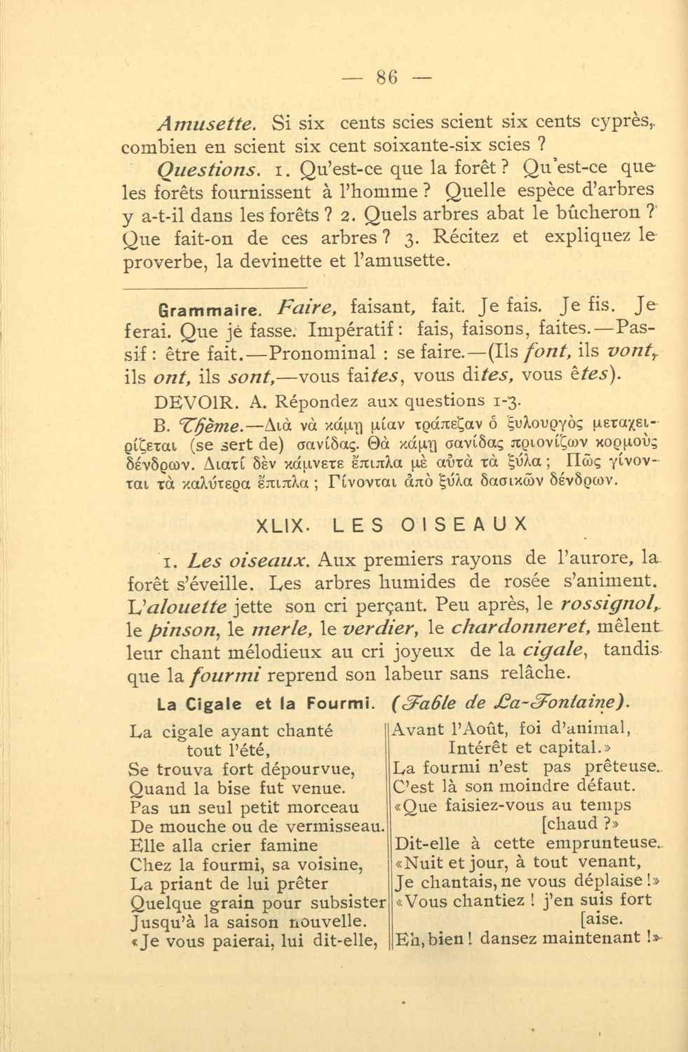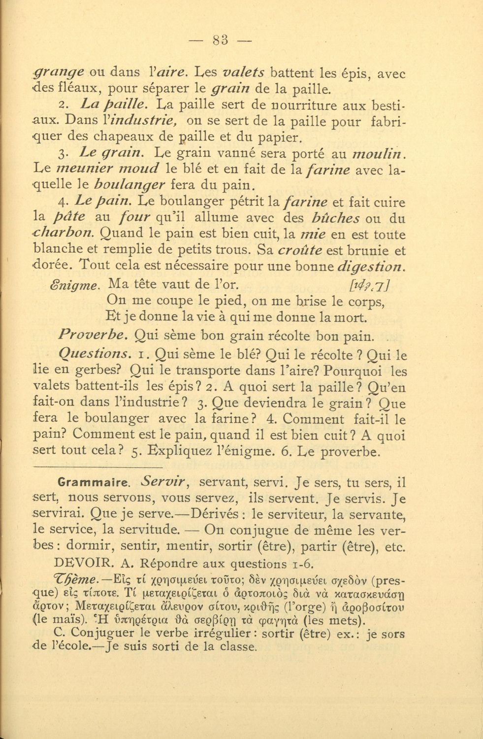 Παρουσίαση περιεχομένου: Σχολικό εγχειρίδιο Γαλλικών για τοΕλληνικό Σχολείο, το Αστικό Σχολείο, το Παρθεναγωγείο, το Διδασκαλείο και τις Εμπορικές Σχολές που αποτελείται από κείμενα, γραμματική και συντακτικό της γαλλικής γλώσσας και αναλυτικό παράρτημα με λεξιλόγιο.
