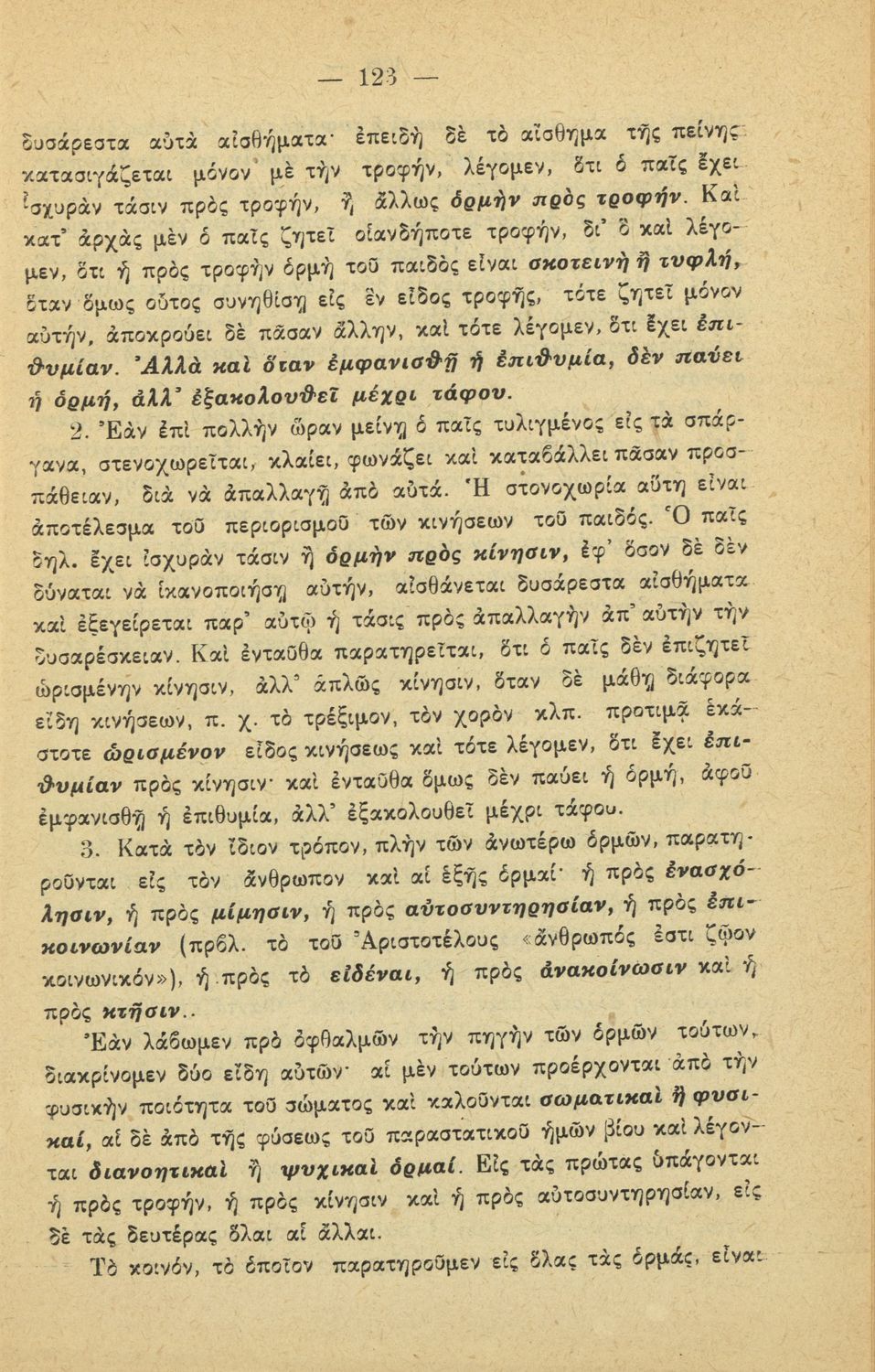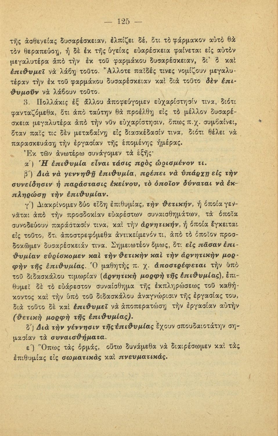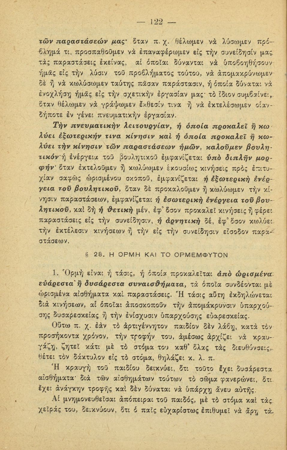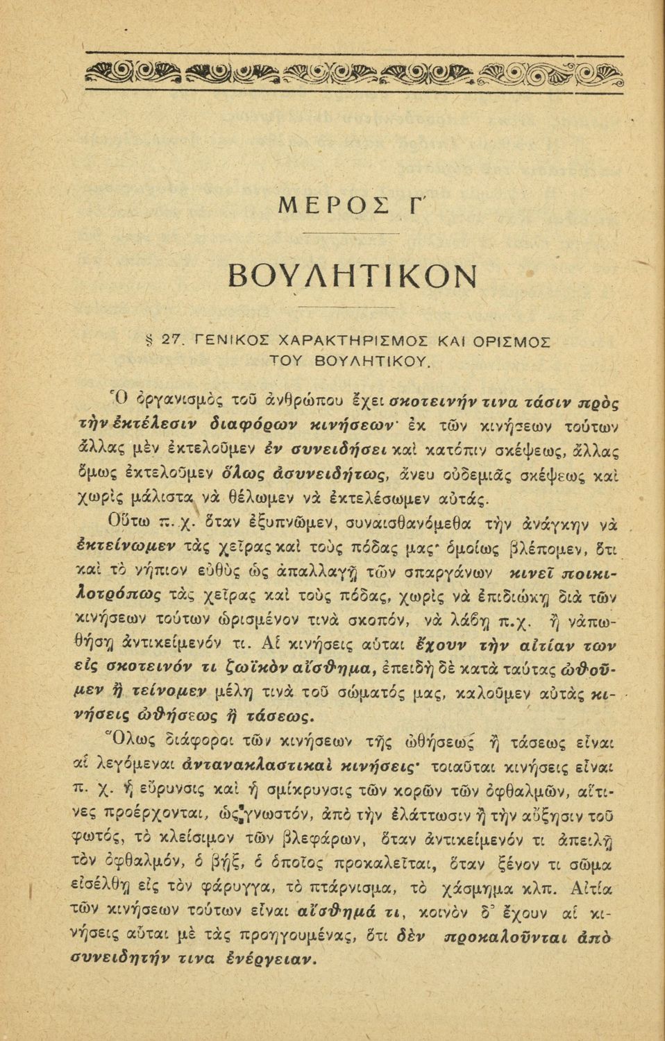 Σχολικό εγχειρίδιο Πειραματικής Ψυχολογίας για τη Γ΄ Γυμνασίου χωρισμένο σε τρία τμήματα: το παριστάναι, το συναισθάνεσθαι, και το βούλεσθαι.