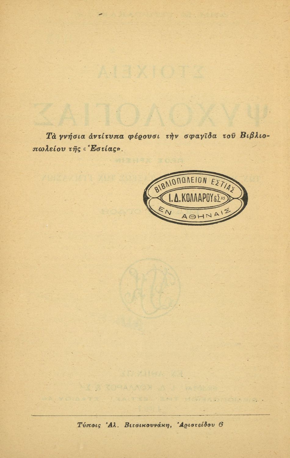 Εκδότης: Ιωάννης Δ. Κολλάρος, Βιβλιοπωλείο της "Εστίας"