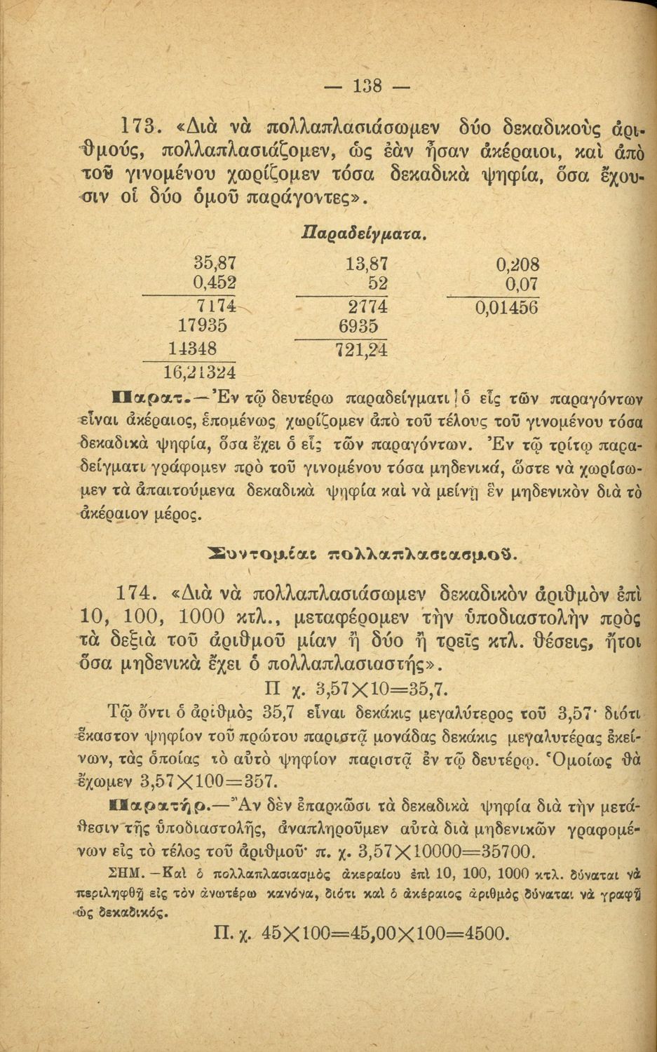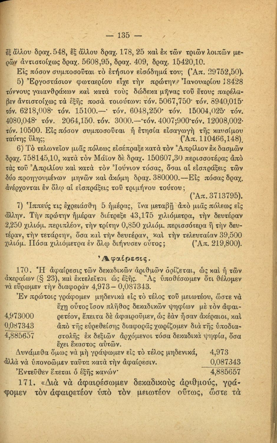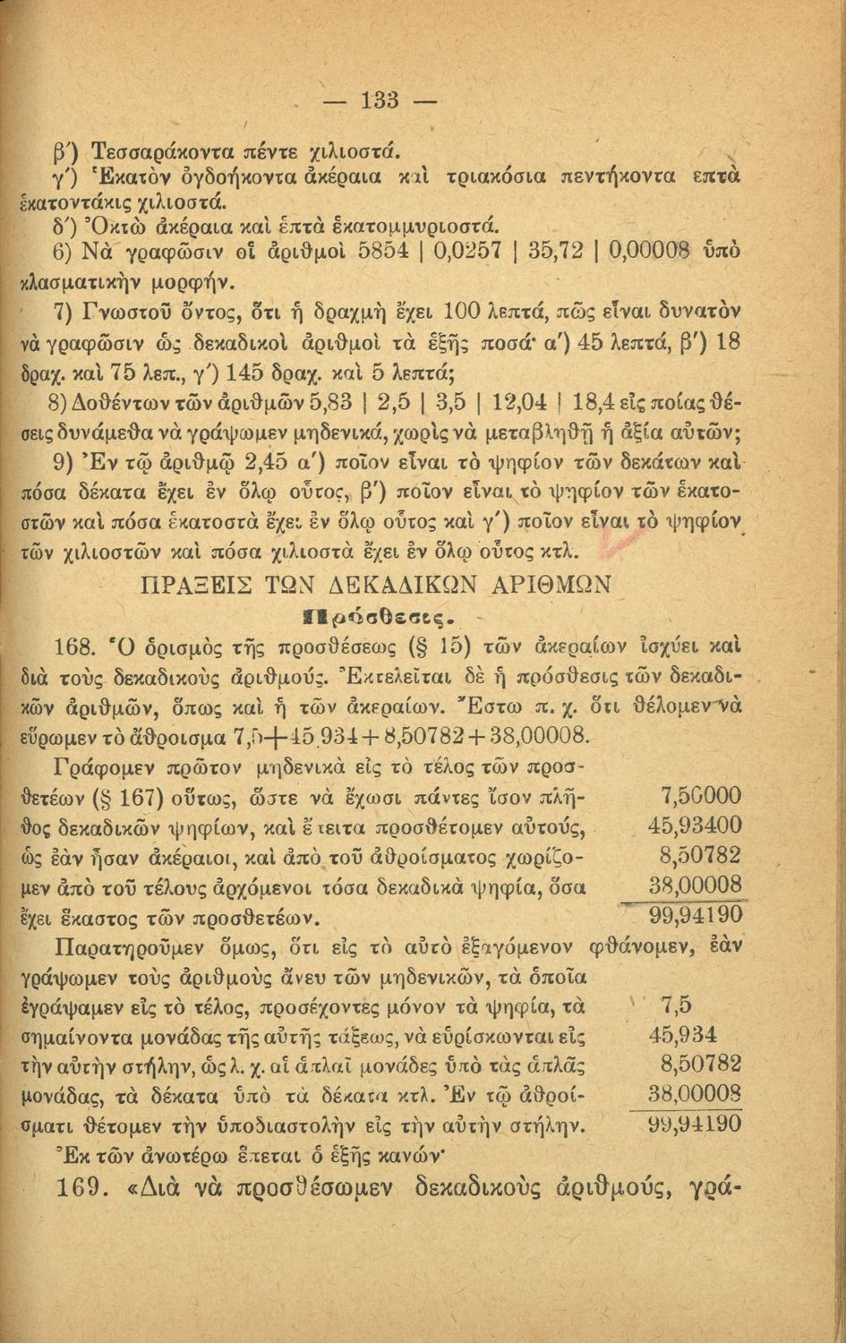 Σχολικό εγχειρίδιο Αριθμητικής για τα Ελληνικά και Αστικά Σχολεία και τα Παρθεναγωγεία που εστιάζει στις αριθμητικές πράξεις, τα κλάσματα, τους δεκαδικούς και συμμιγείς αριθμούς, και τις δυνάμεις. Περιέχει και