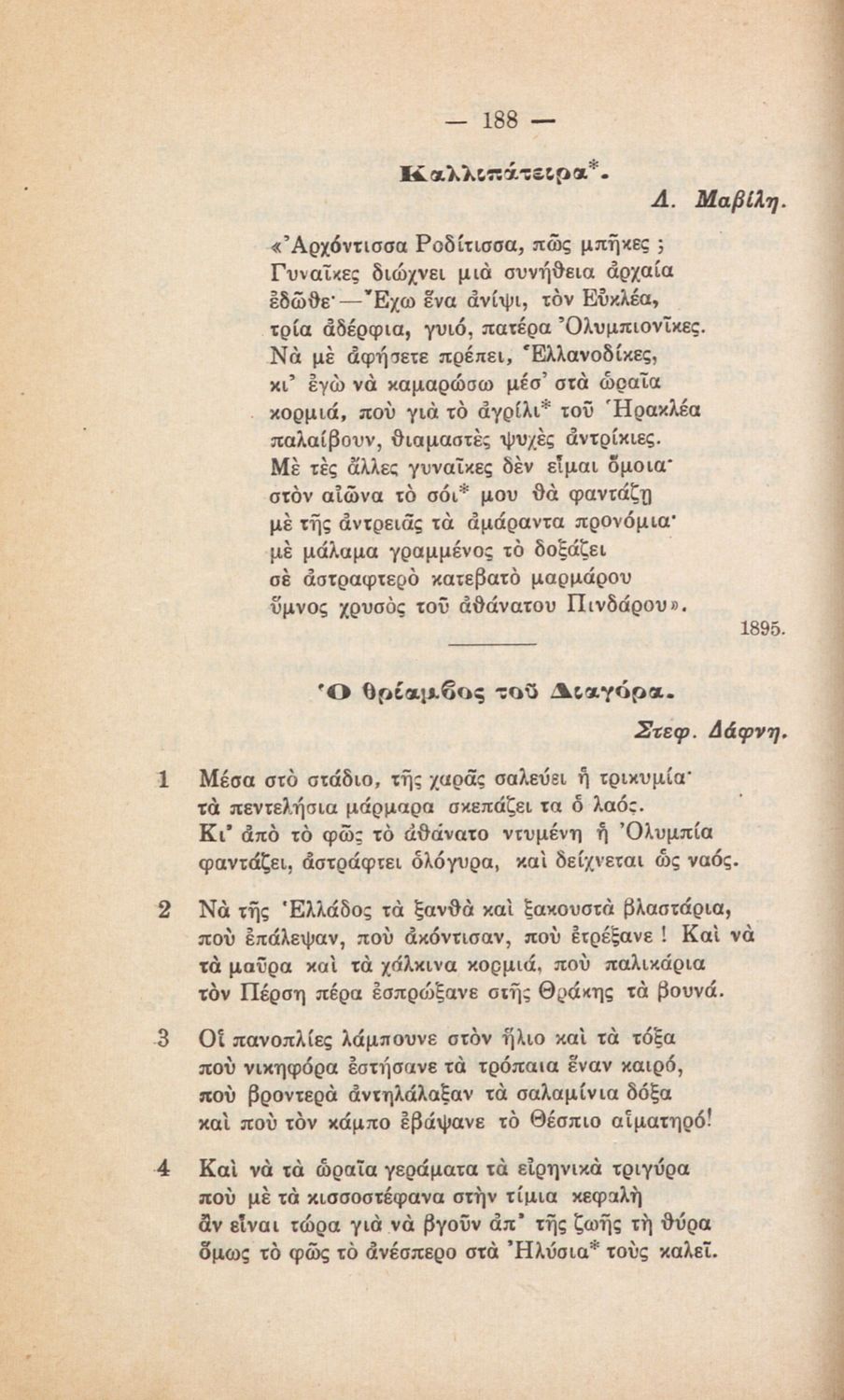 Σχολικό εγχειρίδιο για την Β΄ Γυμνασίου και την Γ΄ Αστικού Θηλέων για το μάθημα των Νέων Ελληνικών. Το εγχειρίδιο αποτελείται από κείμενα πεζού λόγου, επικολυρικά ποιήματα, ωδές, ηθογραφικά διηγήματα, ρητορικά