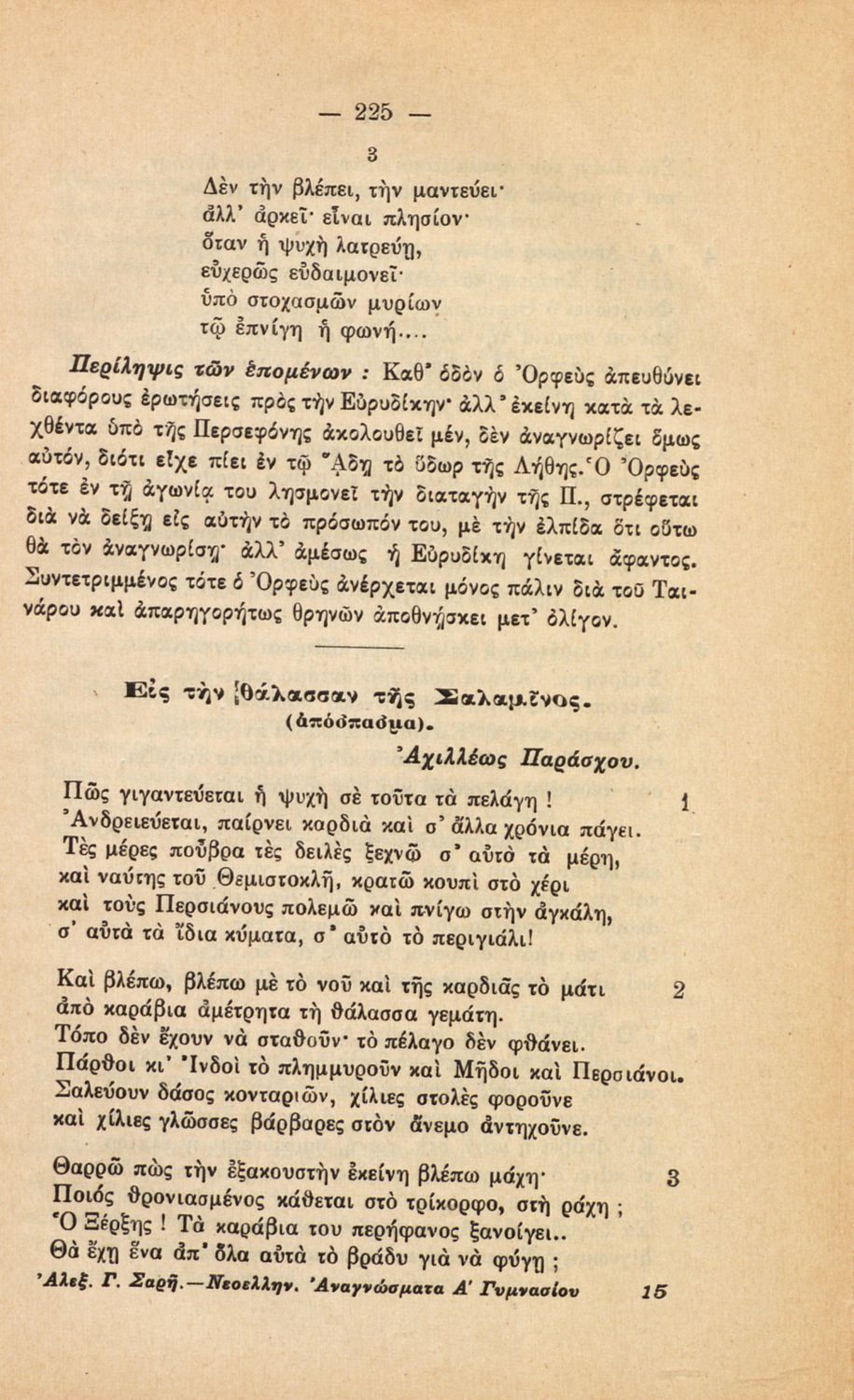 Σχολικό εγχειρίδιο για την Β΄ Γυμνασίου και την Γ΄ Αστικού Θηλέων για το μάθημα των Νέων Ελληνικών. Το εγχειρίδιο αποτελείται από κείμενα πεζού λόγου, επικολυρικά ποιήματα, ωδές, ηθογραφικά διηγήματα, ρητορικά