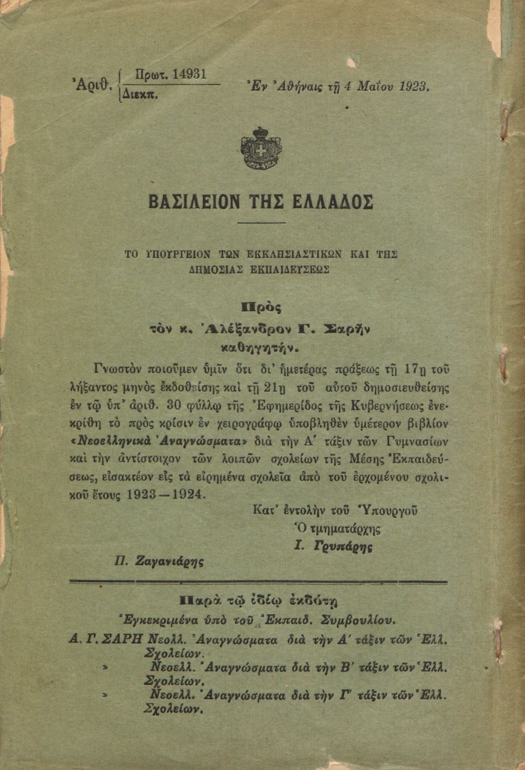 Εκδότης: Μιχ. Σ. Ζηκάκης Έτος έκδοσης: 1923 Τόπος έκδοσης: Αθήνα Υπουργική απόφαση / Σύμβαση: 14931/21-5-1923 Έτος έγκρισης: 1923 |