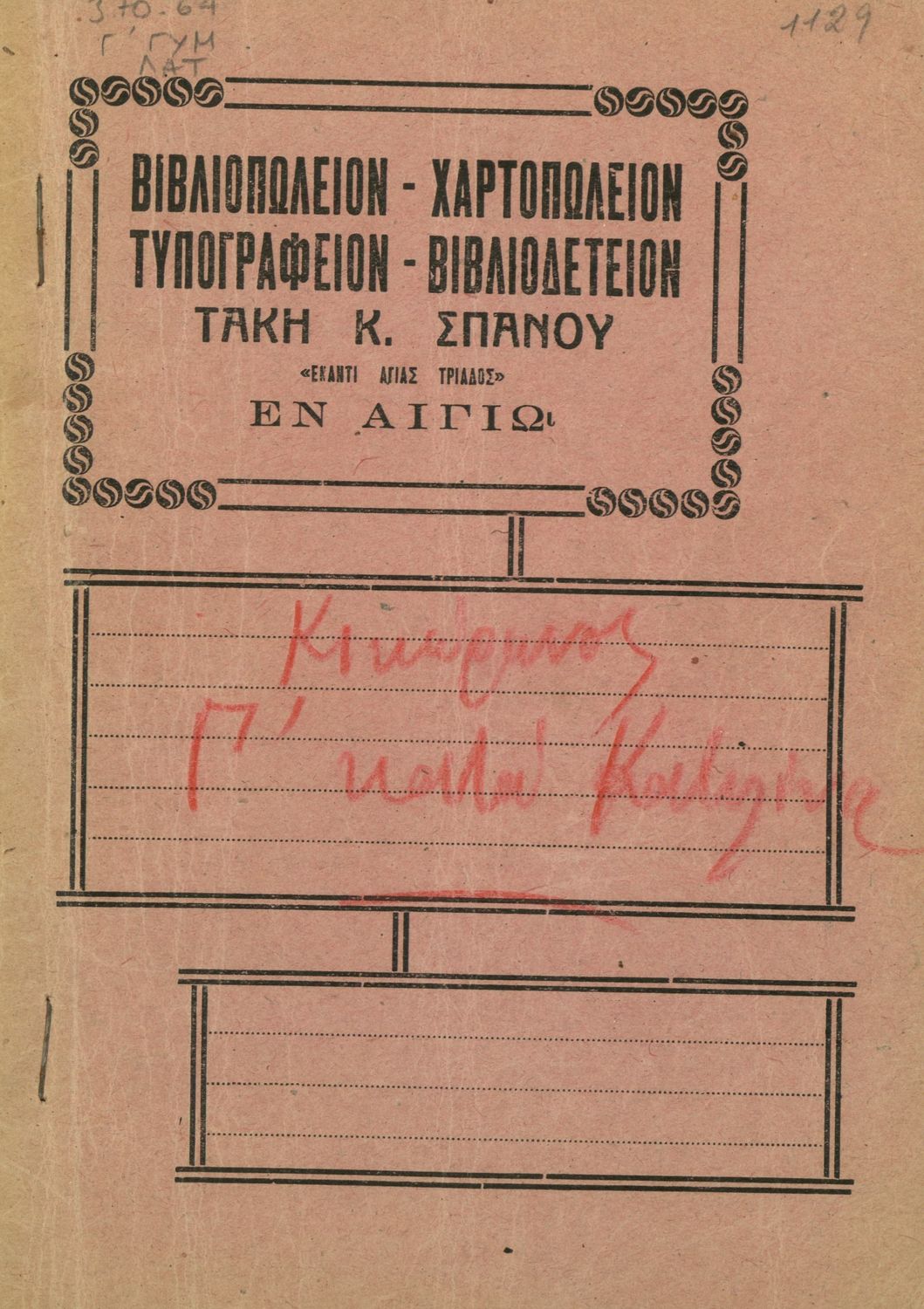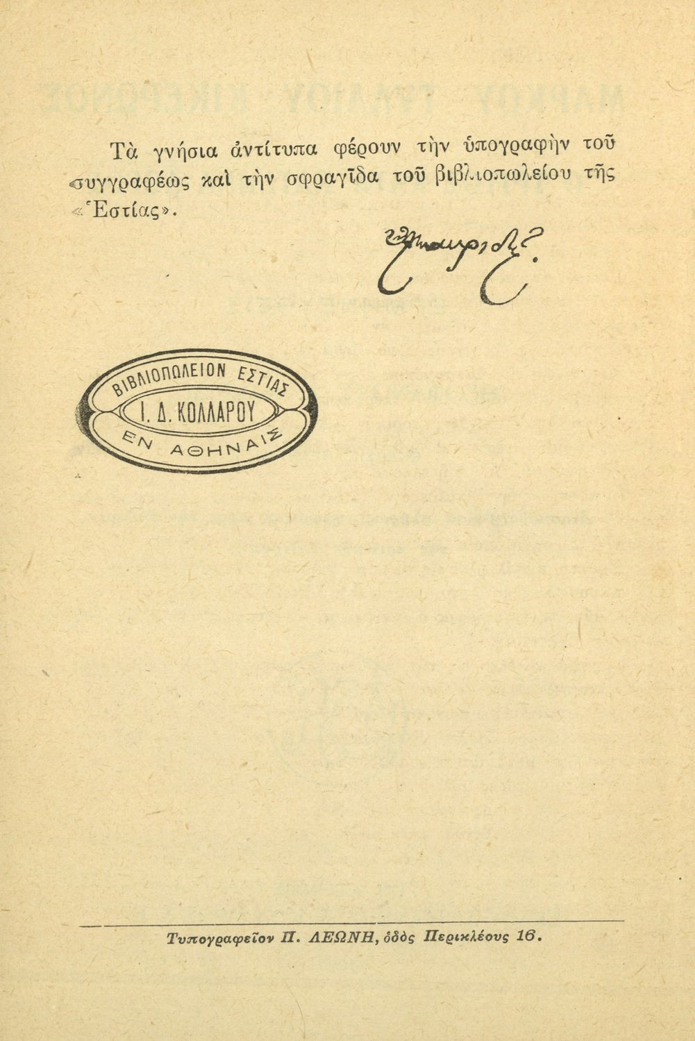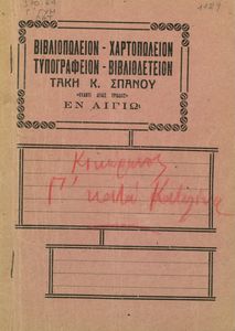 Εκδότης: Ιωάννης Δ. Κολλάρος, Βιβλιοπωλείο της "Εστίας" Έτος έκδοσης: 1927 Τόπος έκδοσης: Αθήνα Έκδοση: 5η Υπουργική απόφαση / Σύμβαση: 21009/ 9-6-1927 Έτος έγκρισης: 1927 |