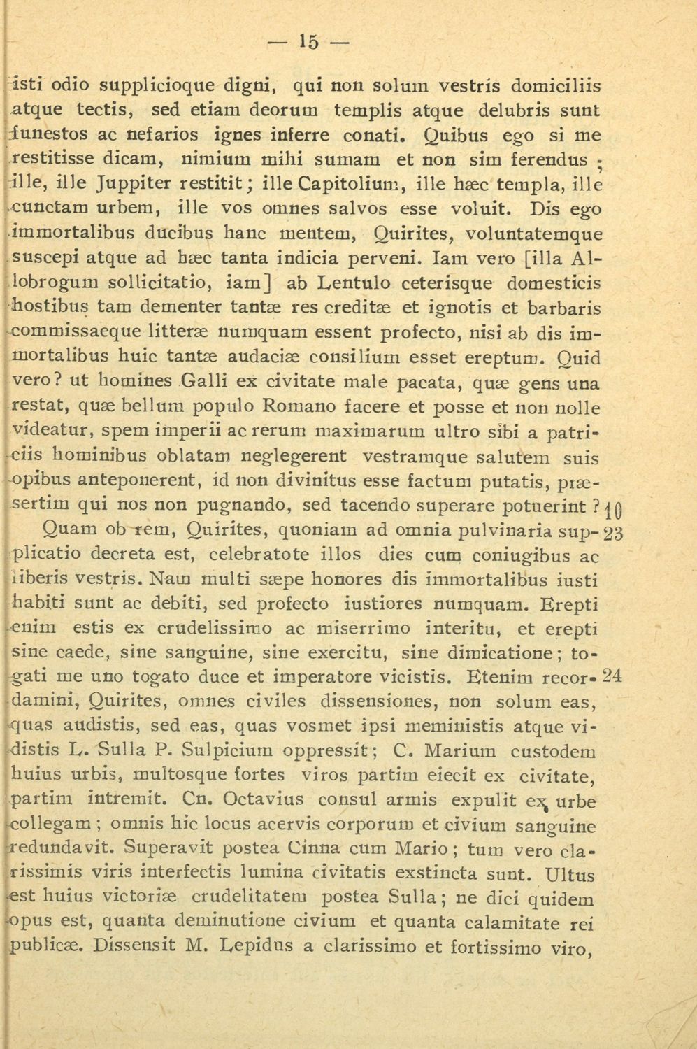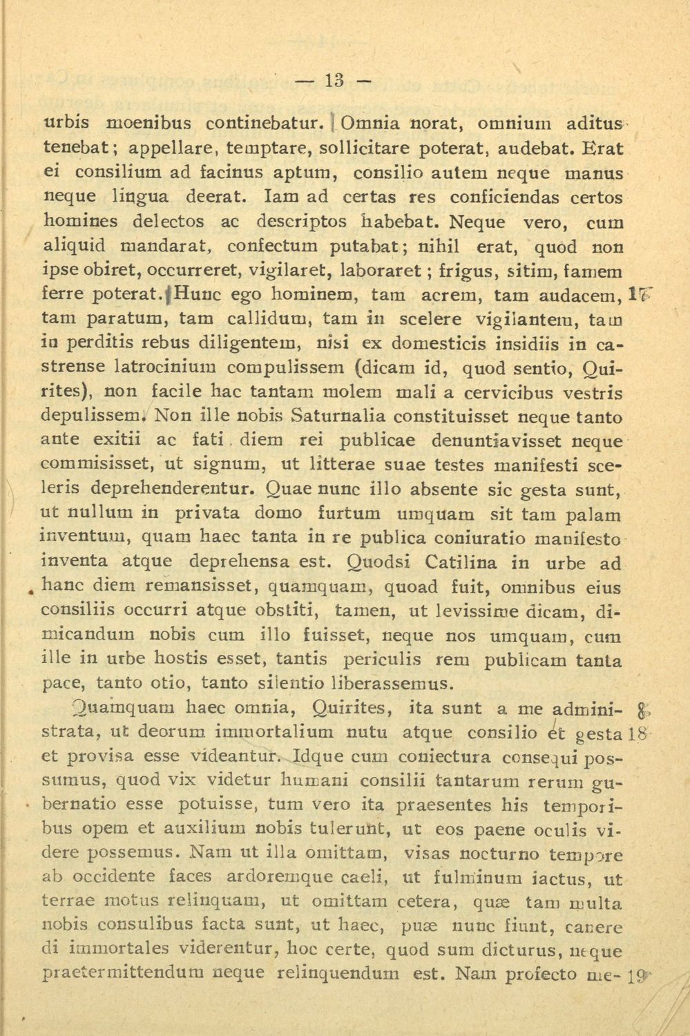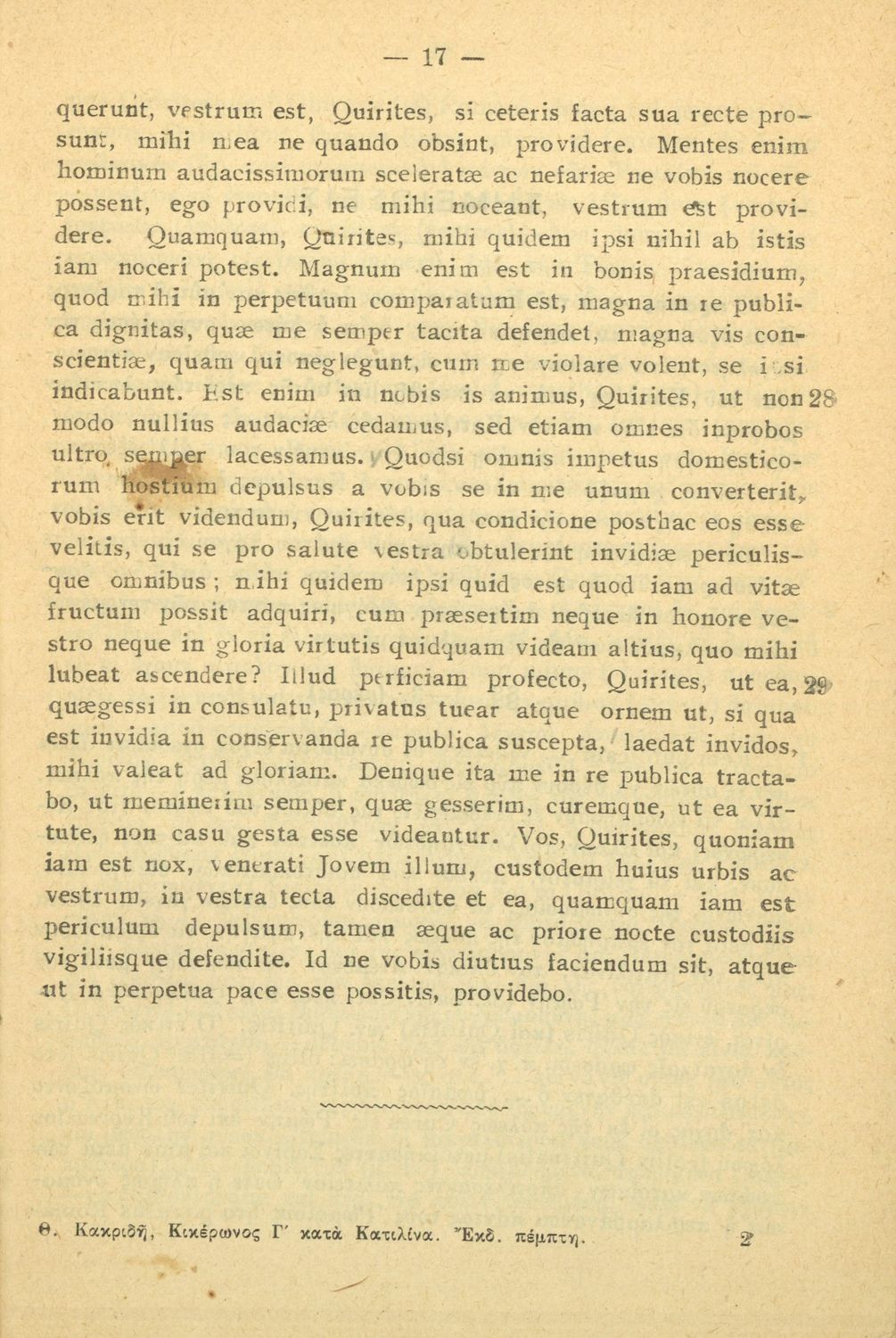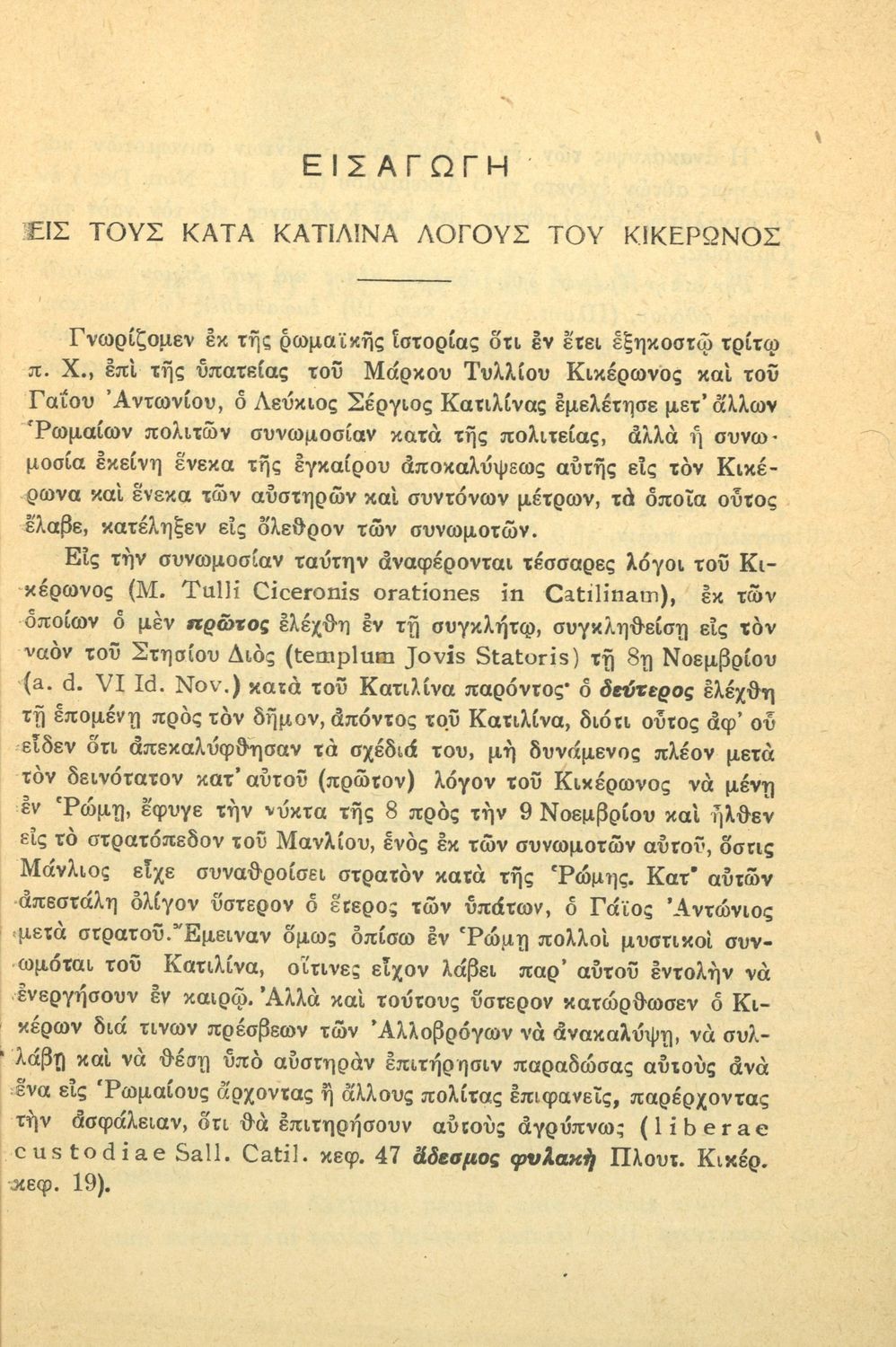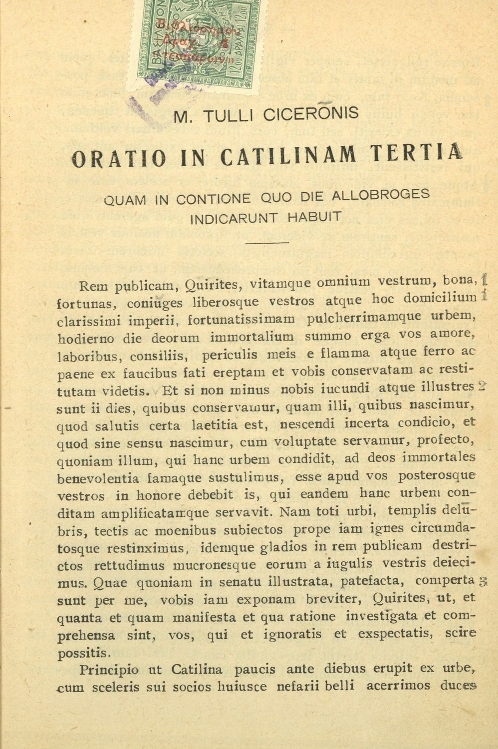 Σχολικό εγχειρίδιο Λατινικών Γ΄ Γυμνασίου που περιλαμβάνει την εισαγωγή στο έργο και τη ζωή του Κικέρωνα, το λατινικό κείμενο του Τρίτου Λόγου κατά Κατιλίνα και ερμηνευτικά, γραμματικά και πραγματολογικά σχόλια.