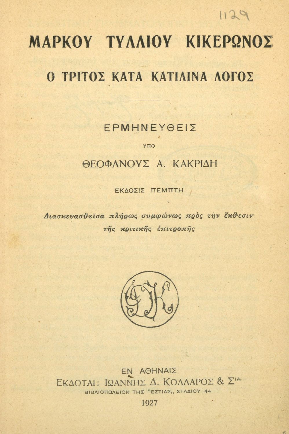 Κωδικός αναγνώρισης: 20-01129 Τίτλος: Μάρκου Τύλλιου Κικέρωνος Ο τρίτος κατά Κατιλίνα Λόγος προς χρήσιν των μαθητών της Γ΄ τάξεως του Γυμνασίου Συγγραφέας: Μάρκος Τύλλιος Κικέρωνας (M. Tullius Cicero), Θεοφάνης Α. Κακριδής (εισαγωγή, σχόλια, σημειώσεις) Μέγεθος και υπόστρωμα: Σχολικό εγχειρίδιο, 19εκ., μαλακό εξώφυλλο, 60 σελίδες. |