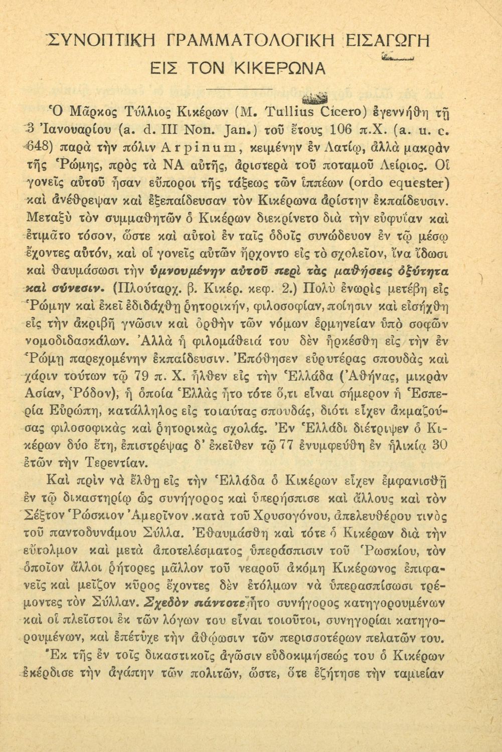 LDR 01568 2200217 4500 035 ## _a20-01129 040 ## _aΚΕΝΕΚ - Εταιρεία Σπουδών Νεοελληνικού Πολιτισμού και Παιδείας 041 ## _ael 100 ## _aΜάρκος Τύλλιος Κικέρωνας (M. Tullius Cicero) _aΘεοφάνης Α. Κακριδής (εισαγωγή _aσχόλια _aσημειώσεις) 110 ## _a1129 245 0# _aΜάρκου Τύλλιου Κικέρωνος Ο τρίτος κατά Κατιλίνα Λόγος προς χρήσιν των μαθητών της Γ΄ τάξεως του Γυμνασίου 250 ## _a5η Έκδοση 260 ## _aΑθήνα _bΙωάννης Δ. Κολλάρος, Βιβλιοπωλείο της "Εστίας" _c1927 300 ## _a60 _c19 520 ## _aΣχολικό εγχειρίδιο Λατινικών Γ΄ Γυμνασίου που περιλαμβάνει την εισαγωγή στο έργο και τη ζωή του Κικέρωνα, το λατινικό κείμενο του Τρίτου Λόγου κατά Κατιλίνα και ερμηνευτικά, γραμματικά και πραγματολογικά σχόλια. 521 ## _aΓ' Γυμνασίου 522 ## _aΕλλάδα 546 ## _aΚαθαρεύουσα 563 ## _aΜαλακό Εξώφυλλο 583 ## _a21009/ 9-6-1927 _c1927 650 #4 _aΓραμματική _aΕρμηνεία _aΚαίσαρας _aΚαπιτώλιο _aΚείμενα _aΚλίσεις _aΟυσιαστικά _aΡώμη _aΣυντακτικό