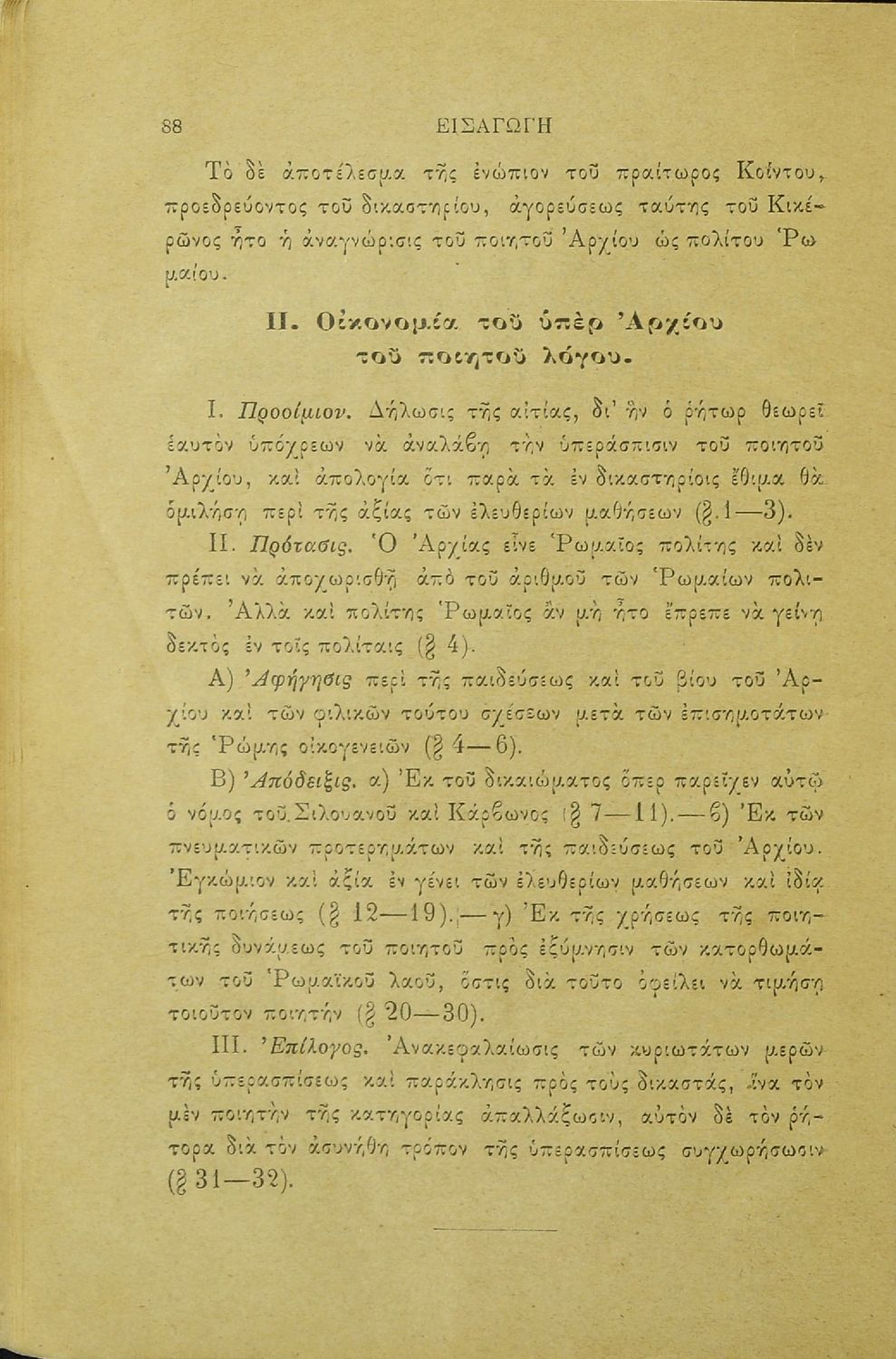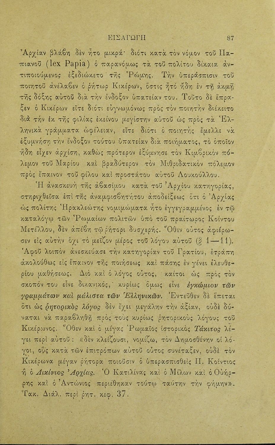 LDR 01139 2200181 4500 035 ## _a20-01134 040 ## _aΚΕΝΕΚ - Εταιρεία Σπουδών Νεοελληνικού Πολιτισμού και Παιδείας 041 ## _ael 100 ## _aΜάρκος Τύλλιος Κικέρωνας (M. Tullius Cicero) _aΕυστράτιος Δ. Τσακαλώτος (επιμ.) 110 ## _a1134 245 0# _aΜ. Τ. Κικέρωνος Λόγοι Oratio pro lege Manilia de imperio Cn. Pompei, Oratio pro Archia poeta 260 ## _aΑθήνα _c1893 300 ## _a128 _c19 520 ## _aΣχολικό εγχειρίδιο Λατινικών που περιλαμβάνει τους Λόγους του Κικέρωνα Oratio pro lege Manilia de imperio Cn. Pompei, Oratio pro Archia poeta, εισαγωγικά σχόλια στη ζωή και το έργο του, και ερμηνευτικά, γραμματικά και πραγματολογικά σχόλια. 522 ## _aΕλλάδα 546 ## _aΚαθαρεύουσα 563 ## _aΜαλακό Εξώφυλλο 650 #4 _aAulus Licinius Archias _aΜιθριδάτες _aΠομπήιος