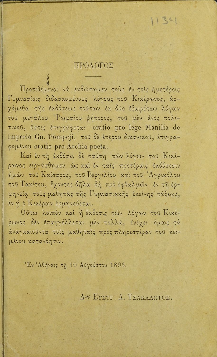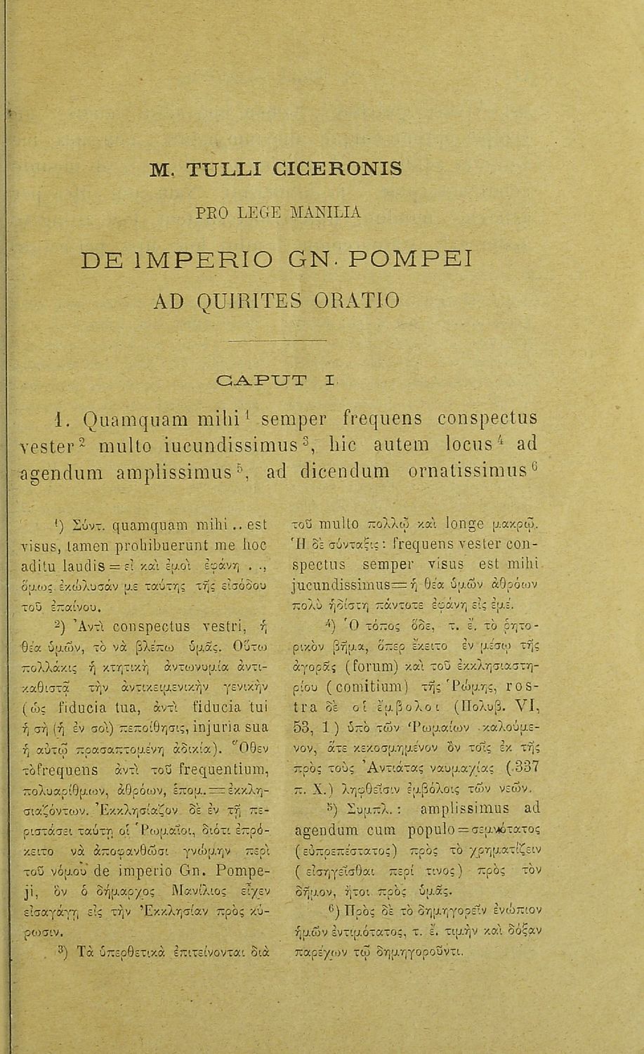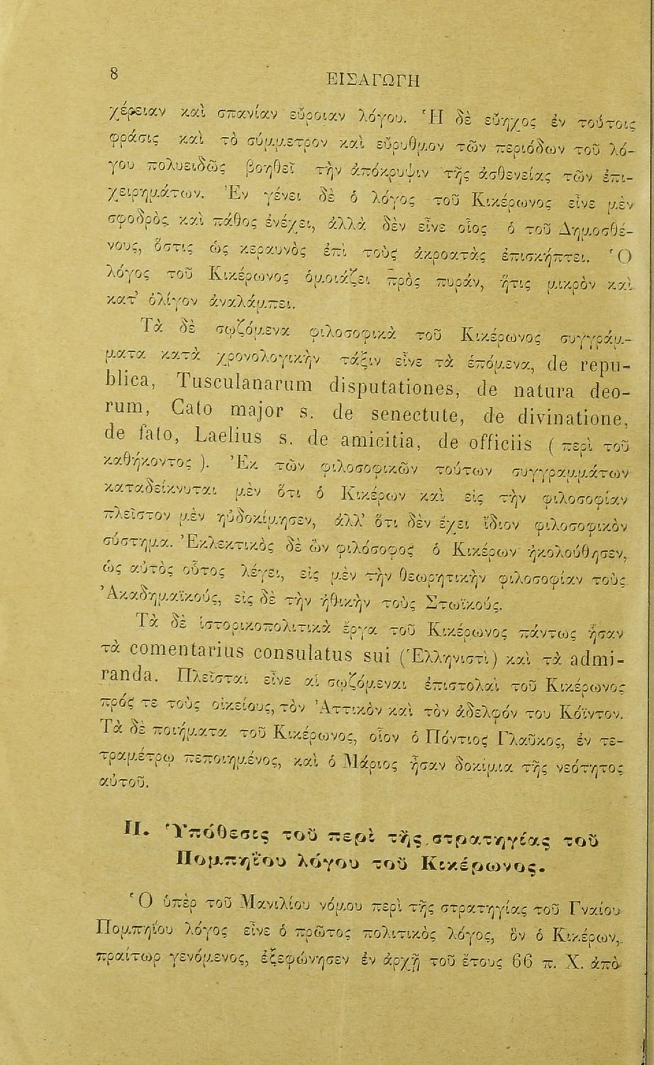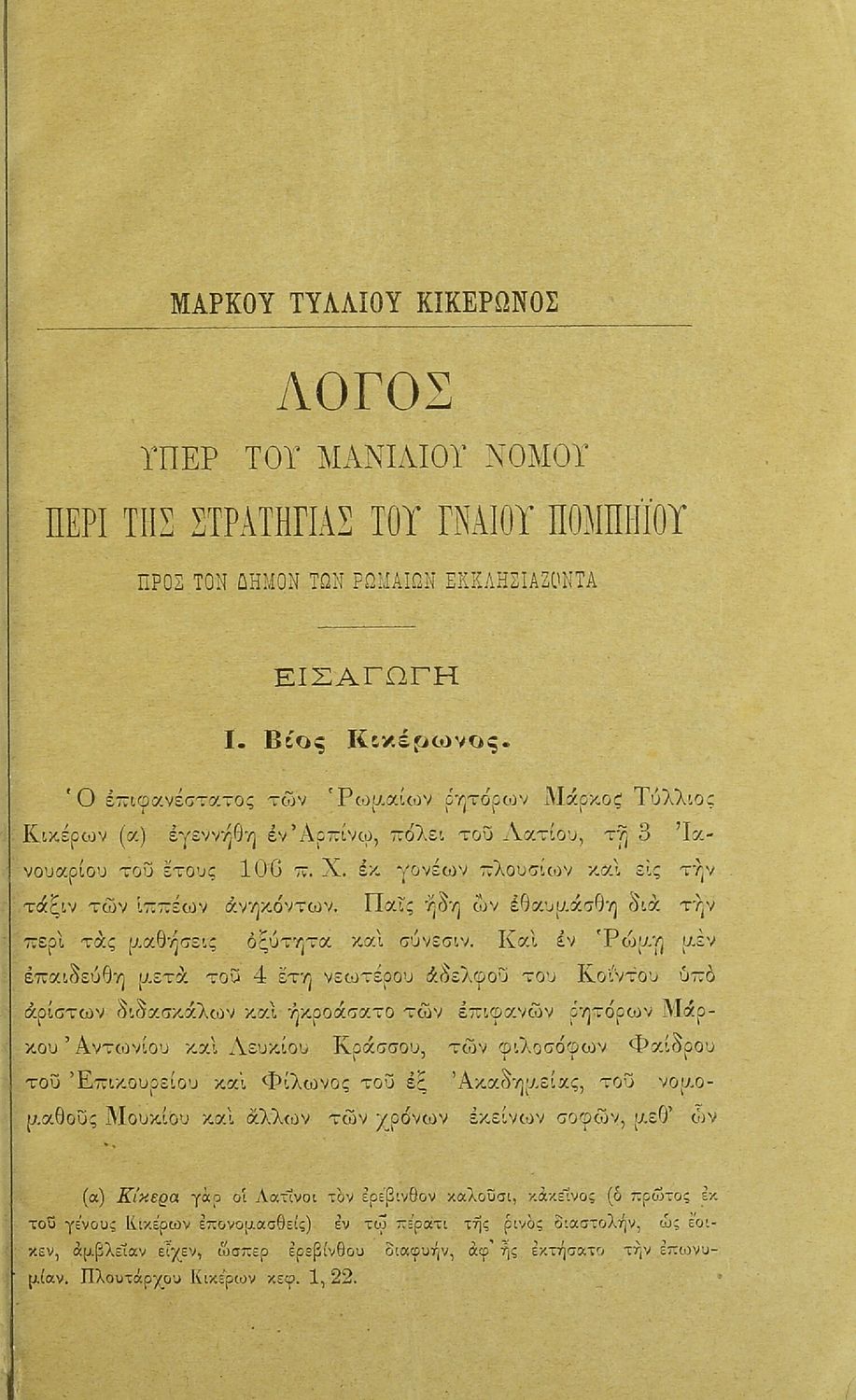 Σχολικό εγχειρίδιο Λατινικών που περιλαμβάνει τους Λόγους του Κικέρωνα Oratio pro lege Manilia de imperio Cn. Pompei, Oratio pro Archia poeta, εισαγωγικά σχόλια στη ζωή και το έργο του, και ερμηνευτικά, γραμματικά και πραγματολογικά σχόλια.