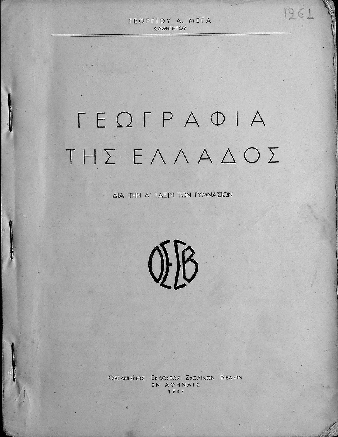 Κωδικός αναγνώρισης: 20-01261 Τίτλος: Γεωγραφία της Ελλάδος διά την Α΄ τάξιν των Γυμνασίων Συγγραφέας: Γεώργιος Α. Μέγας Εικονογράφος: Αλέξανδρος Φαλτάϊτς Μέγεθος και υπόστρωμα: Σχολικό εγχειρίδιο, 19εκ., μαλακό εξώφυλλο, 222 σελίδες. Σκίτσα (ασπρόμαυρα). |