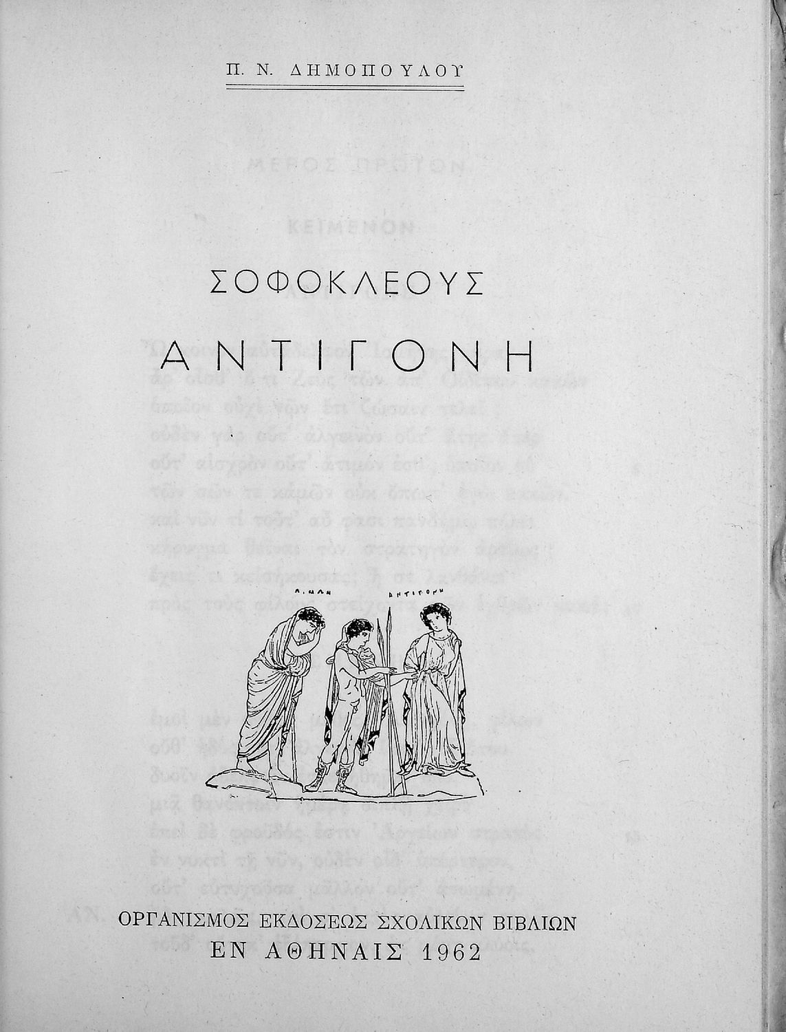 Σχολικό εγχειρίδιο Αρχαίων Ελληνικών της ΣΤ΄ Γυμνασίου. Το βιβλίο περιέχει δύο τραγωδίες του Σοφοκλή, τον Οιδίπους Τύραννο και την Αντιγόνη. Τα έργα αυτά συνοδεύονται από αναλύσεις λεξιλογικές και αναφορικά με