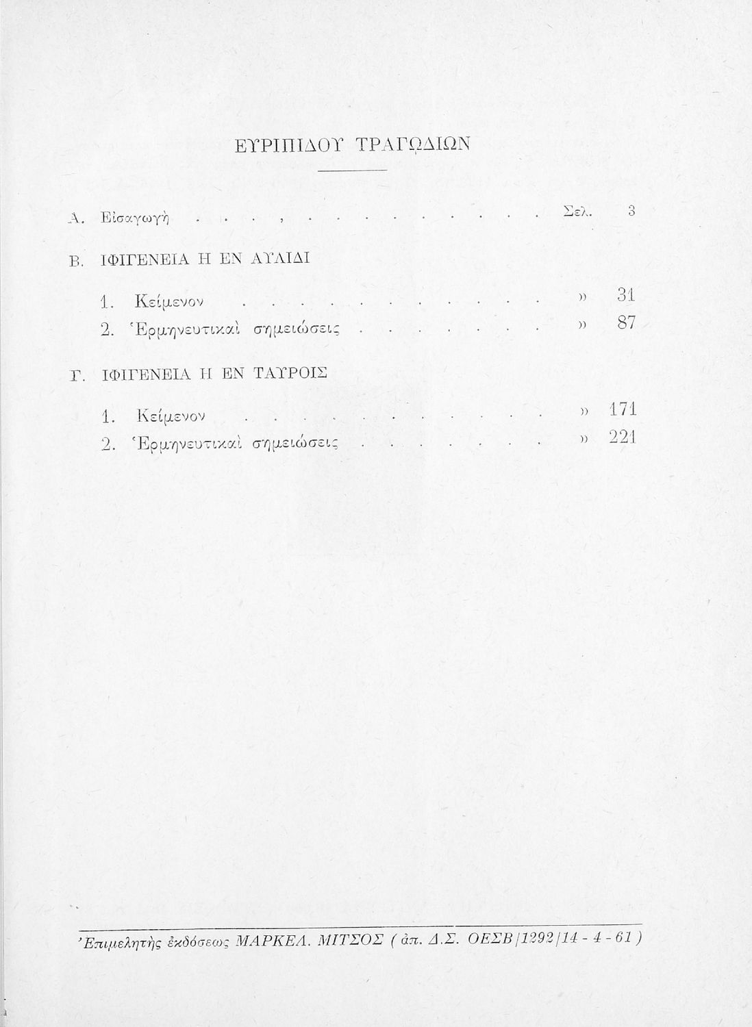 Τίτλος: Ευριπίδου Τραγωδίαι Ιφιγένεια η εν Αυλίδι και εν Ταύροις δια την Ε΄ τάξιν των Εξατάξιων Γυμνασίων