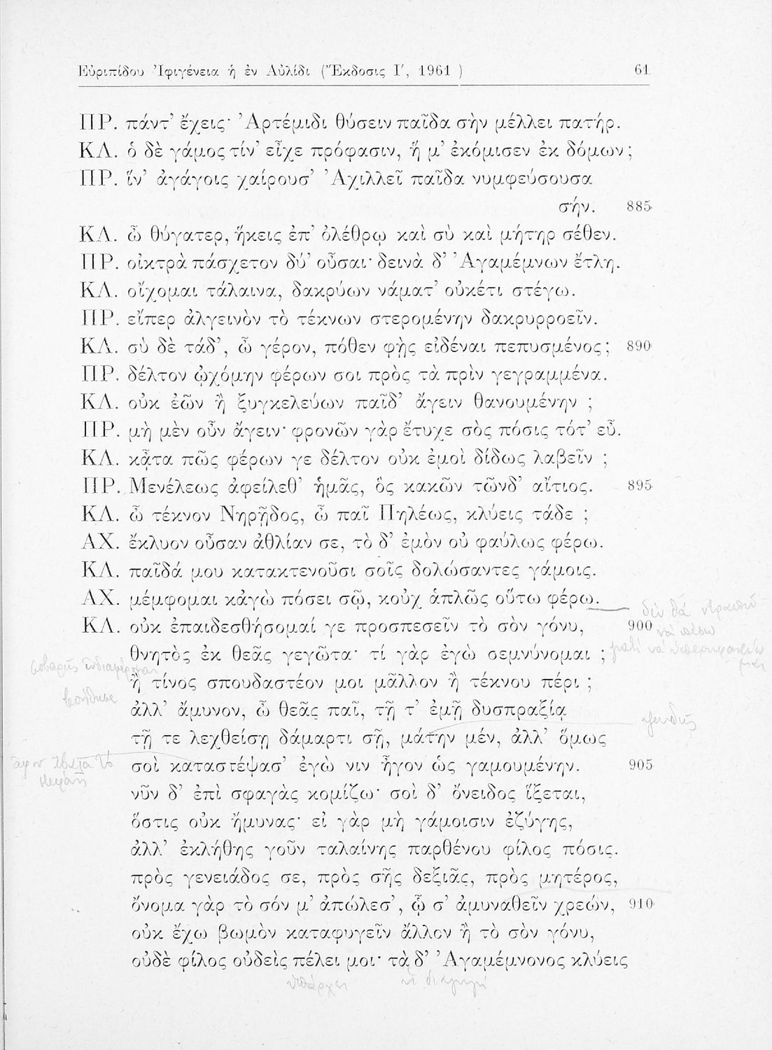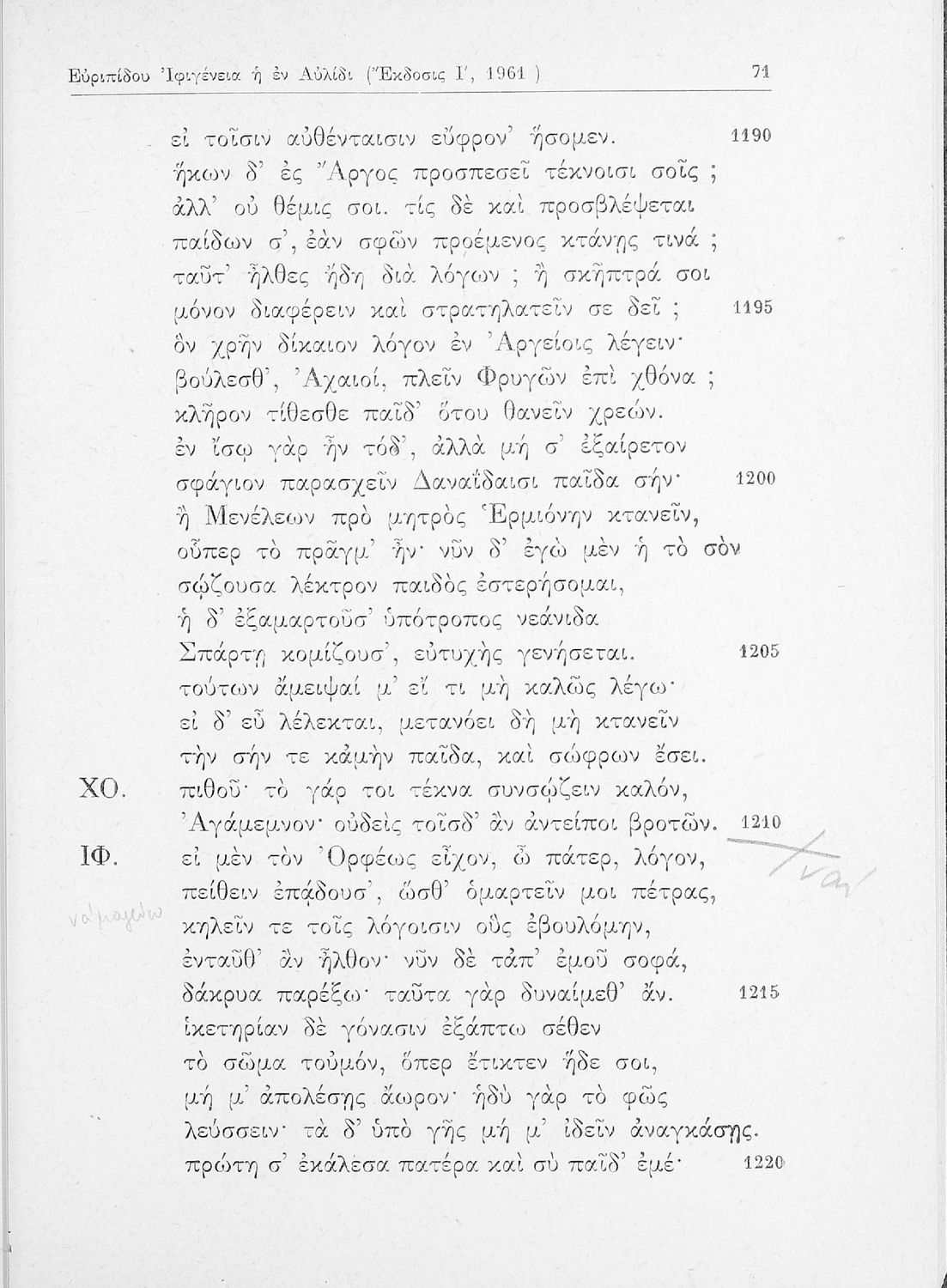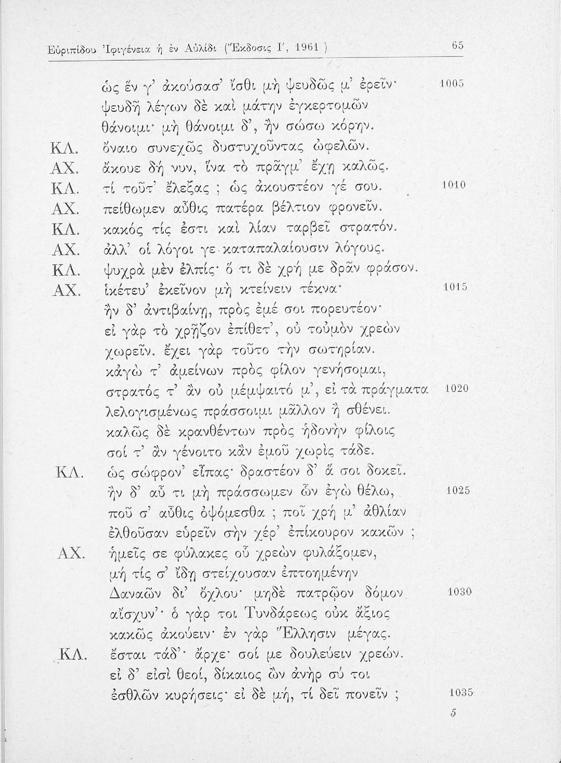 Μαθητικό βοήθημα Αρχαίων Ελληνικών για την Ε' Γυμνασίου που περιλαμβάνει μετάφραση, ερμηνευτικά, γραμματικά και συντακτικά σχόλια στην Ιφιγένεια η εν Αυλίδι.