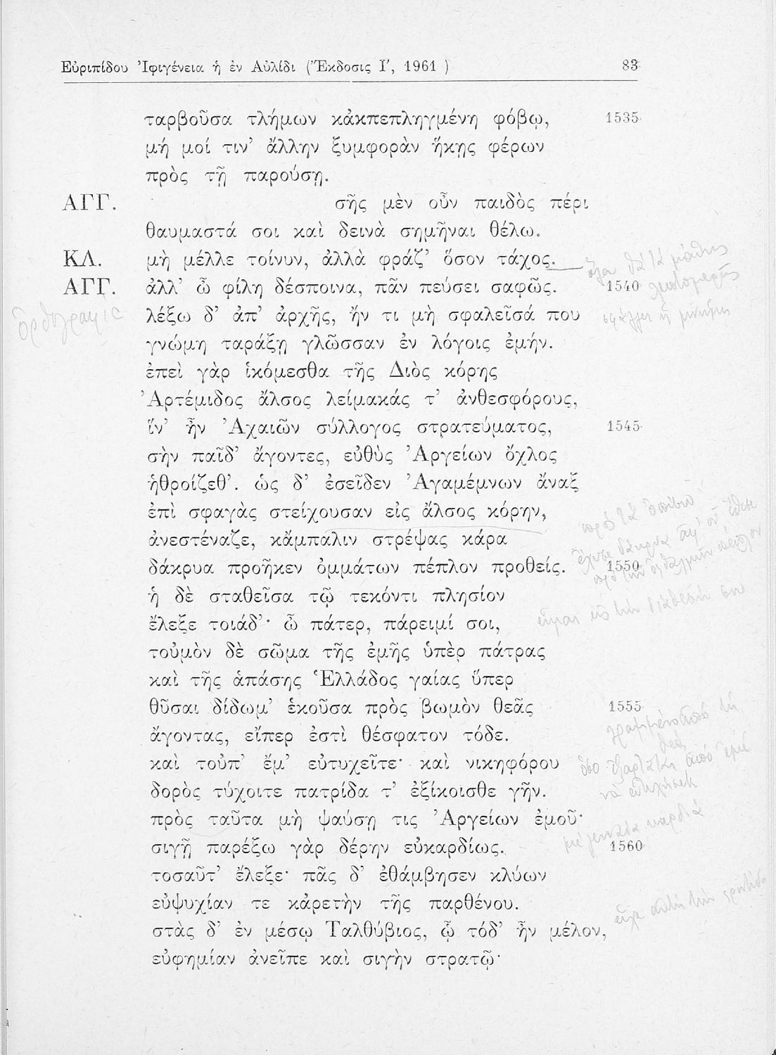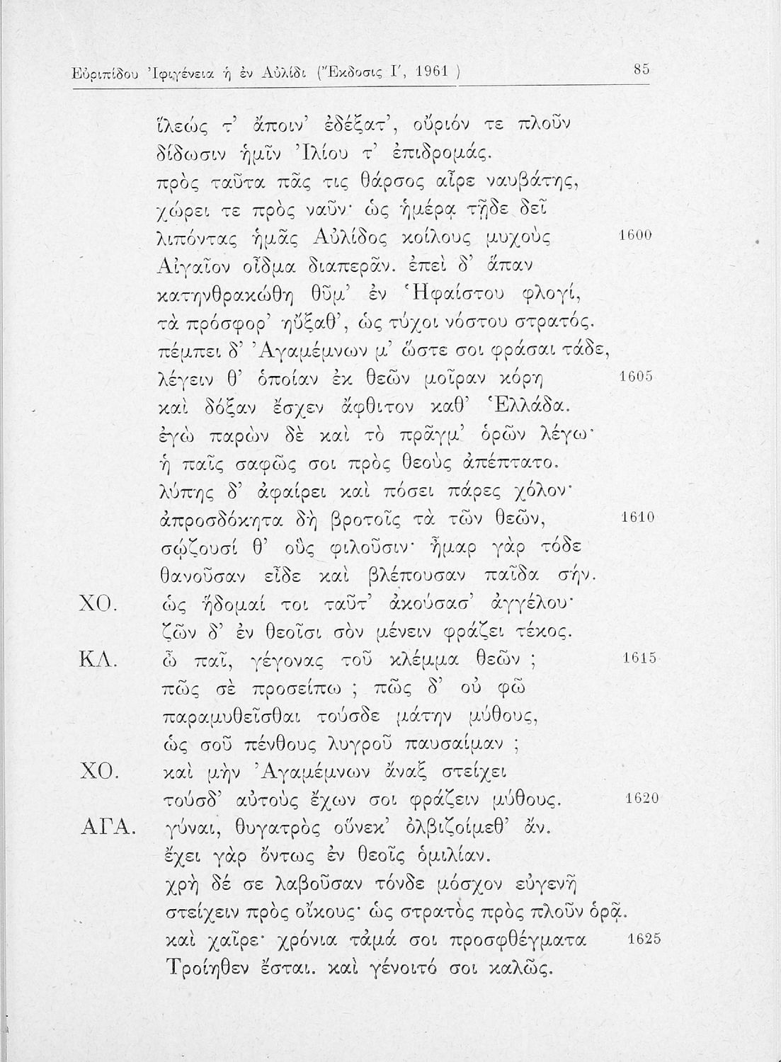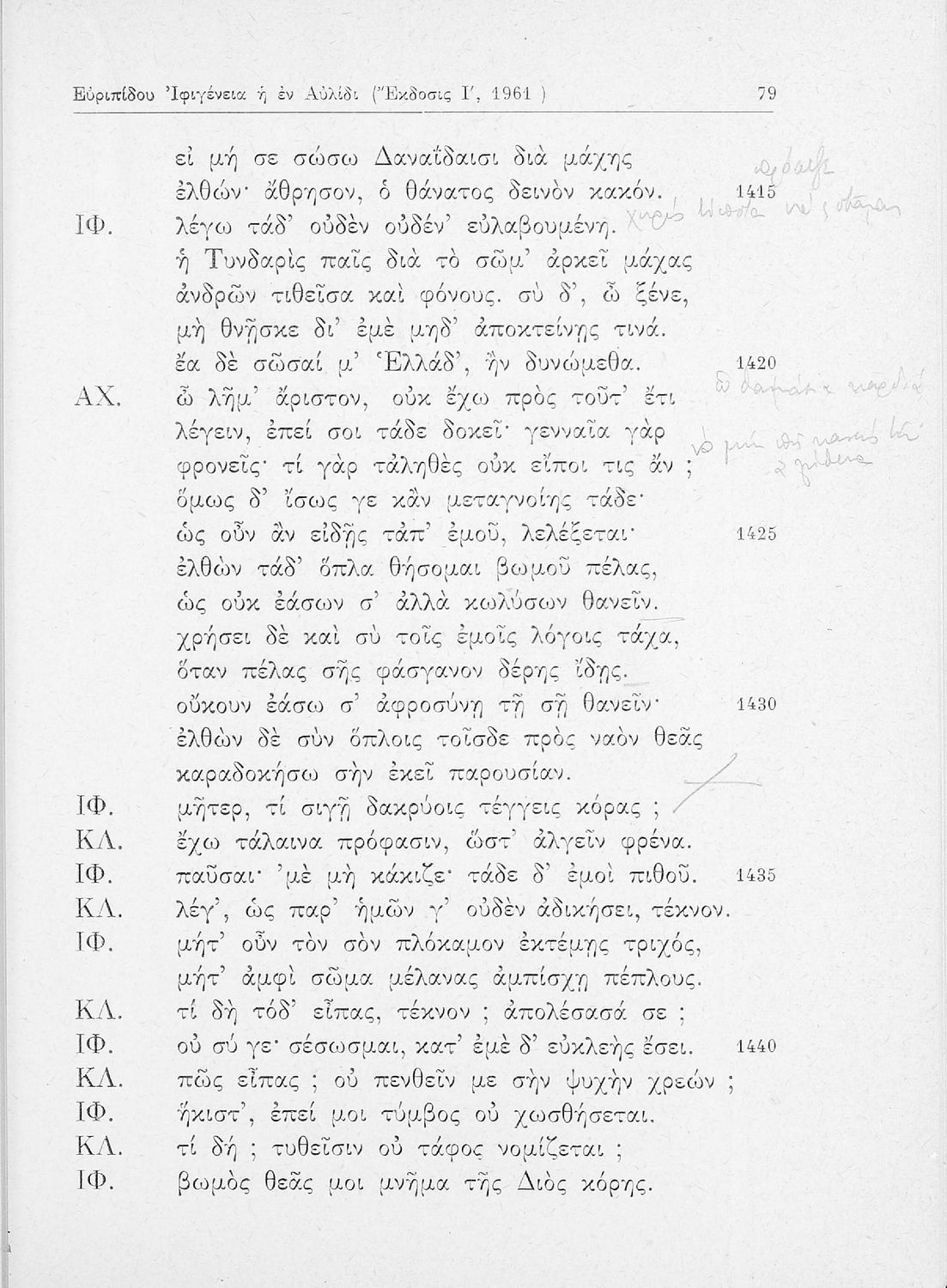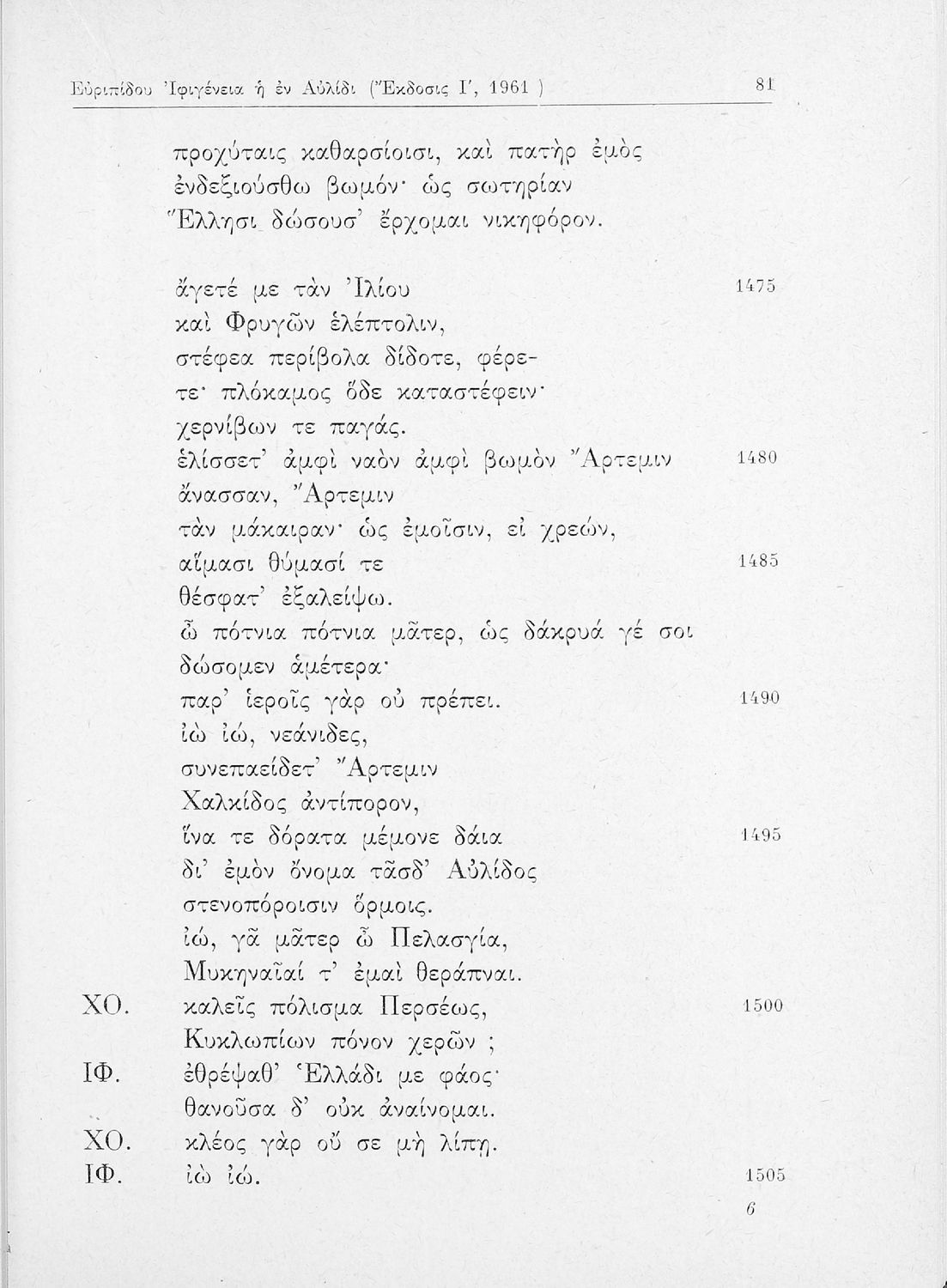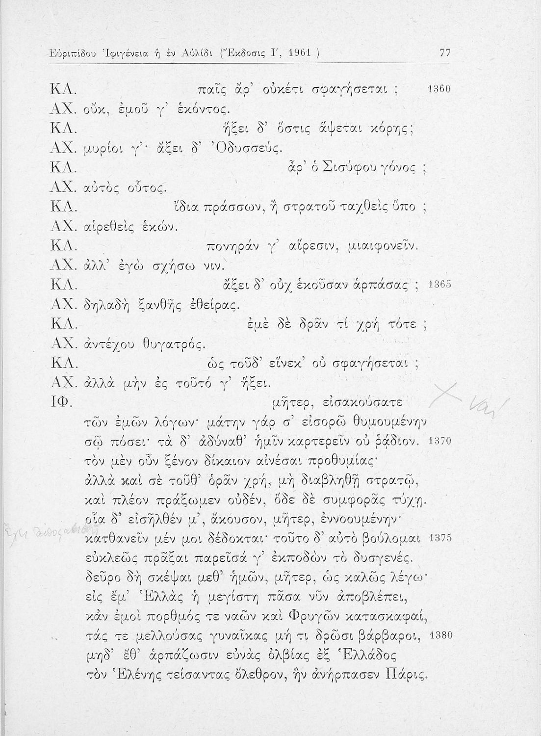 Μαθητικό βοήθημα Αρχαίων Ελληνικών για την Ε' Γυμνασίου που περιλαμβάνει μετάφραση, ερμηνευτικά, γραμματικά και συντακτικά σχόλια στην Ιφιγένεια η εν Αυλίδι.