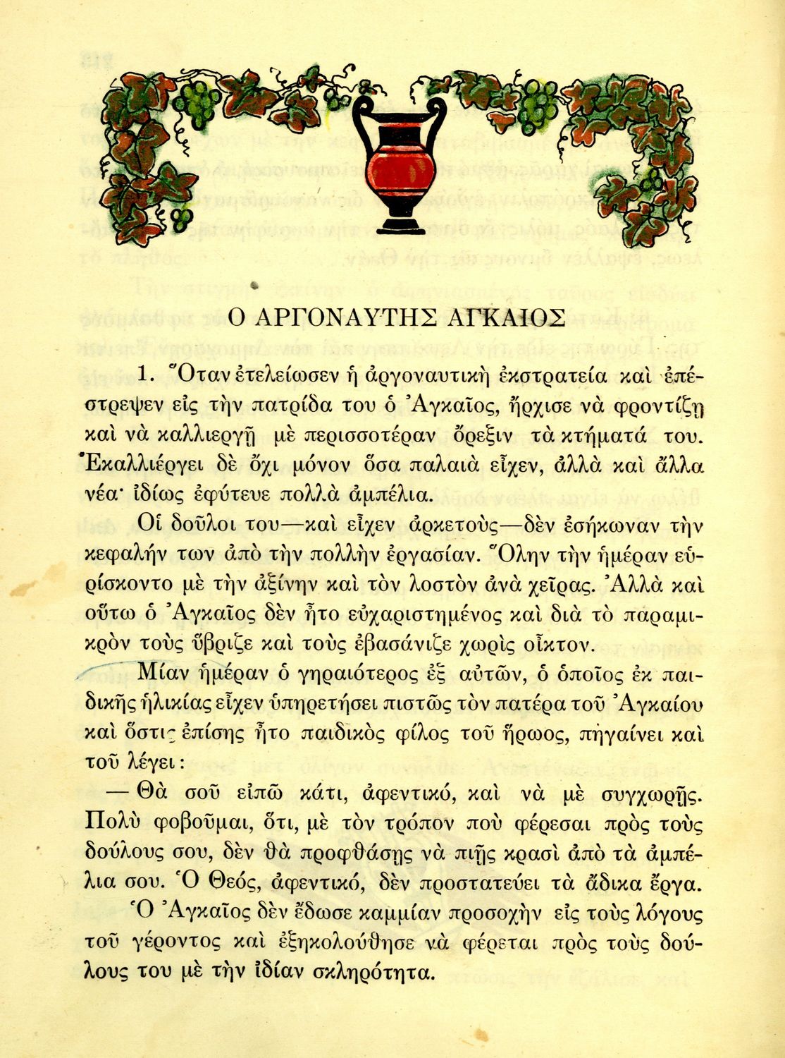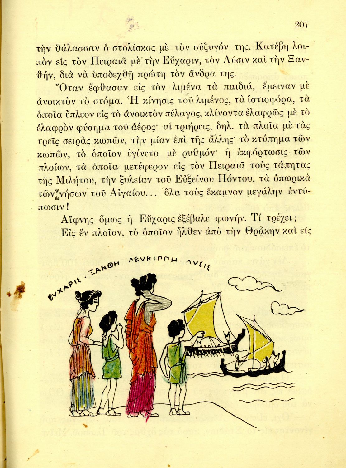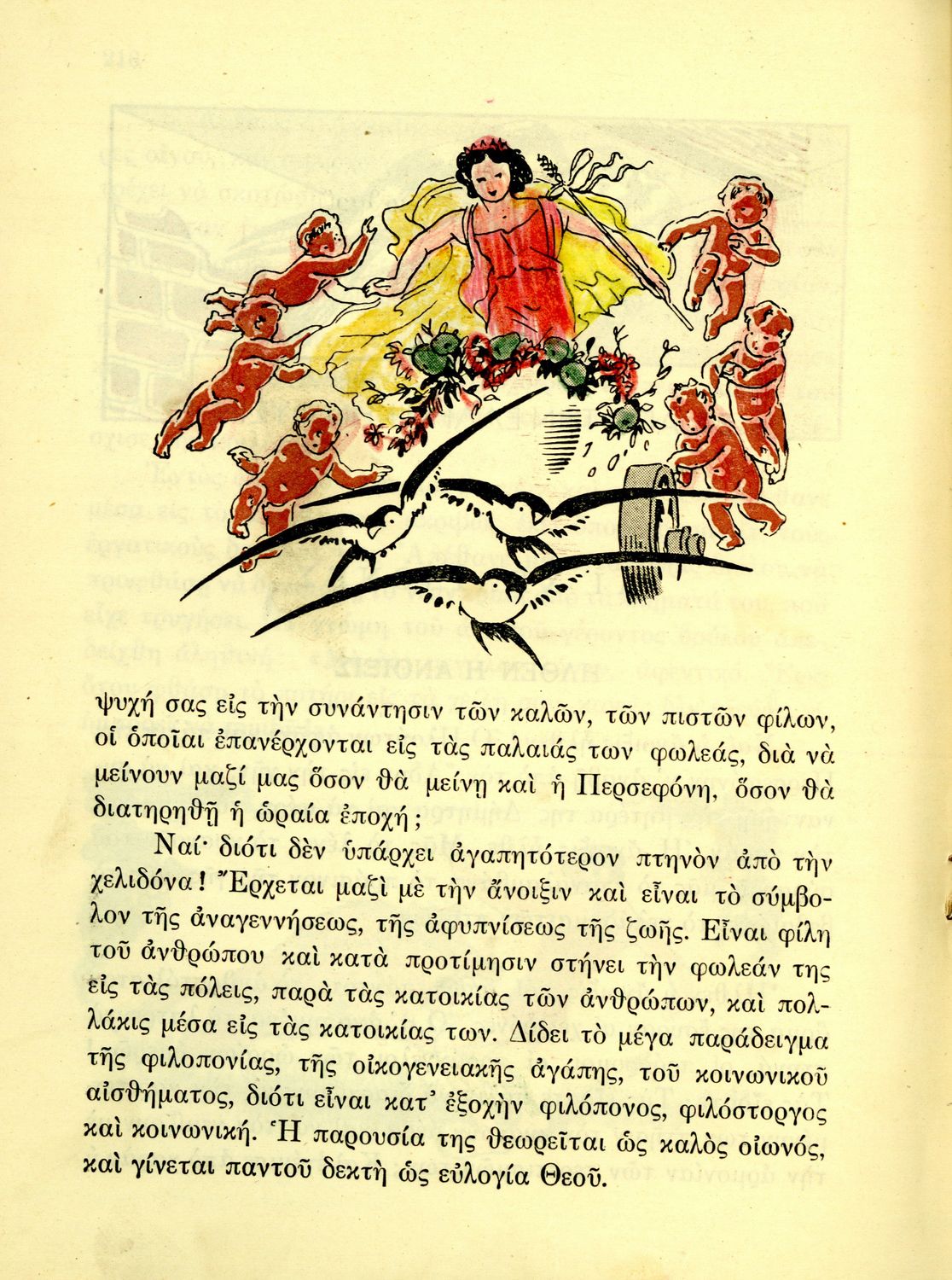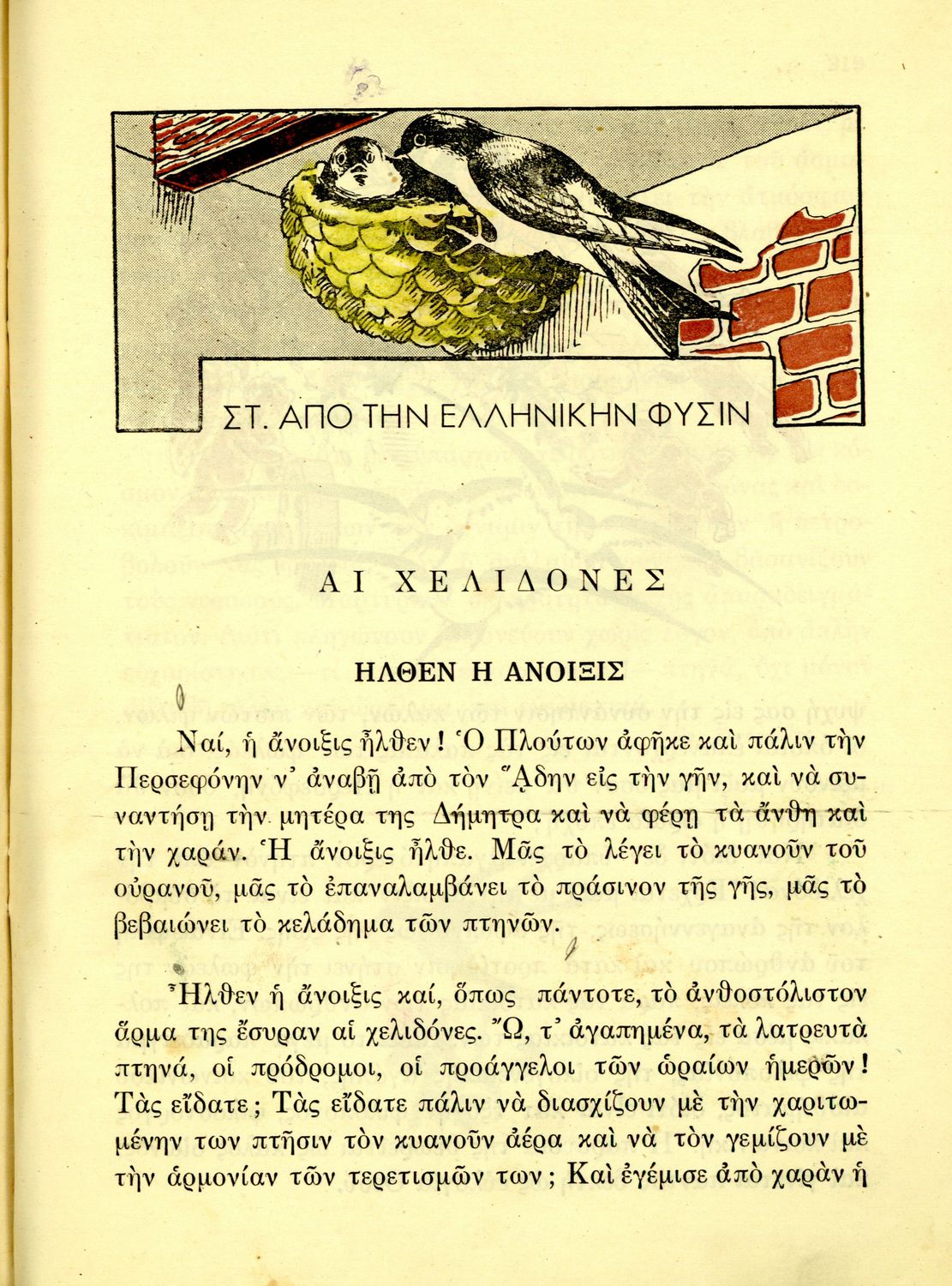 Αναγνωστικό Δ΄ Δημοτικού που περιέχει πεζά και ποιήματα εμπνευσμένα από την ελληνική ιστορία και μυθολογία, την κοινωνική ζωή και την ελληνική φύση.