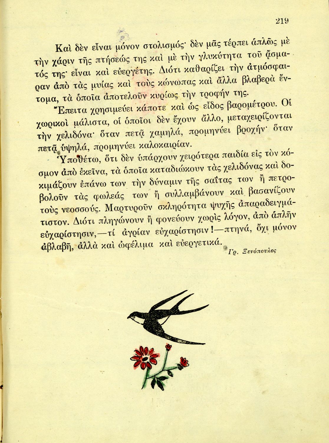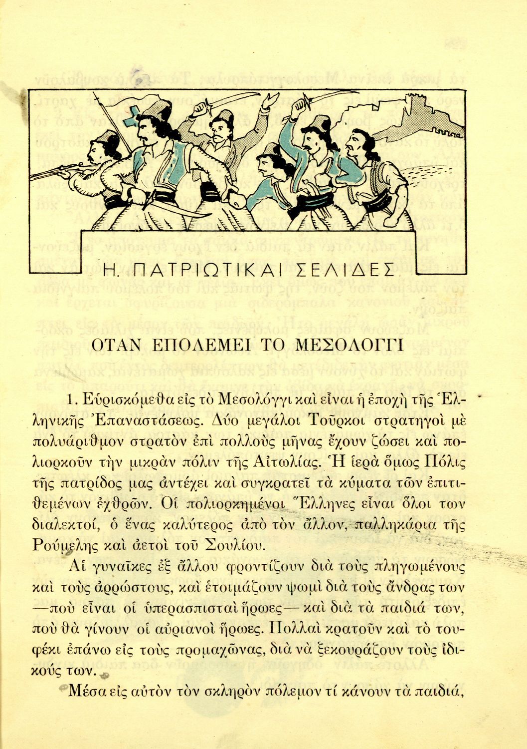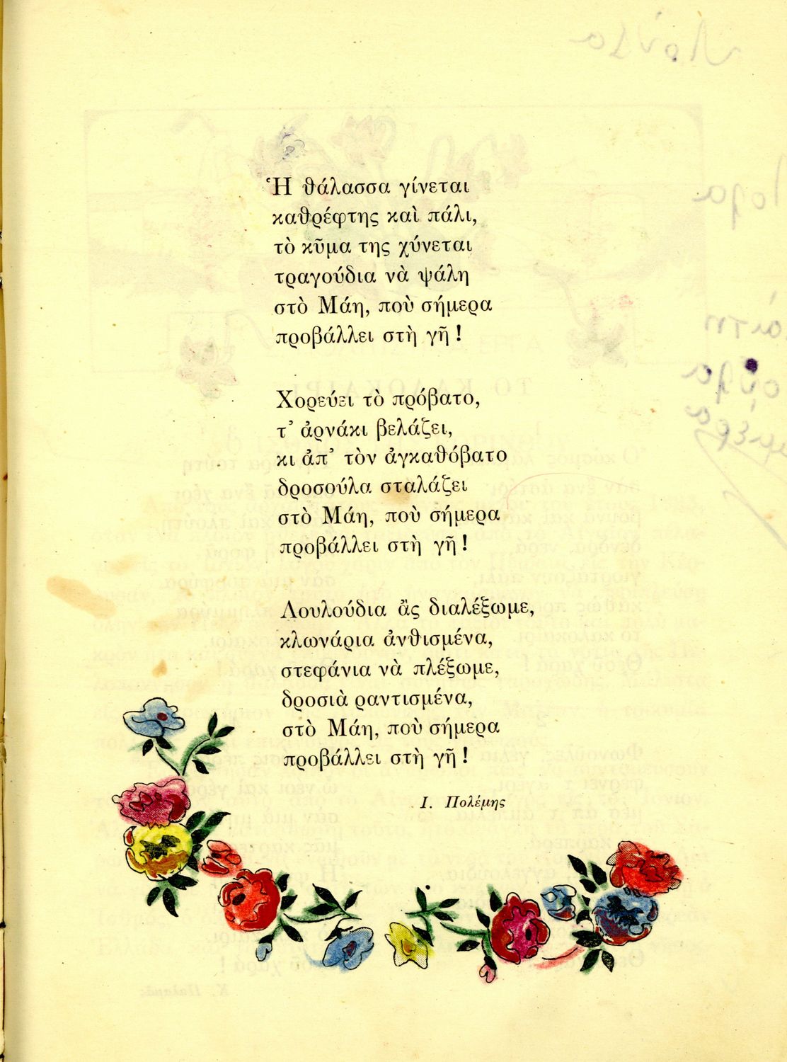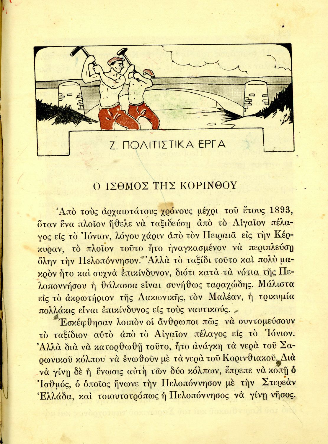 Αναγνωστικό Δ΄ Δημοτικού που περιέχει πεζά και ποιήματα εμπνευσμένα από την ελληνική ιστορία και μυθολογία, την κοινωνική ζωή και την ελληνική φύση.