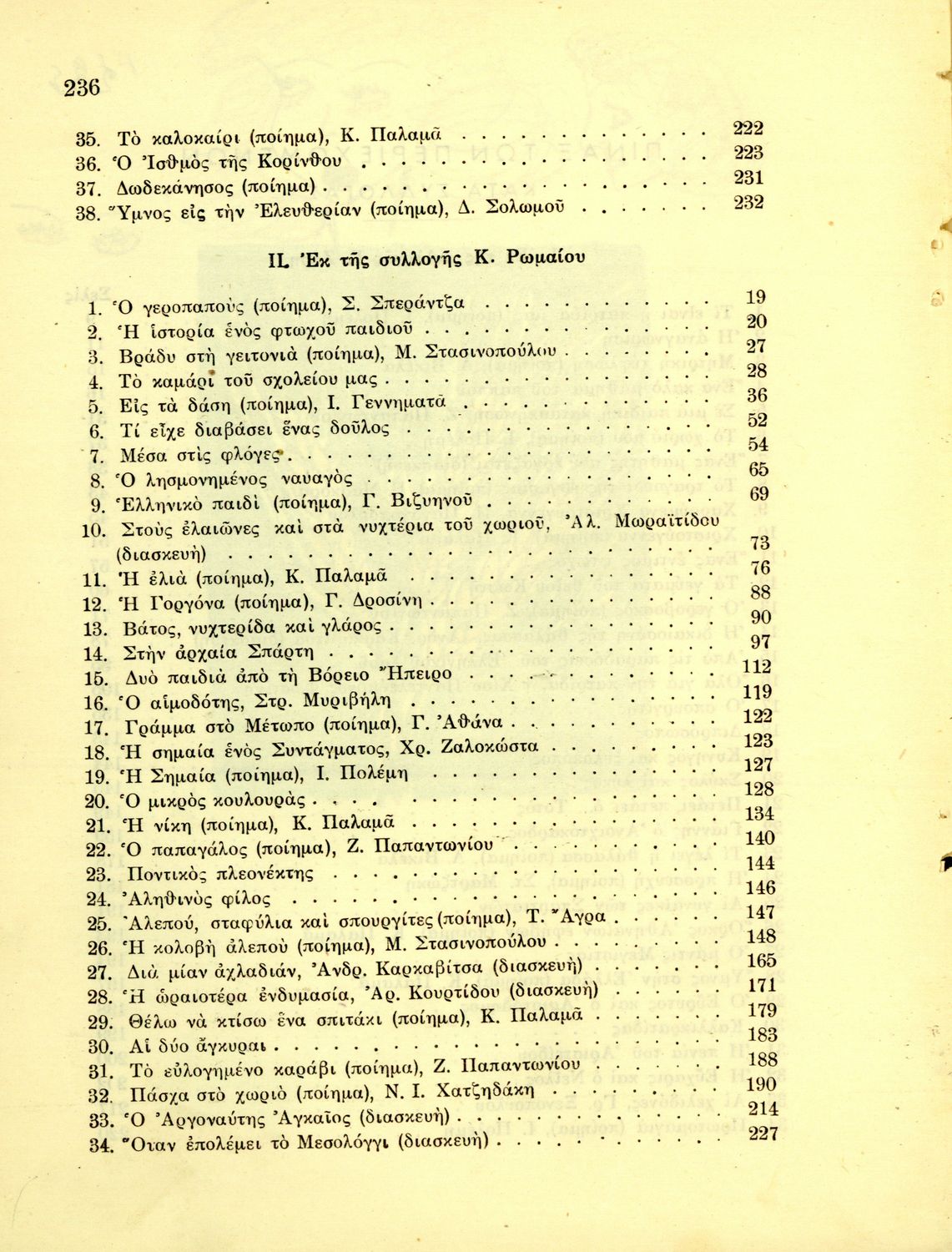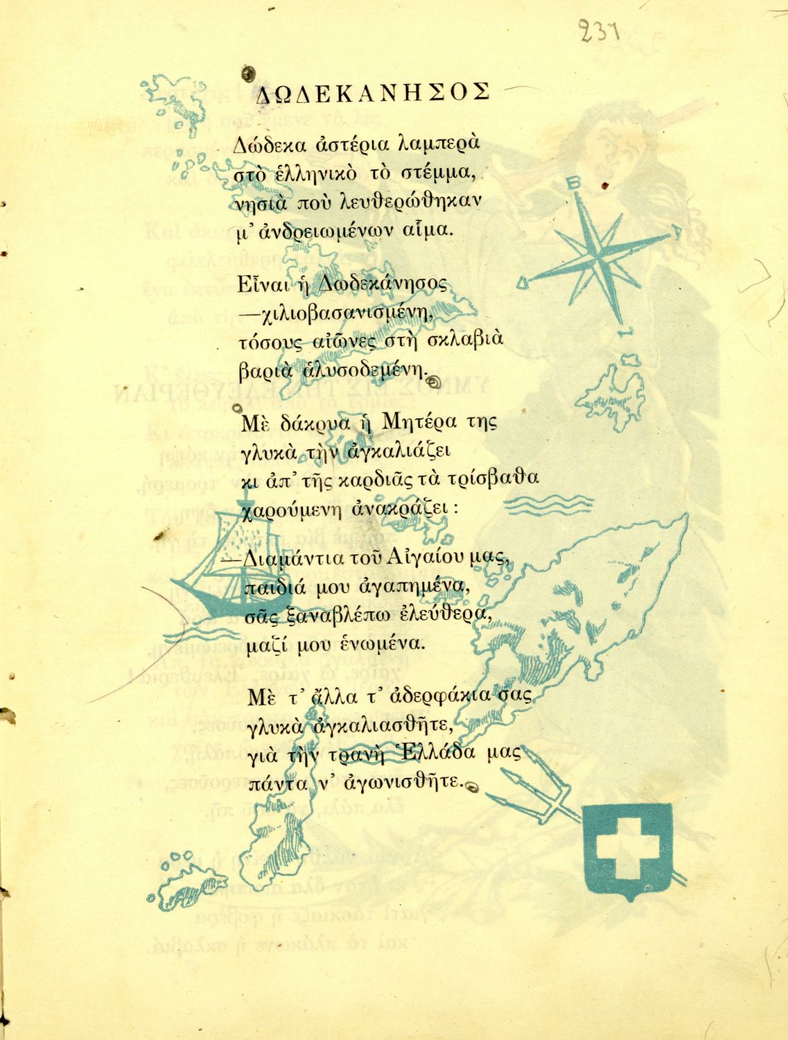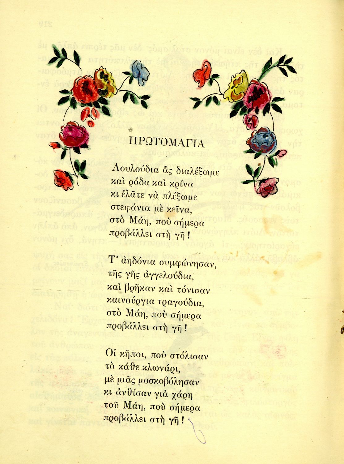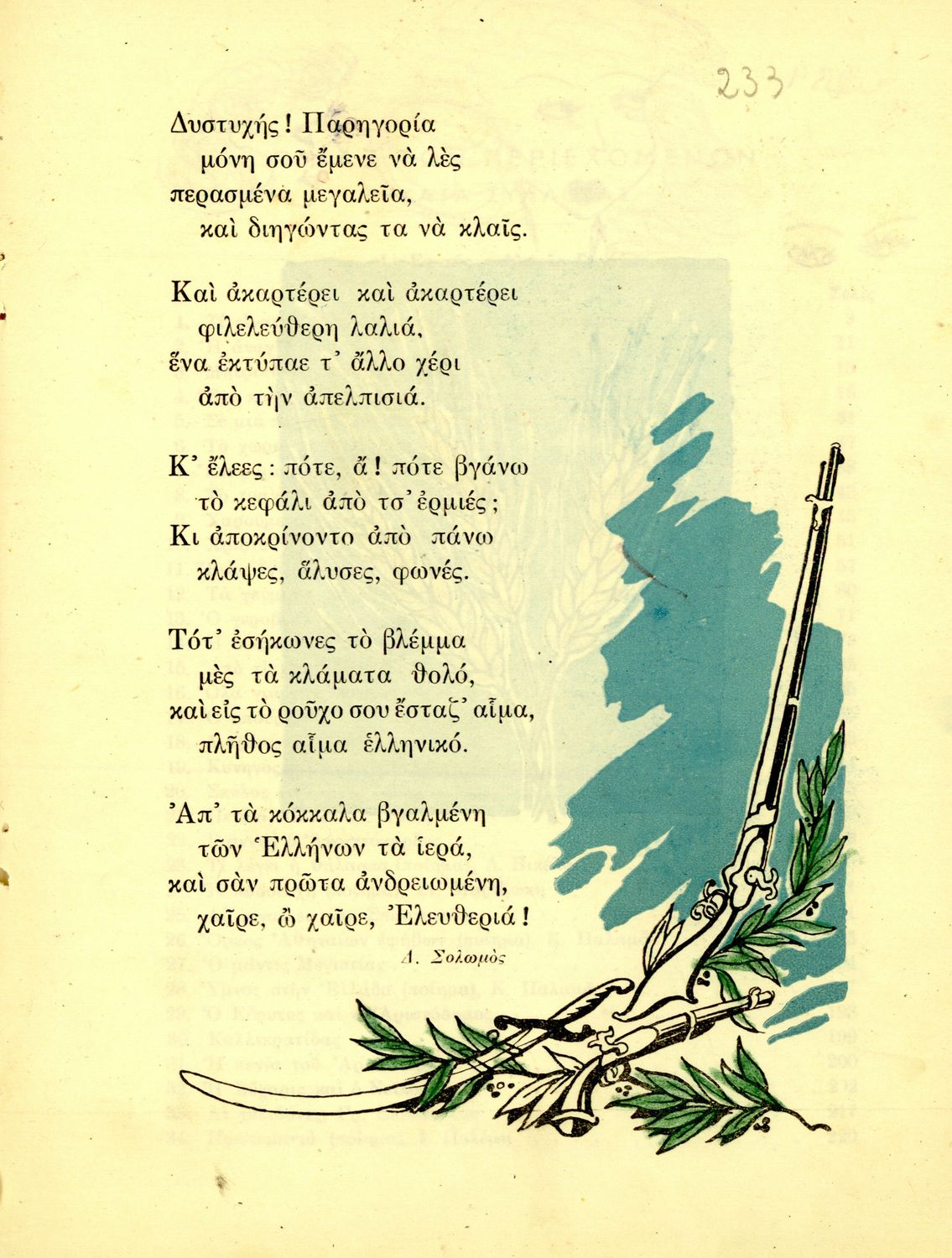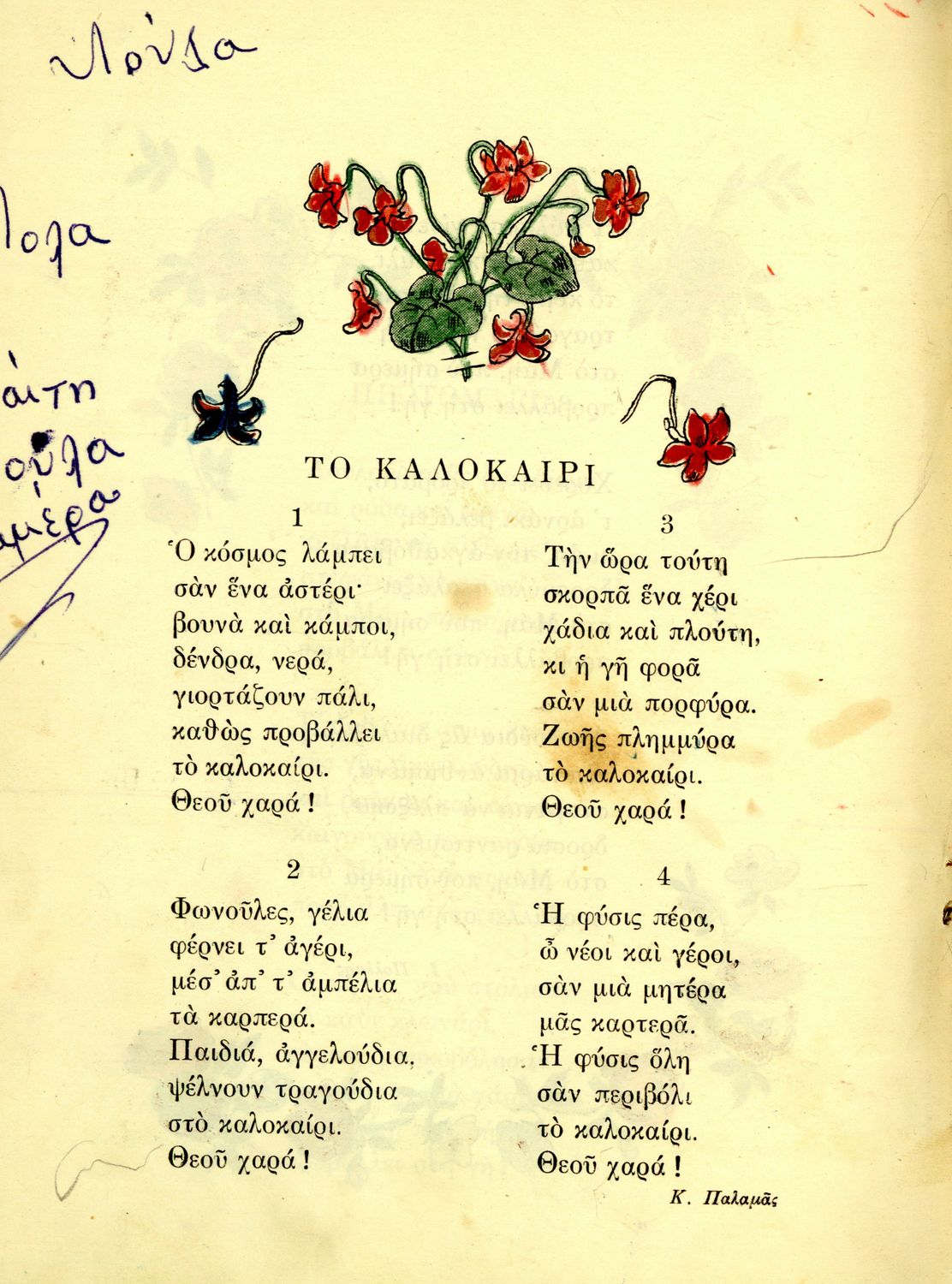 Αναγνωστικό Δ΄ Δημοτικού που περιέχει πεζά και ποιήματα εμπνευσμένα από την ελληνική ιστορία και μυθολογία, την κοινωνική ζωή και την ελληνική φύση.