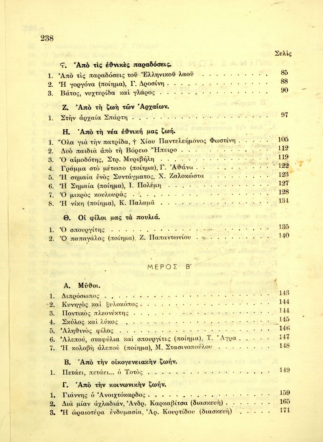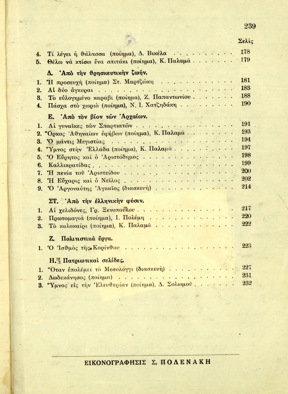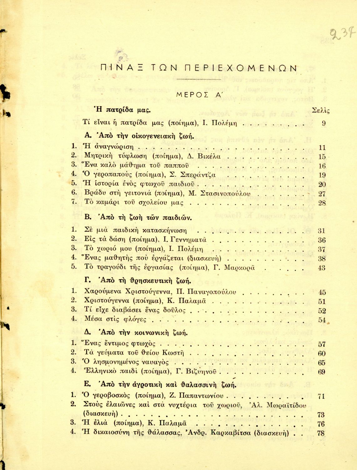 Αναγνωστικό Δ΄ Δημοτικού που περιέχει πεζά και ποιήματα εμπνευσμένα από την ελληνική ιστορία και μυθολογία, την κοινωνική ζωή και την ελληνική φύση.