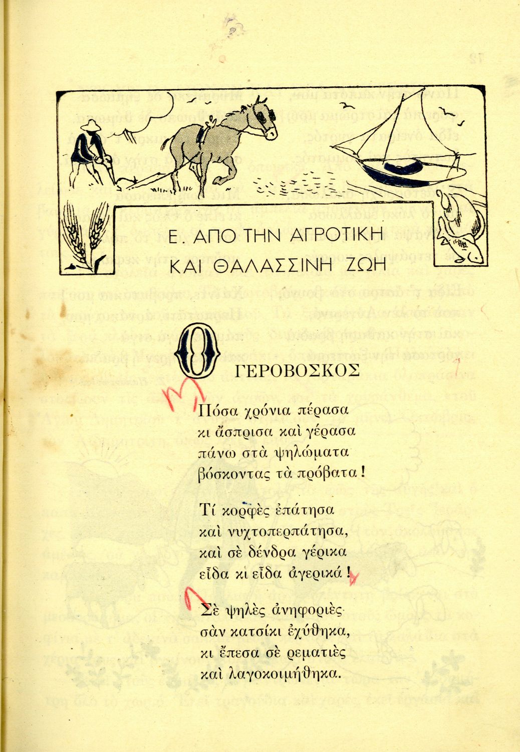 Αναγνωστικό Δ' Δημοτικού που περιλαμβάνει πεζά και ποιήματα Ελλήνων λογοτεχνών εμπνευσμένα από την ζωή στην ύπαιθρο, τις θρησκευτικές και εθνικές γιορτές και την οικογενειακή ζωή.