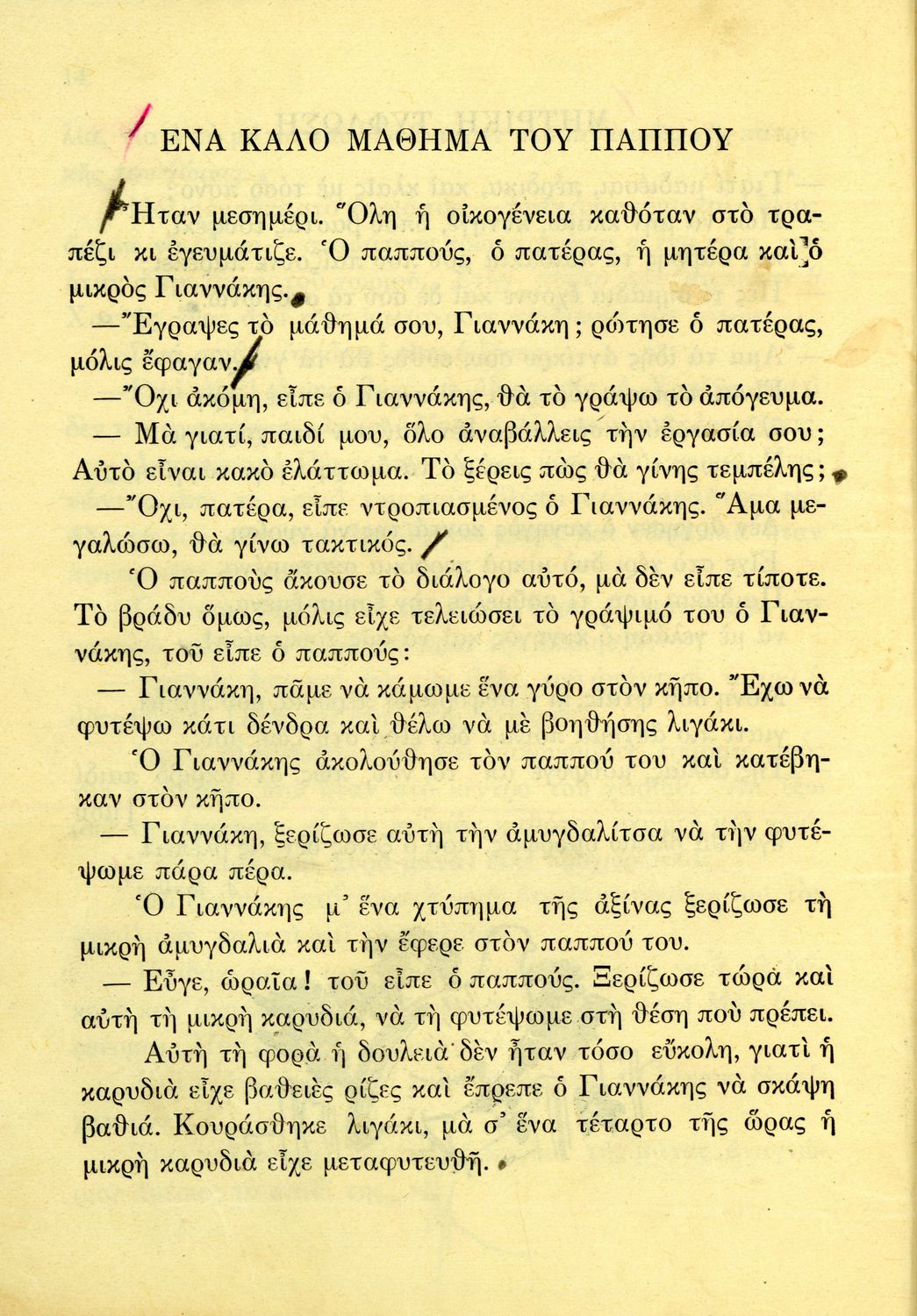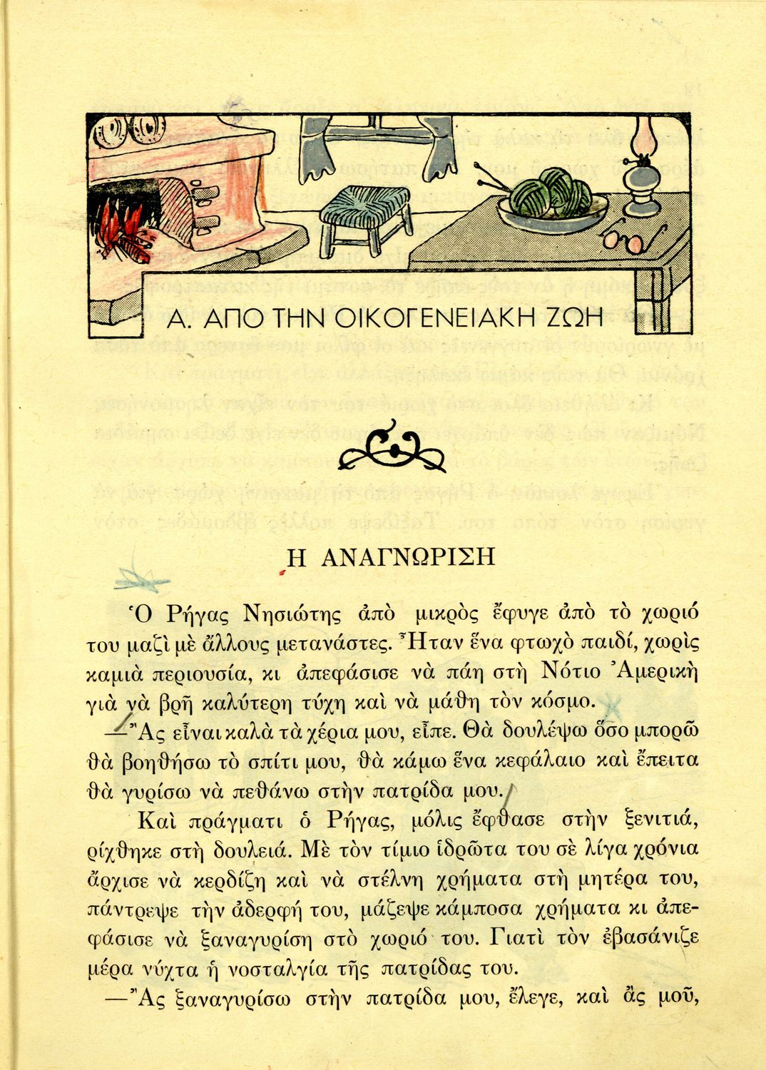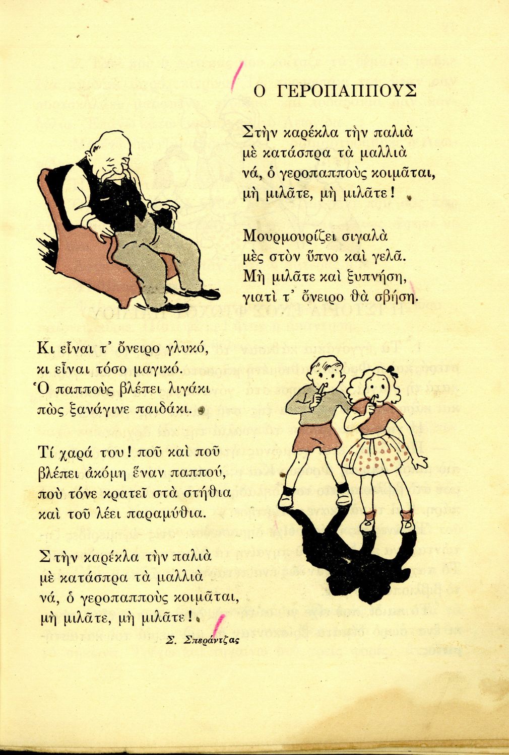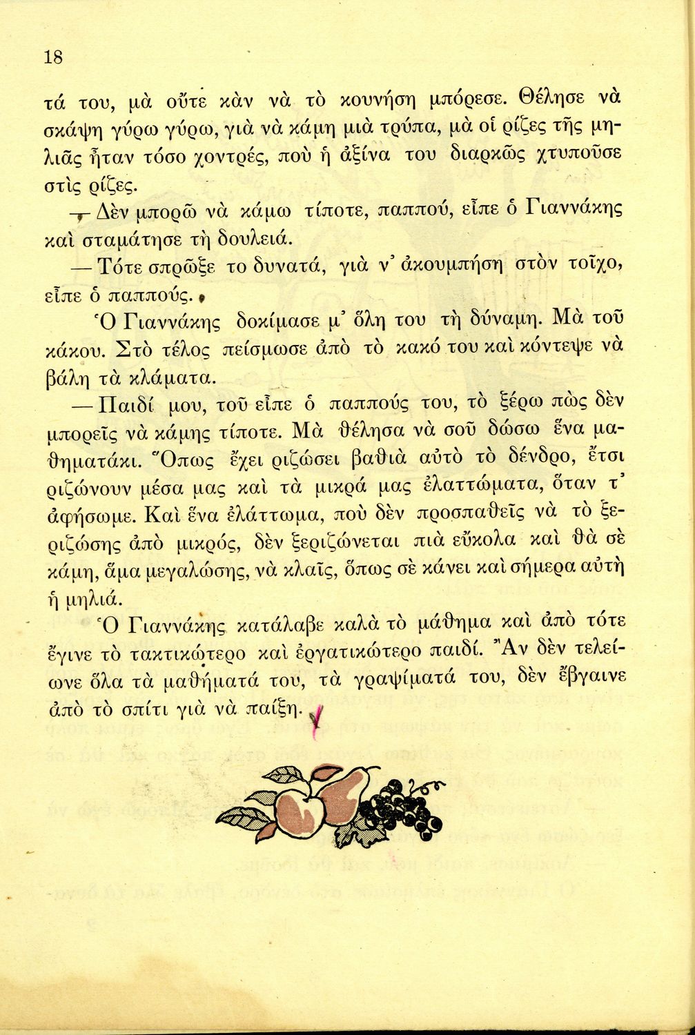 Αναγνωστικό Δ' Δημοτικού που περιλαμβάνει πεζά και ποιήματα Ελλήνων λογοτεχνών εμπνευσμένα από την ζωή στην ύπαιθρο, τις θρησκευτικές και εθνικές γιορτές και την οικογενειακή ζωή.