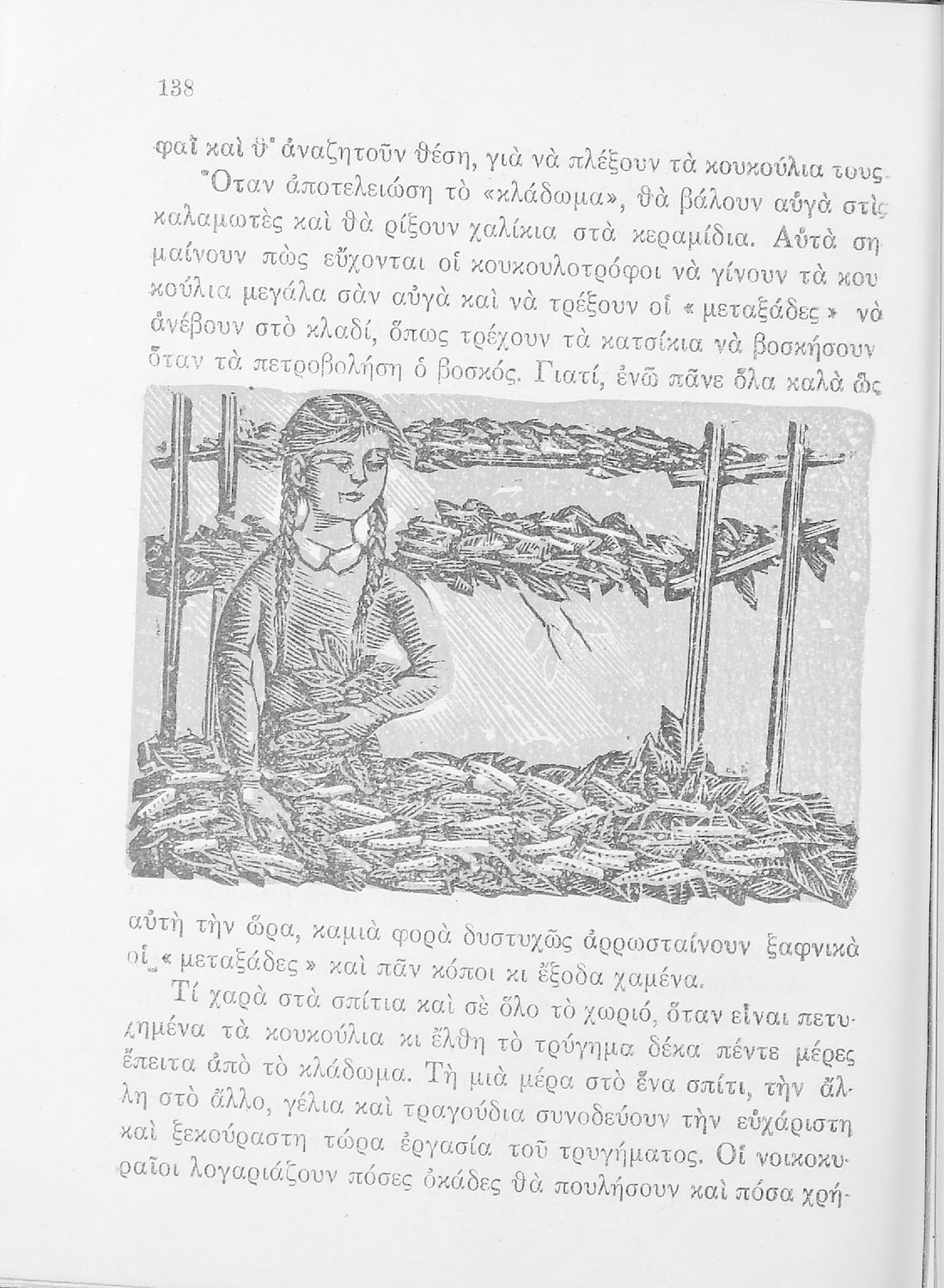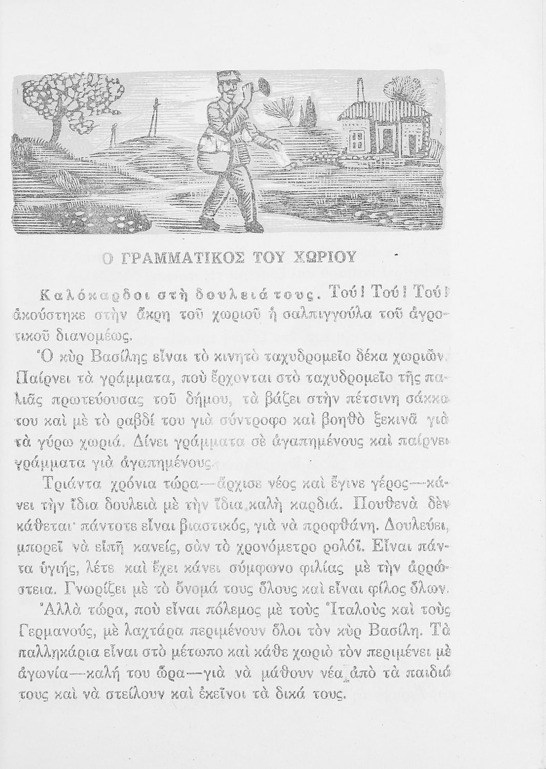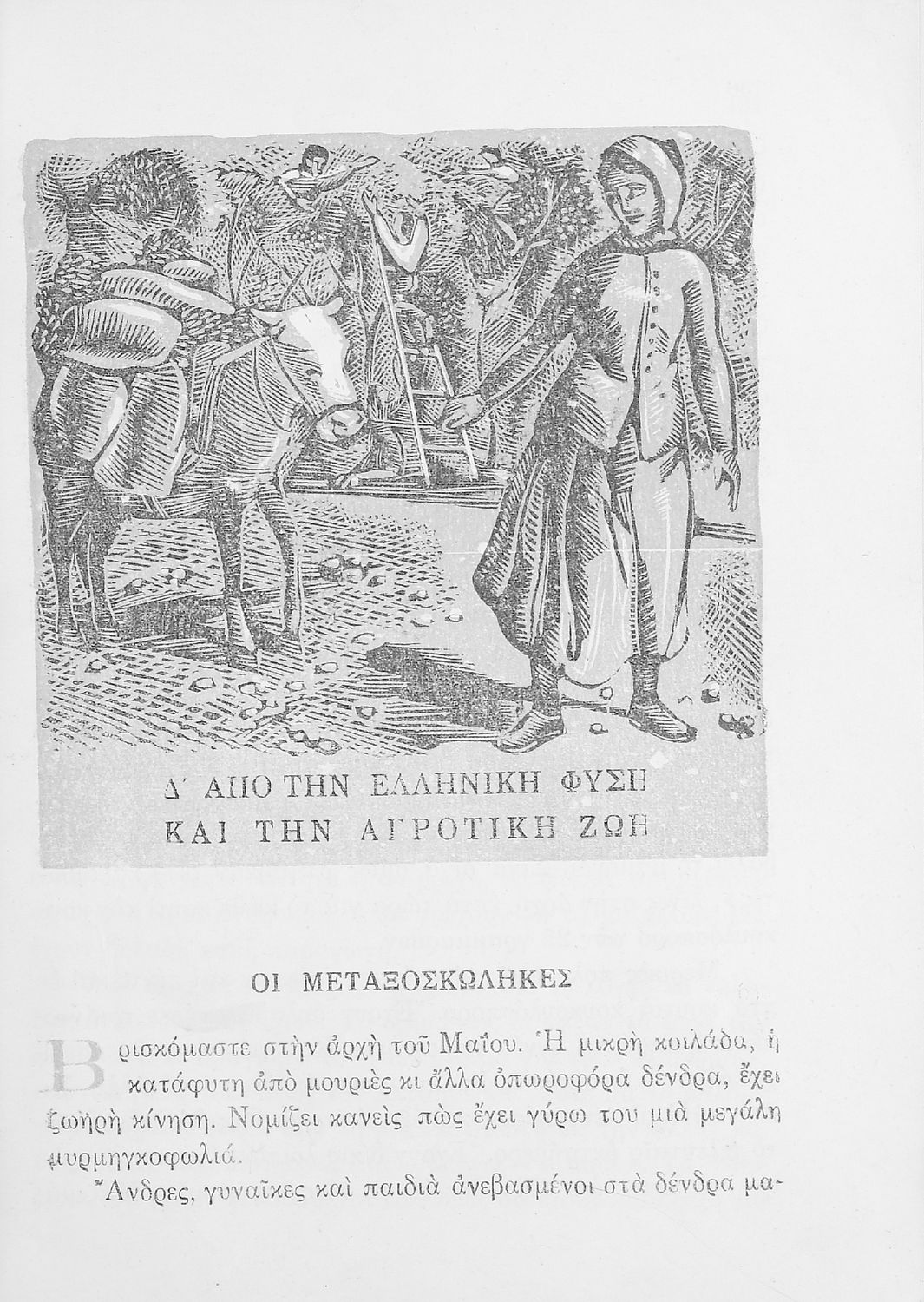 Αναγνωστικό Ε΄ Δημοτικού που περιλαμβάνει πεζογραφήματα εμπνευσμένα από την ελληνική φύση, την αγροτική ζωή και από το τρίπτυχο "Πατρίς- θρησκεία- οικογένεια".