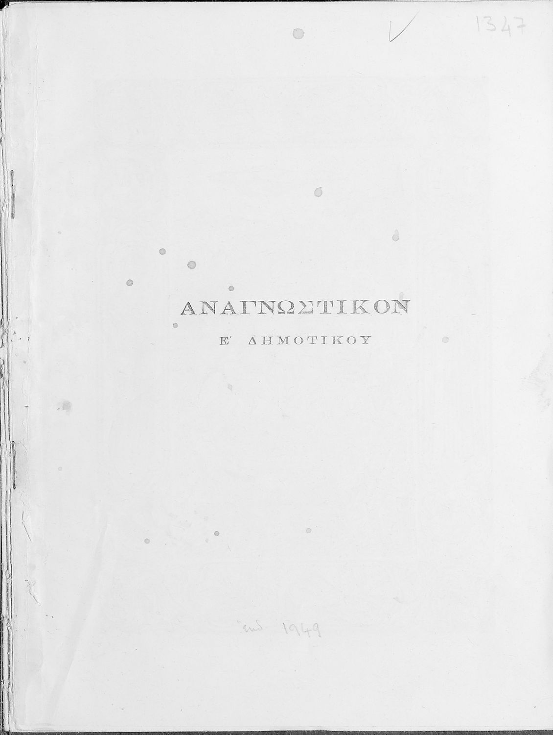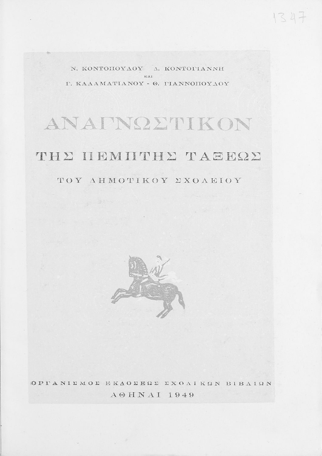 Κωδικός αναγνώρισης: 20-01347 Τίτλος: Αναγνωστικόν της πέμπτης τάξεως του Δημοτικού Σχολείου Συγγραφέας: Ν. Κοντόπουλος, Δ. Κοντογιάννης, Γ. Καλαματιανός, Θ. Γιαννόπουλος Εικονογράφος: Σπύρος Βασιλείου Μέγεθος και υπόστρωμα: Σχολικό εγχειρίδιο, 19εκ., μαλακό εξώφυλλο, 256 σελίδες. Σκίτσα (ασπρόμαυρα και έγχρωμα). |