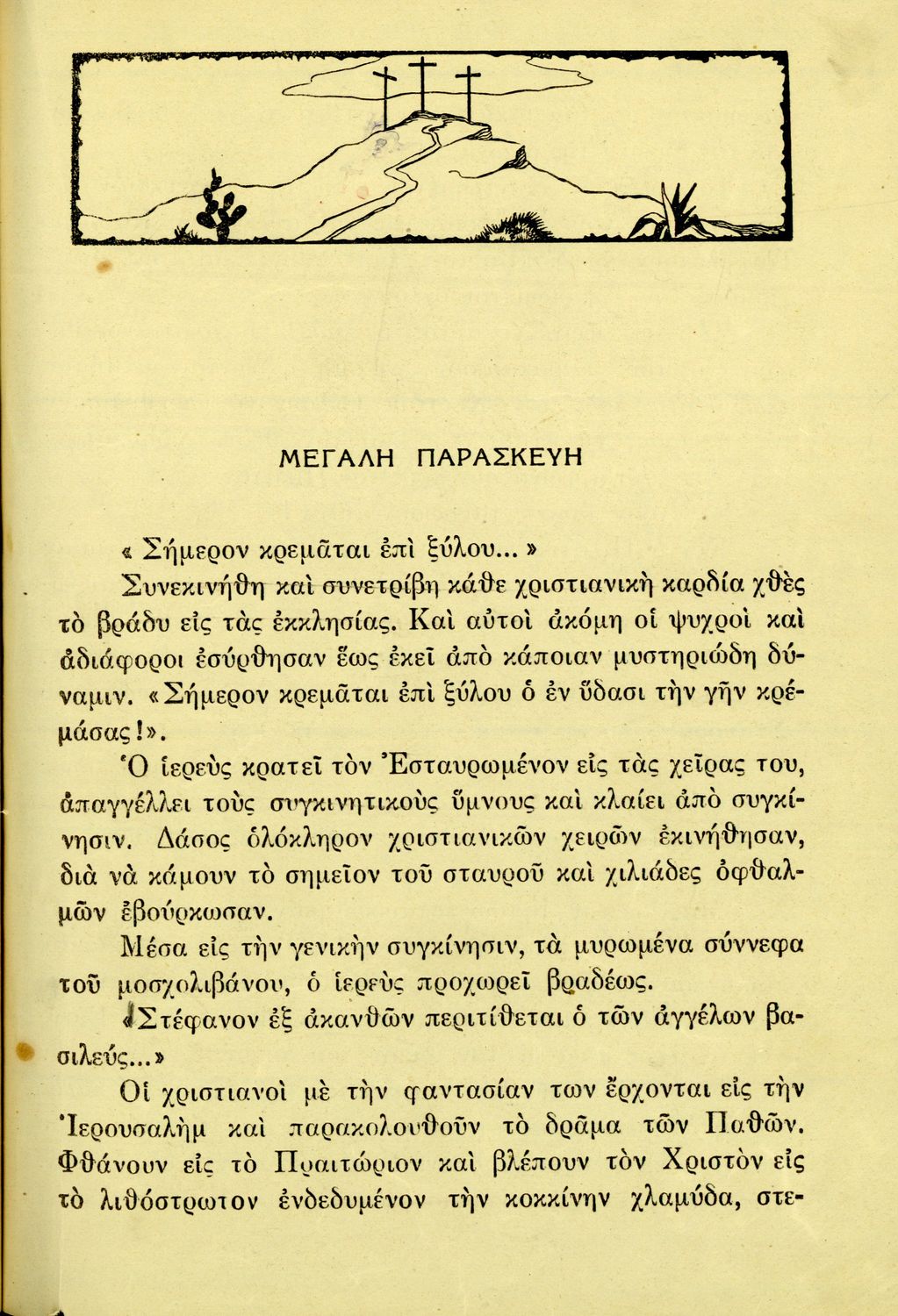 Αναγνωστικό ΣΤ΄ Δημοτικού που περιλαμβάνει πεζά και ποιήματα εμπνευσμένα από τη θρησκευτική, εθνική, οικογενειακή και κοινωνική ζωή, και την ελληνική φύση.