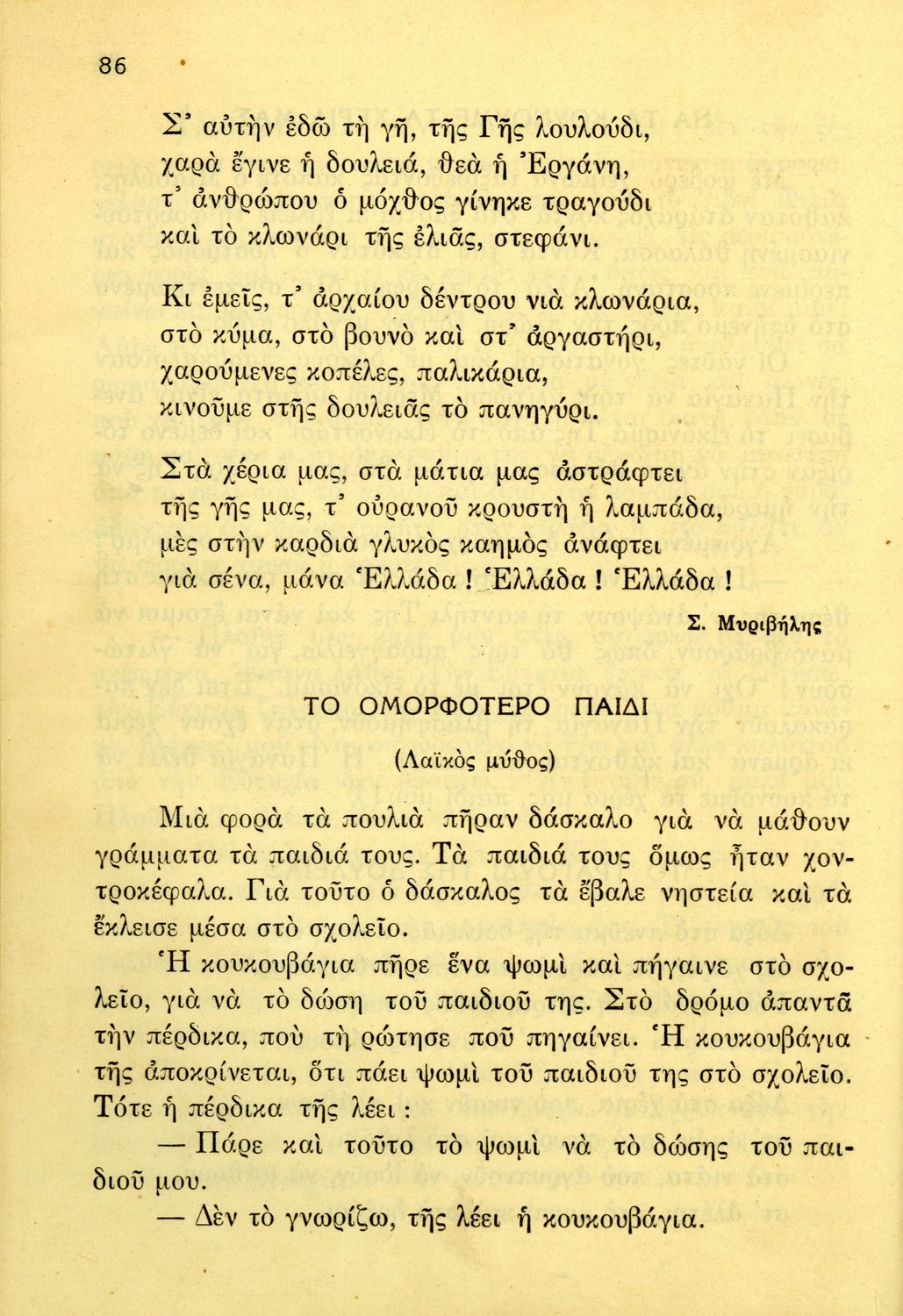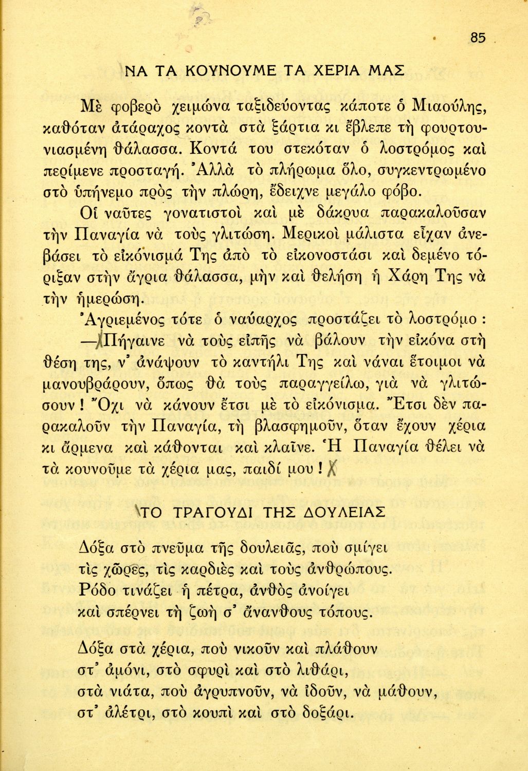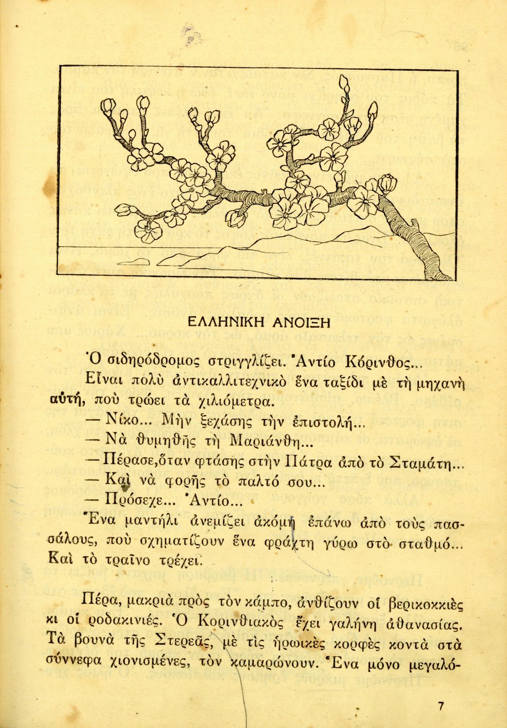 Αναγνωστικό ΣΤ΄ Δημοτικού που περιλαμβάνει πεζά και ποιήματα εμπνευσμένα από τη θρησκευτική, εθνική, οικογενειακή και κοινωνική ζωή, και την ελληνική φύση.