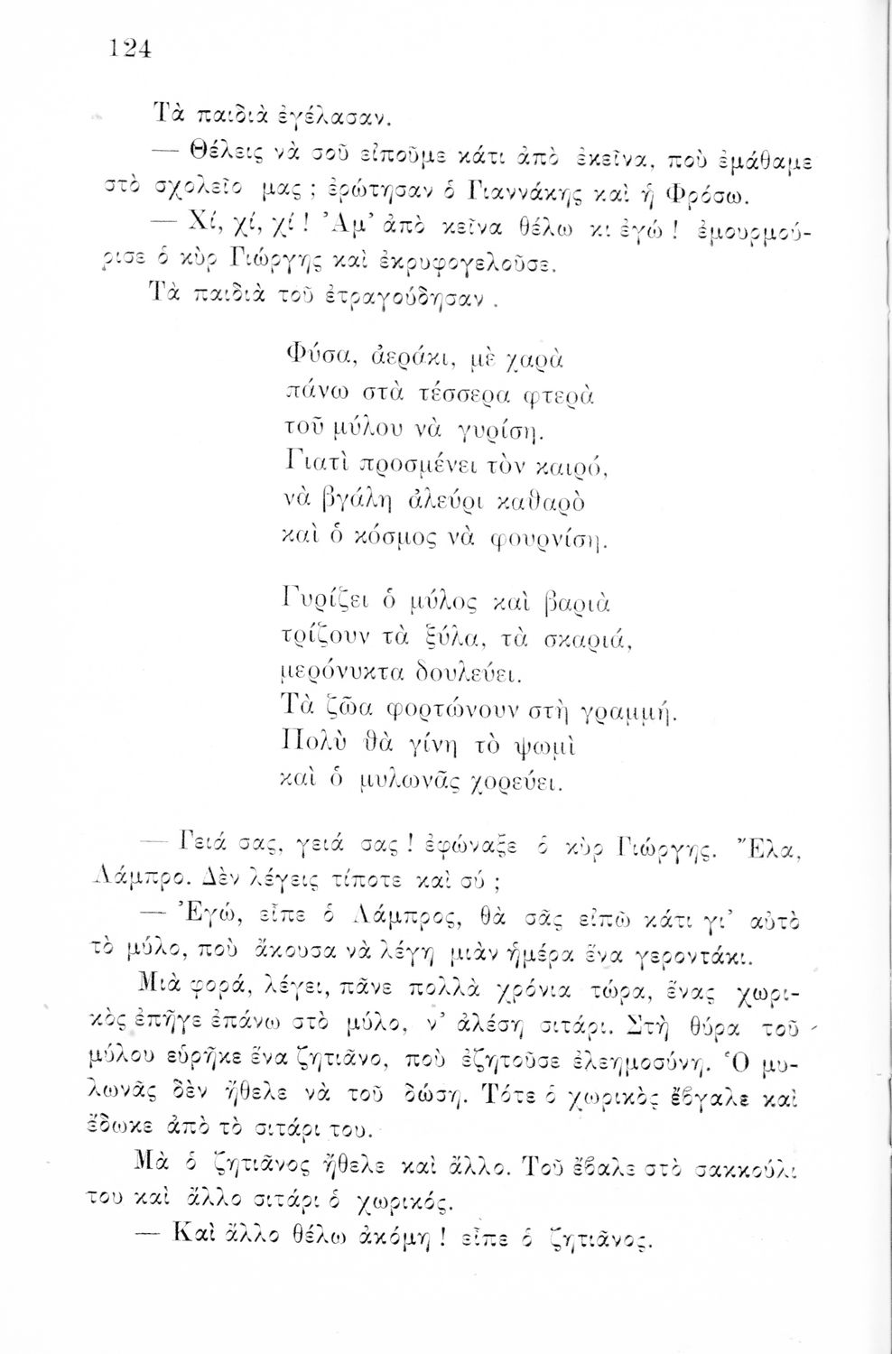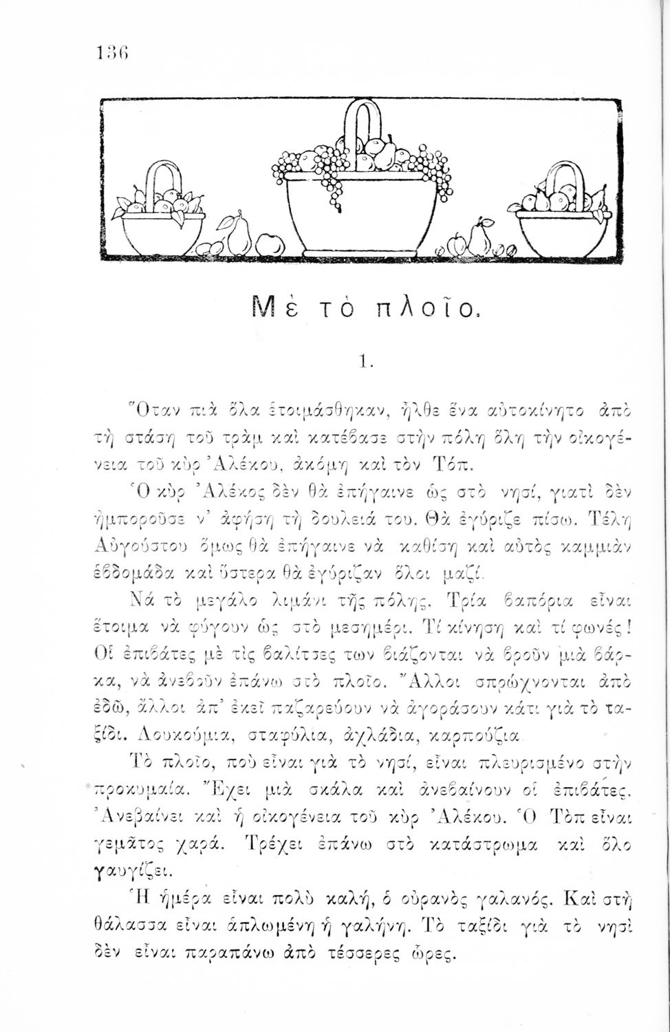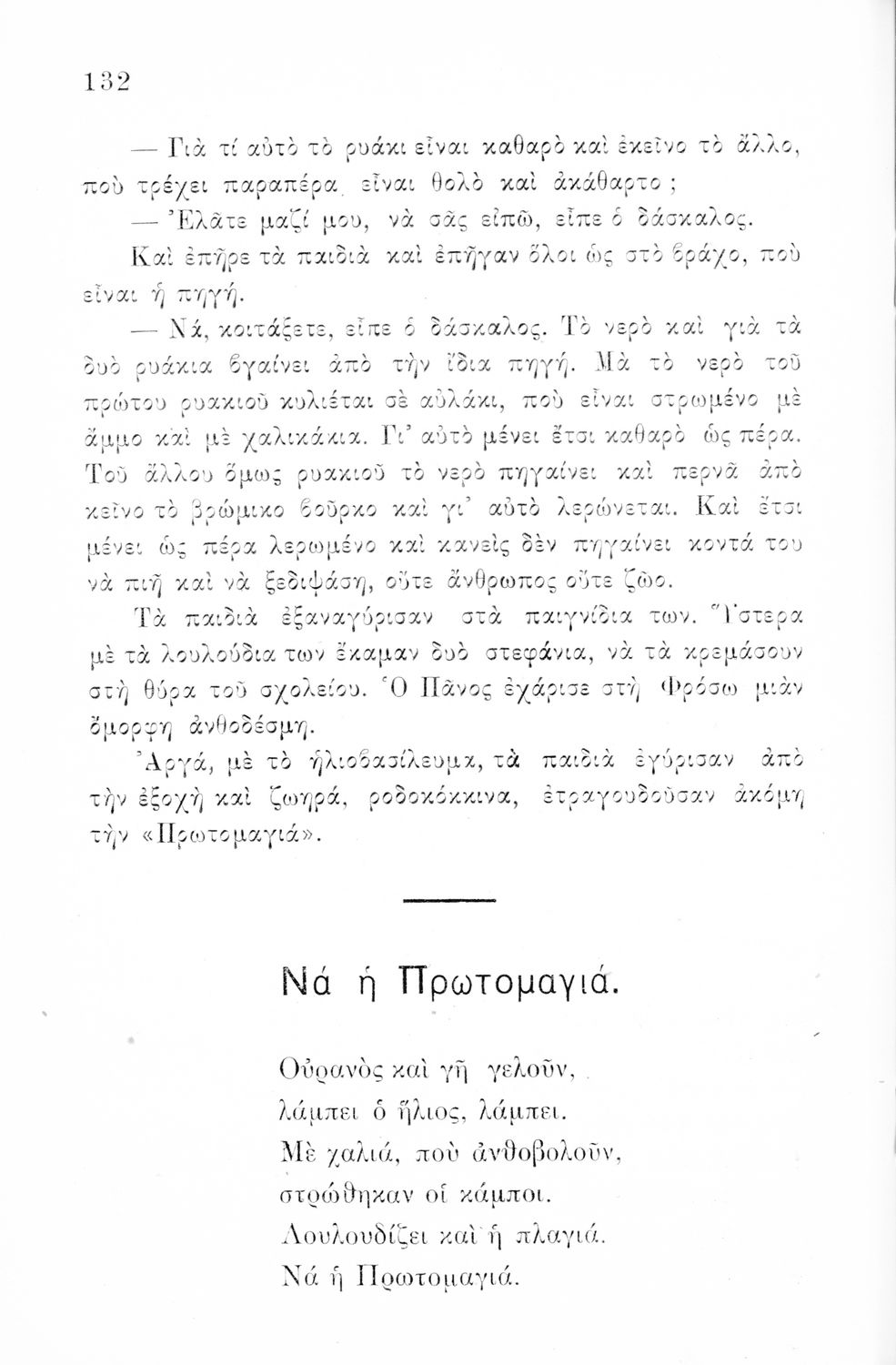 520 ## _aΑναγνωστικό Β΄ Δημοτικού που περιλαμβάνει πεζογραφήματα και ποιήματα από την οικογενειακή και την κοινωνική ζωή των παιδιών, από την ελληνική ύπαιθρο, από τις ελληνικές εορτές και από τις 4 εποχές του χρόνου. Διαφοροποιείται αισθητά από τα βιβλία της επόμενης περιόδου που εμμένουν αρκετά στο τρίπτυχο "Πατρίς-θρησκεία-οικογένεια".
